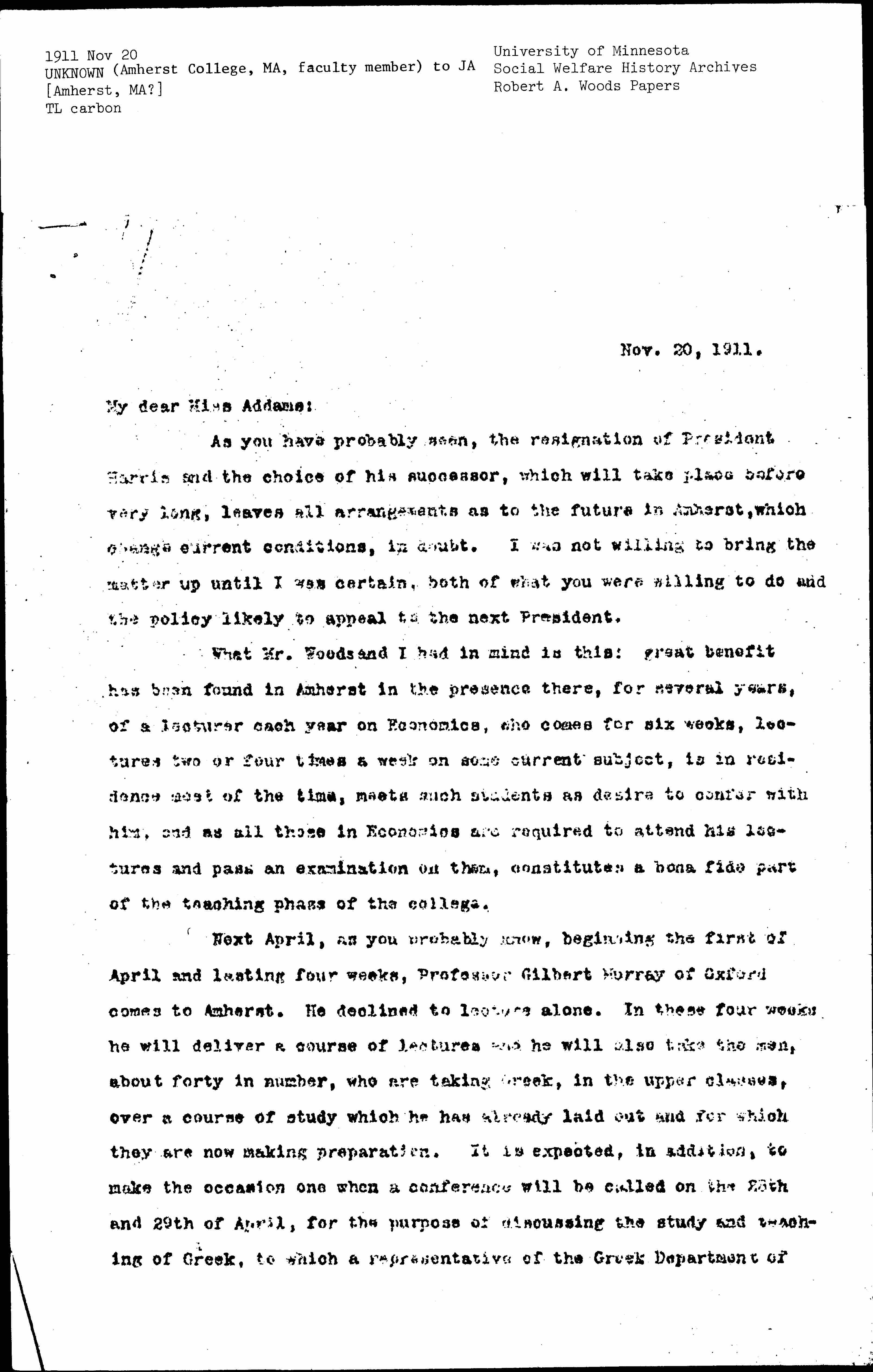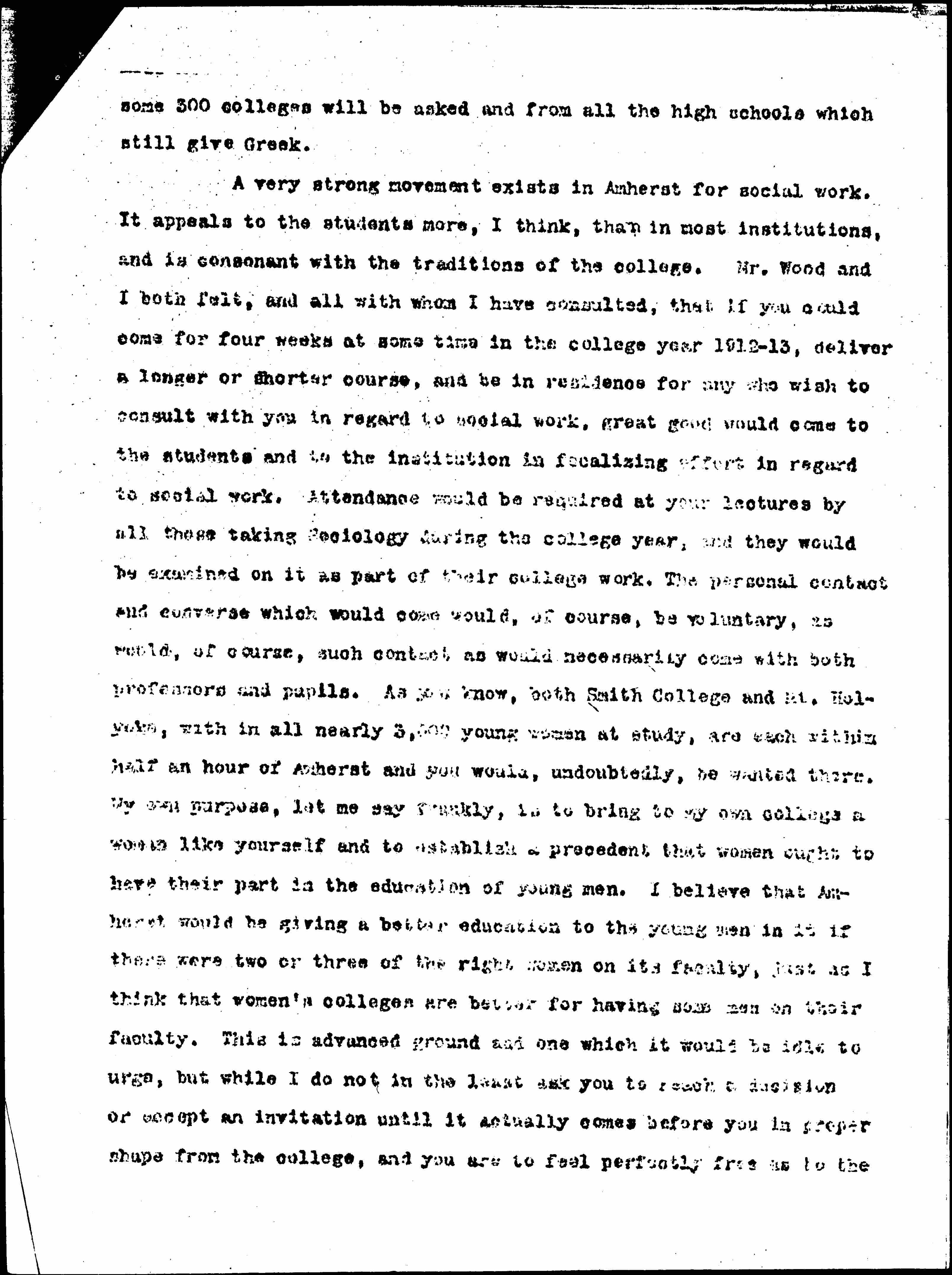 A very strong movement exists in Amherst for social work. It appeals to the students more, I think, than in most institutions, and is consonant with the traditions of the college. Mr. Wood and I both felt, and all with whom I have consulted, that if you could come for four weeks at some time in the college year 1912-13, deliver a longer or shorter course, and be in residences for any who wish to consult with you in regard to social work, great good would come to the students and to the institution in focalizing effort in regard to social work. Attendance would be required at your lectures by all those taking Sociology during the college year, and they would be examined on it as part of their college work. The personal contact and converse which would come would, of course, be voluntary, as would, of course, such contact as would necessarily come with both professors and pupils. As you know, both Smith College and Mt. Holyoke, with in all nearly 3,000 young women at study, are each within half an hour of Amherst and you would, undoubtedly, be wanted there. My own purpose, let me say frankly, is to bring to my own college a woman like yourself and to establish a precedent that women ought to have their part in the education of young men. I believe that Amherst would be giving a better education to the young men in it if there were two or three of the right women on its faculty, just as I think that women's colleges are better for having some men on their faculty. This is advanced ground and one which it would be idle to urge, but while I do not in the least ask you to reach a decision or accept an invitation until it actually comes before you in proper shape from the college, and you are to feel perfectly free as to the [page 3] many factors which must necessarily work in reaching a conclusion, when the actual plea is laid before you, I am entering into all these details so that you may understand exactly what is wanted and would be able now to say that you could not come at all, if, after those details are brought out, you look favorably on the plan.