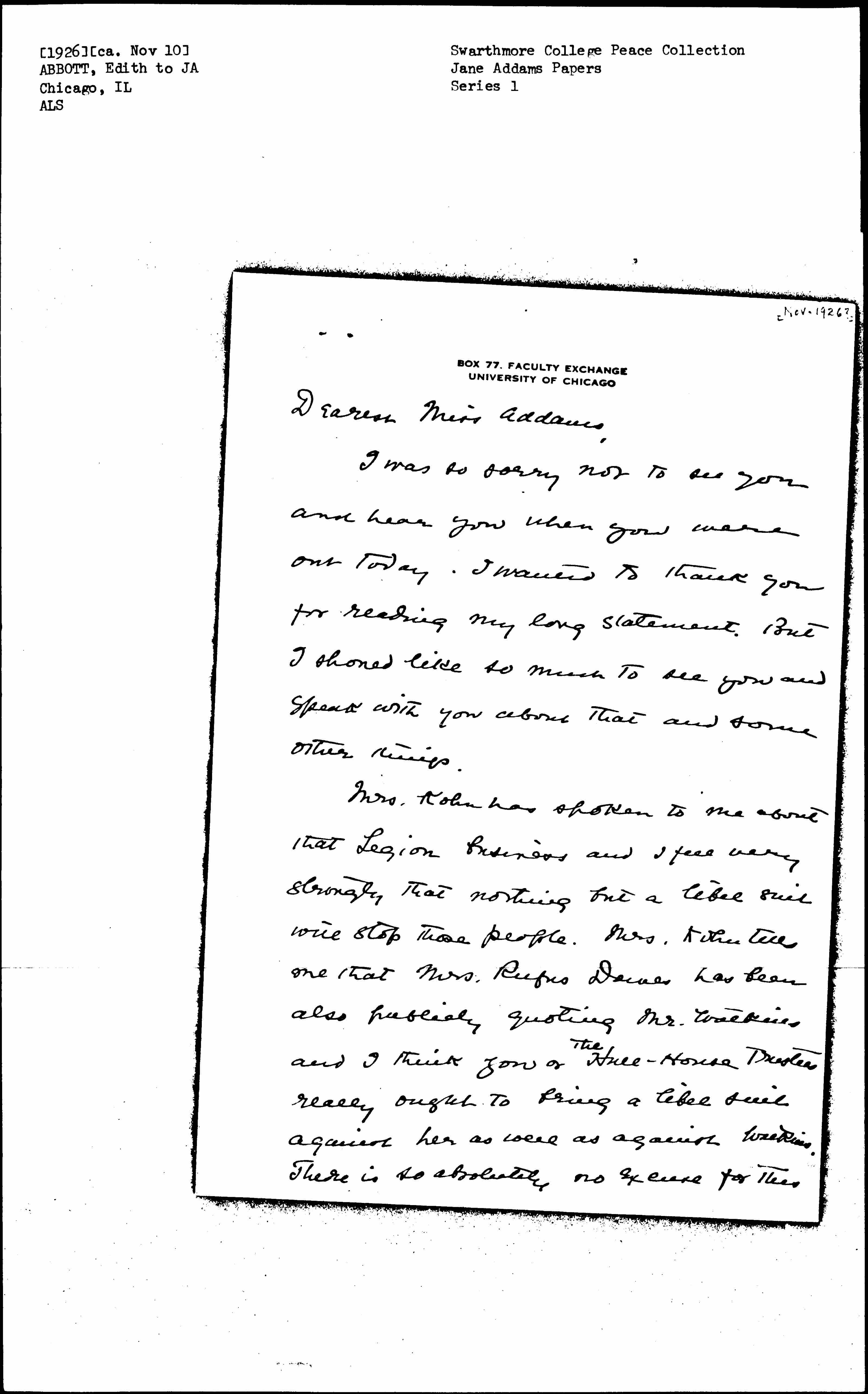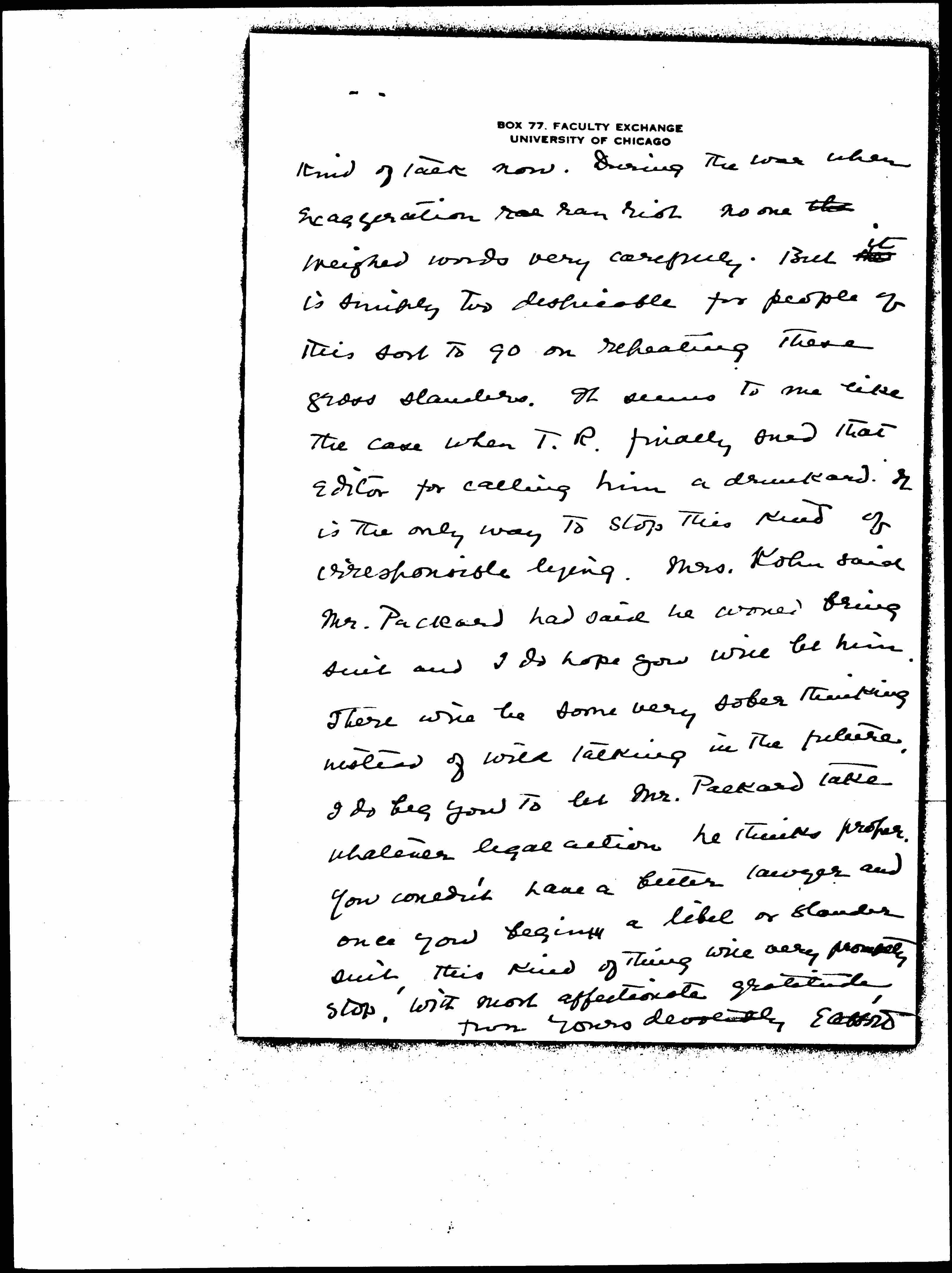 Mrs. Kohn has spoken to me about that Legion business and I feel very strongly that nothing but a libel suit will stop those people. Mrs. Kohn tells me that Mrs. Rufus Dawes has been also publicly quoting Mr. Watkins and I think you or ↑the↓ Hull-House Trustees really ought to bring a libel suit against her as well as against Watkins. There is so absolutely no excuse for the [page 2] kind of talk now. During the war when exaggeration ran ran high no one the weighed words very carefully. But the ↑it↓ it is simply too despicable for people of this sort to go on repeating these gross slanders. It seems to me like the case when T. R. finally sued that editor for calling him a drunkard. It is the only way to stop this kind of irresponsible lying. Mrs. Kohn said Mr. Packard had said he would bring suit and I do hope you will let him. There will be some very sober thinking instead of wild talking in the future. I do beg you to let Mr. Packard take whatever legal action he thinks proper. You couldn't have a better lawyer and once you begin a libel or slander suit, this kind of thing will very promptly stop. With most affectionate gratitude,