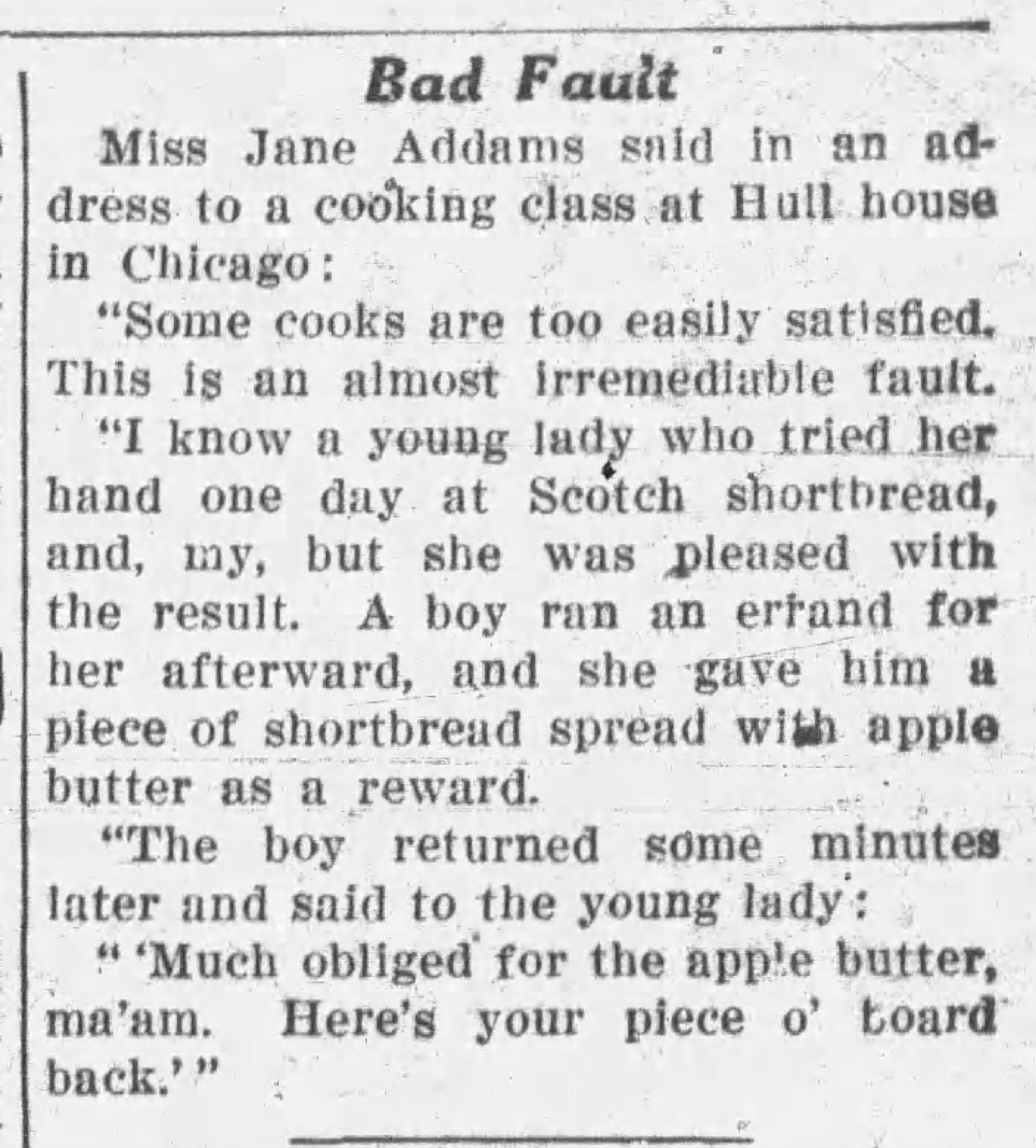 Miss Jane Addams said in an address to a cooking class at Hull House in Chicago: