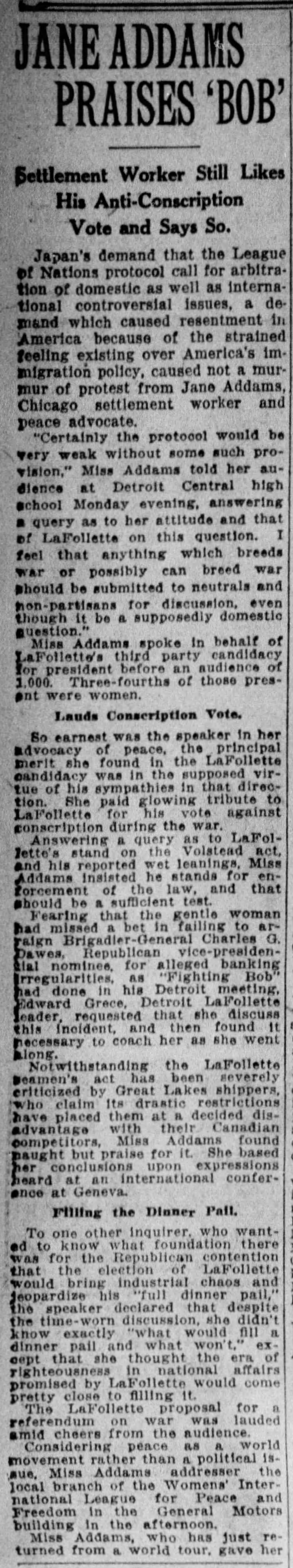 So earnest was the speaker in her advocacy of peace, the principal merit she found in the La Follette candidacy was in the supposed virtue of sympathies in that direction. She paid glowing tribute to La Follette for his vote against conscription during the war.