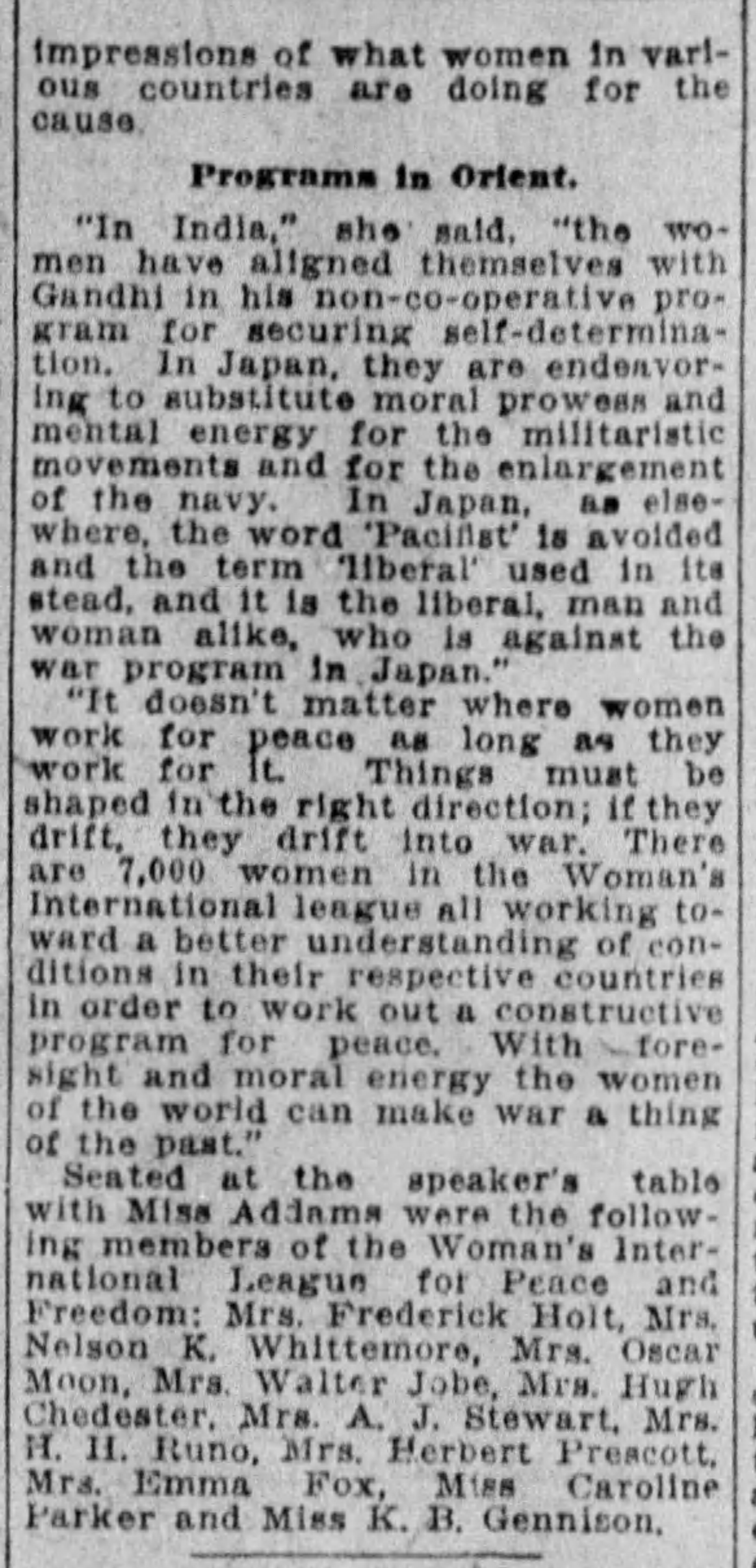 "In India," she said, "the women have aligned themselves with Gandhi in his [noncooperative] program for securing self-determination. In Japan, they are endeavoring to substitute moral prowess and mental energy for the militaristic movements and for the enlargement of the navy. In Japan, as elsewhere, the word 'Pacifist' is avoided and the term 'liberal' used in its stead, and it is the liberal, man and woman alike, who is against the war program in Japan."