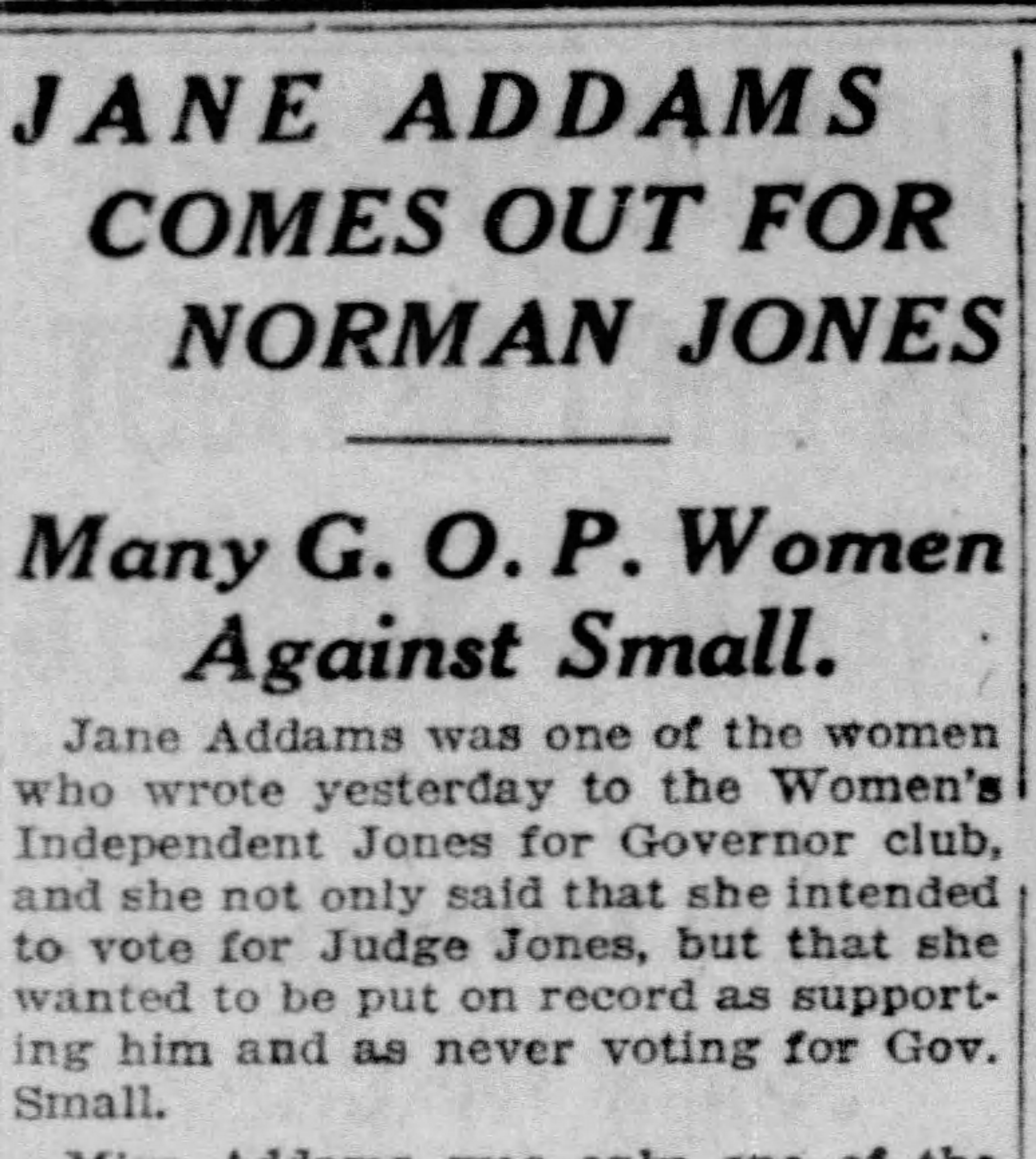 Jane Addams was one of the women who wrote yesterday to the Women's Independent Jones for Governor Club, and she not only said that she intended to vote for Judge Jones, but that she wanted to be put on record as supporting him and as never voting for Gov. Small.