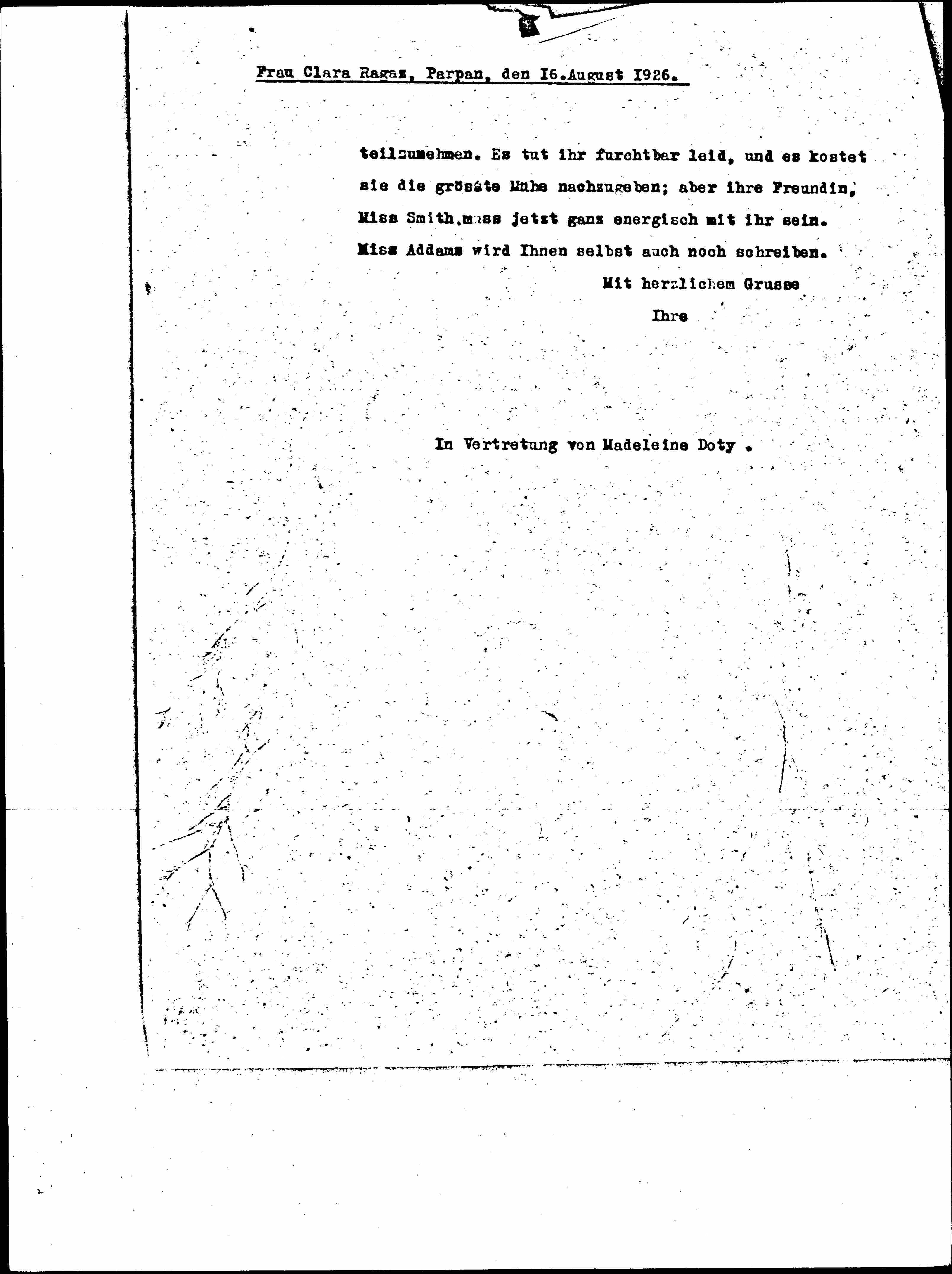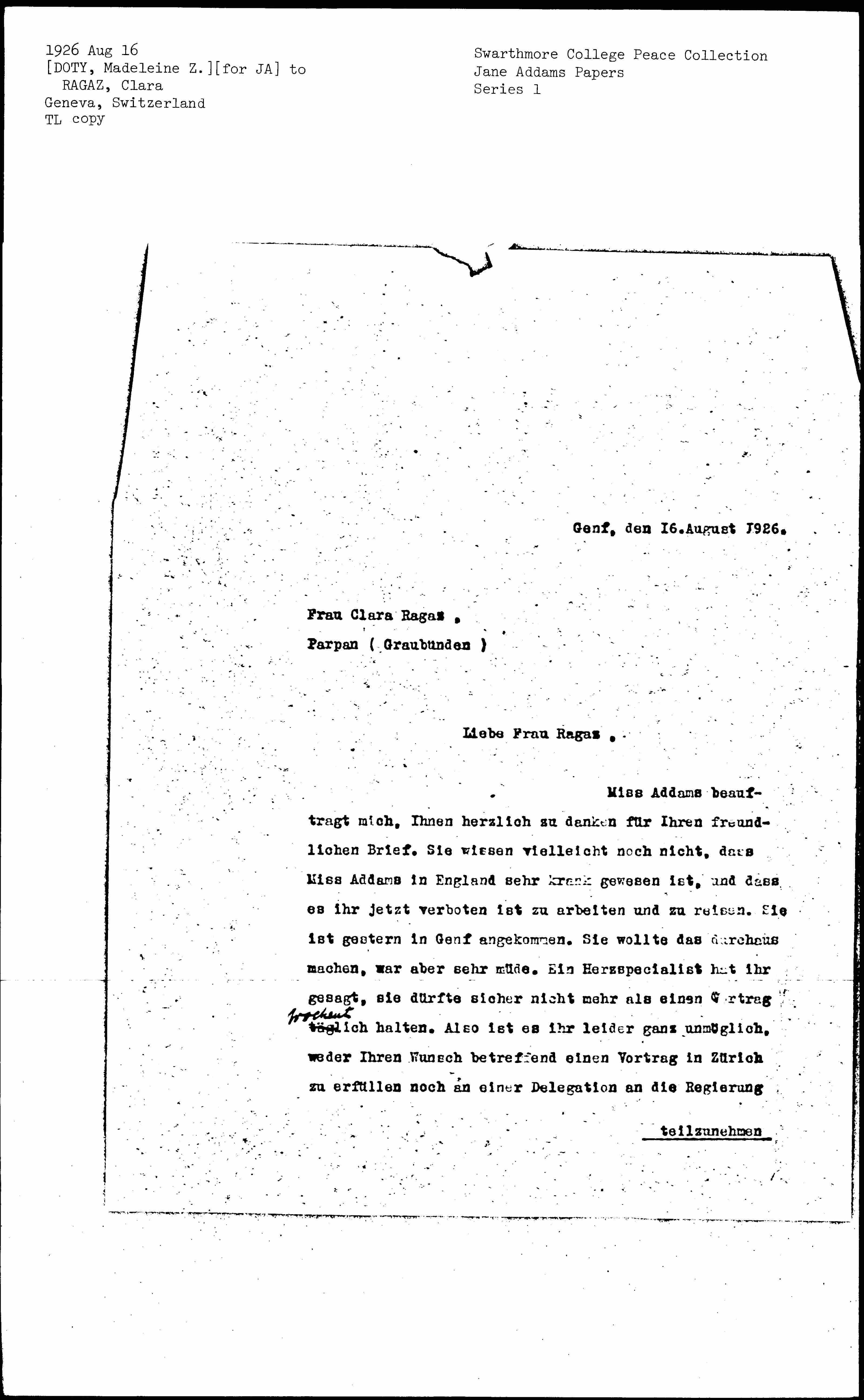Miss Addams asked me to send you heartfelt thanks for your kind letter. You may not know that Miss Addams was very ill in England and is now forbidden to work and travel. She arrived in Geneva yesterday. She really wanted to do it, but was very tired. A cardiologist told her not to give more than one lecture per day/per week/. So it is unfortunately quite impossible for her either fulfil your wish for a lecture in Zurich or to participate in a delegation to the [page 2] government