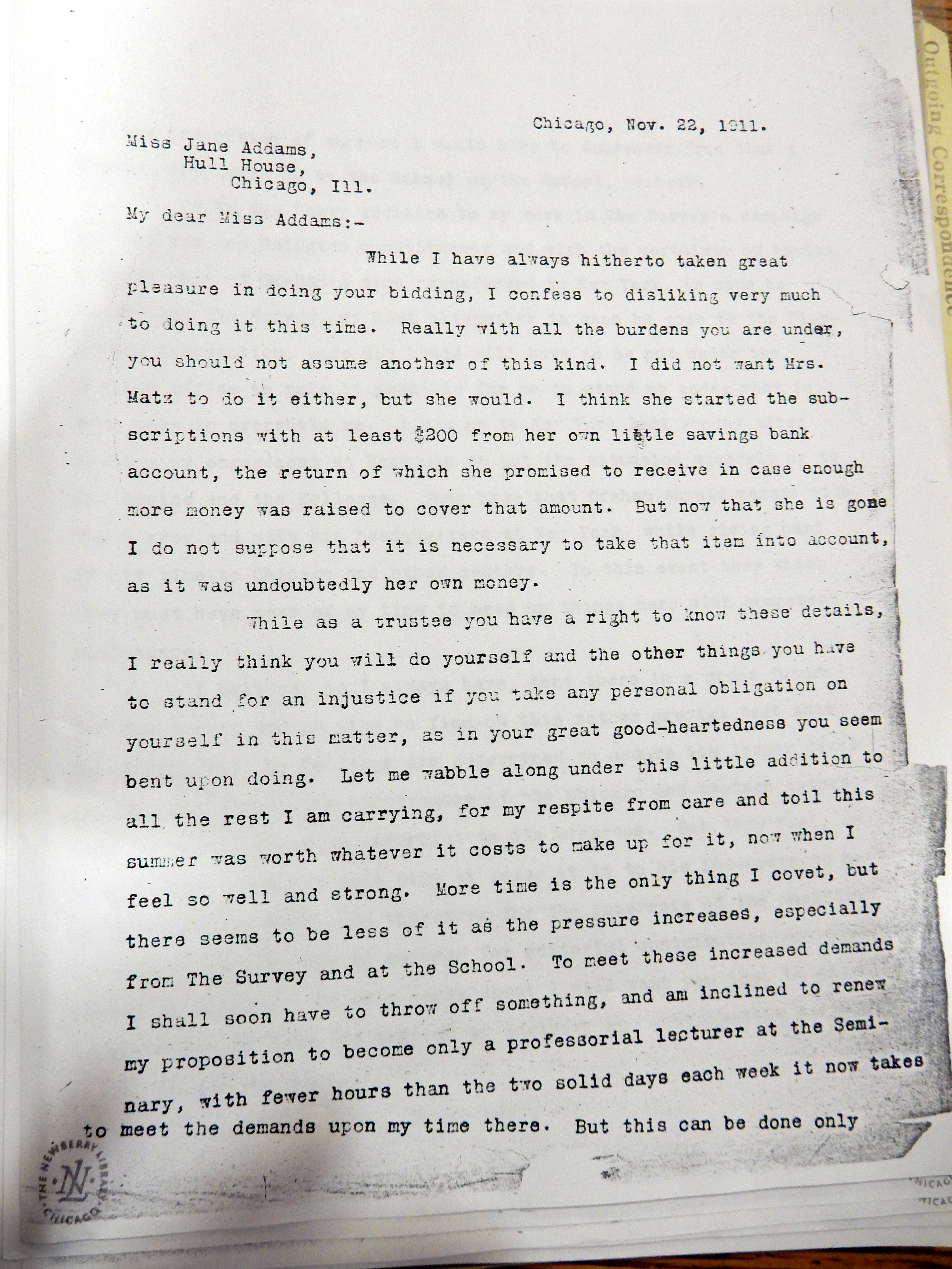 While as a trustee you have a right to know these details, I really think you will do yourself and the other things you have to stand for an injustice if you take any personal obligation on yourself in this matter, as in your great good-heartedness you seem bent upon doing. Let me wabble along under this little addition to all the rest I am carrying, for my respite from care and toil this summer was worth whatever it costs to make up for it, now when I feel so well and strong. More time is the only thing I covet, but there seems to be less of it as the pressure increases, especially from The Survey and at the School. To meet these increased demands I shall soon have to throw off something, and am inclined to renew my proposition to become only a professorial lecturer at the Seminary, with fewer hours than the two solid days each week it now takes to meet the demands upon my time there. But this can be done only [page 2] if the proportion of support I would have to surrender from that a source were taken up by The Survey or the School, or both.