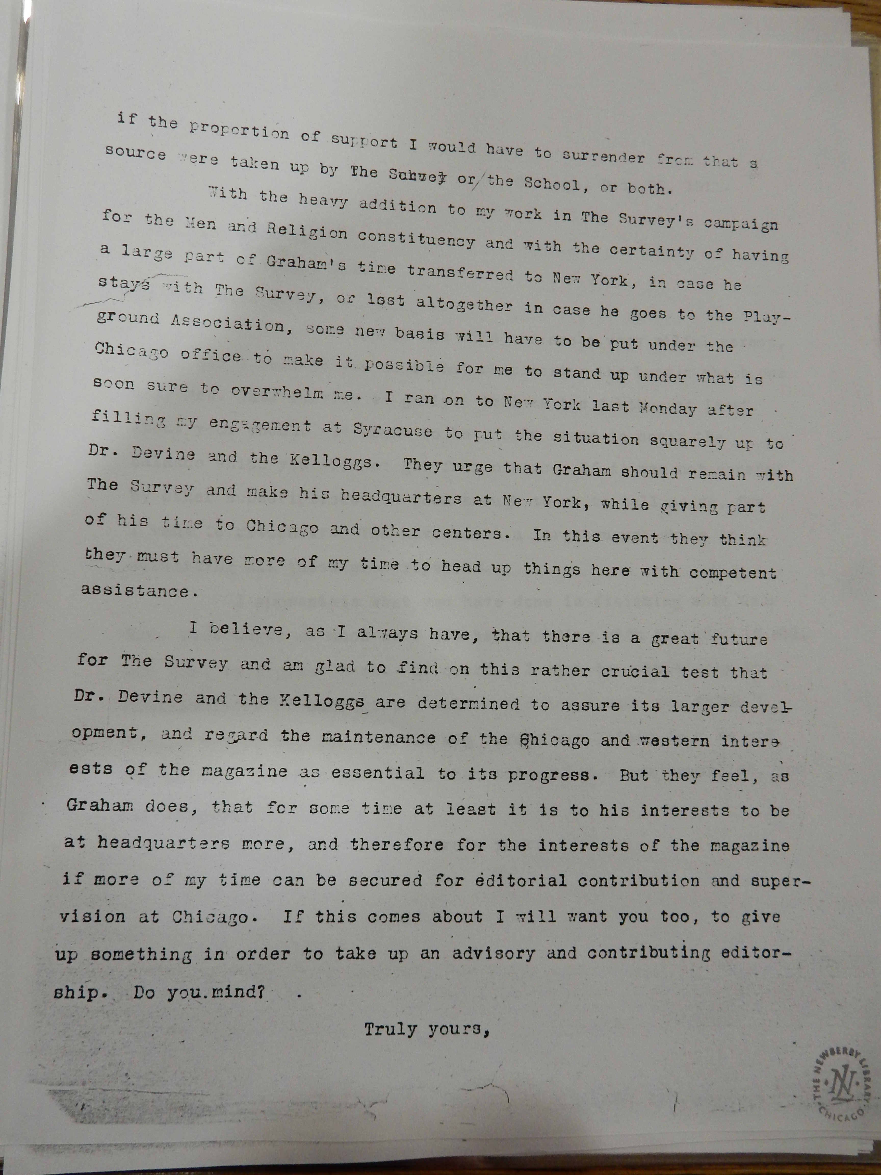 I believe, as I always have, that there is a great future for The Survey and am glad to find on this rather crucial test that Dr. Devine and the Kelloggs are determined to assure its larger development, and regard the maintenance of the Chicago and western interests of the magazine as essential to its progress. But they feel, as Graham does, that for some time at least it is to his interests to be at headquarters more, and therefore for the interests of the magazine if more of my time can be secured for editorial contribution and supervision at Chicago. If this comes about I will want you too, to give up something in order to take up an advisory and contributing editorship. Do you mind?