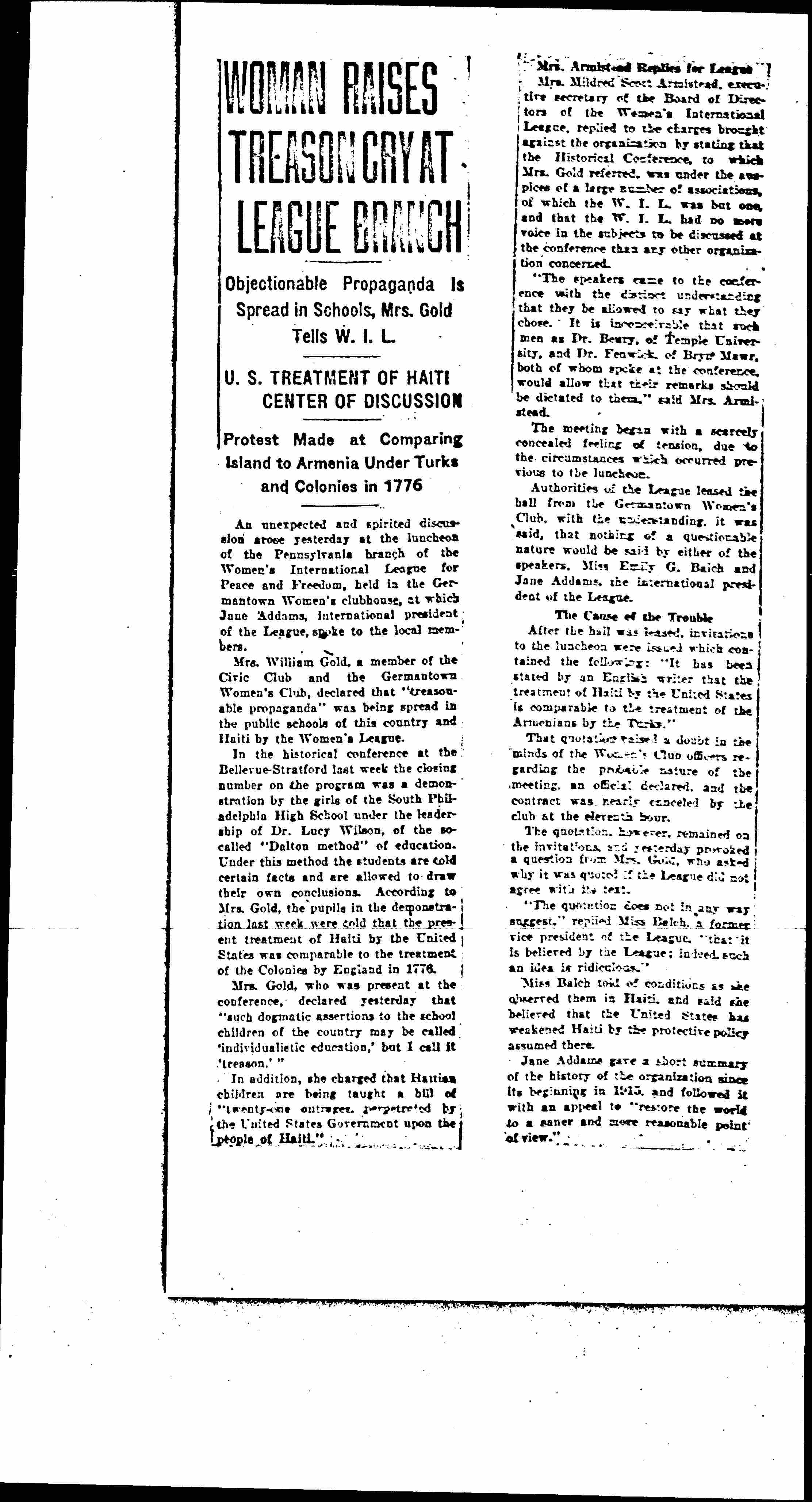 Mrs. William Gold, a member of the Civic Club and the Germantown Women's Club, declared that "treasonable propaganda" was being spread in the public schools of this country and Haiti by the Women's League.