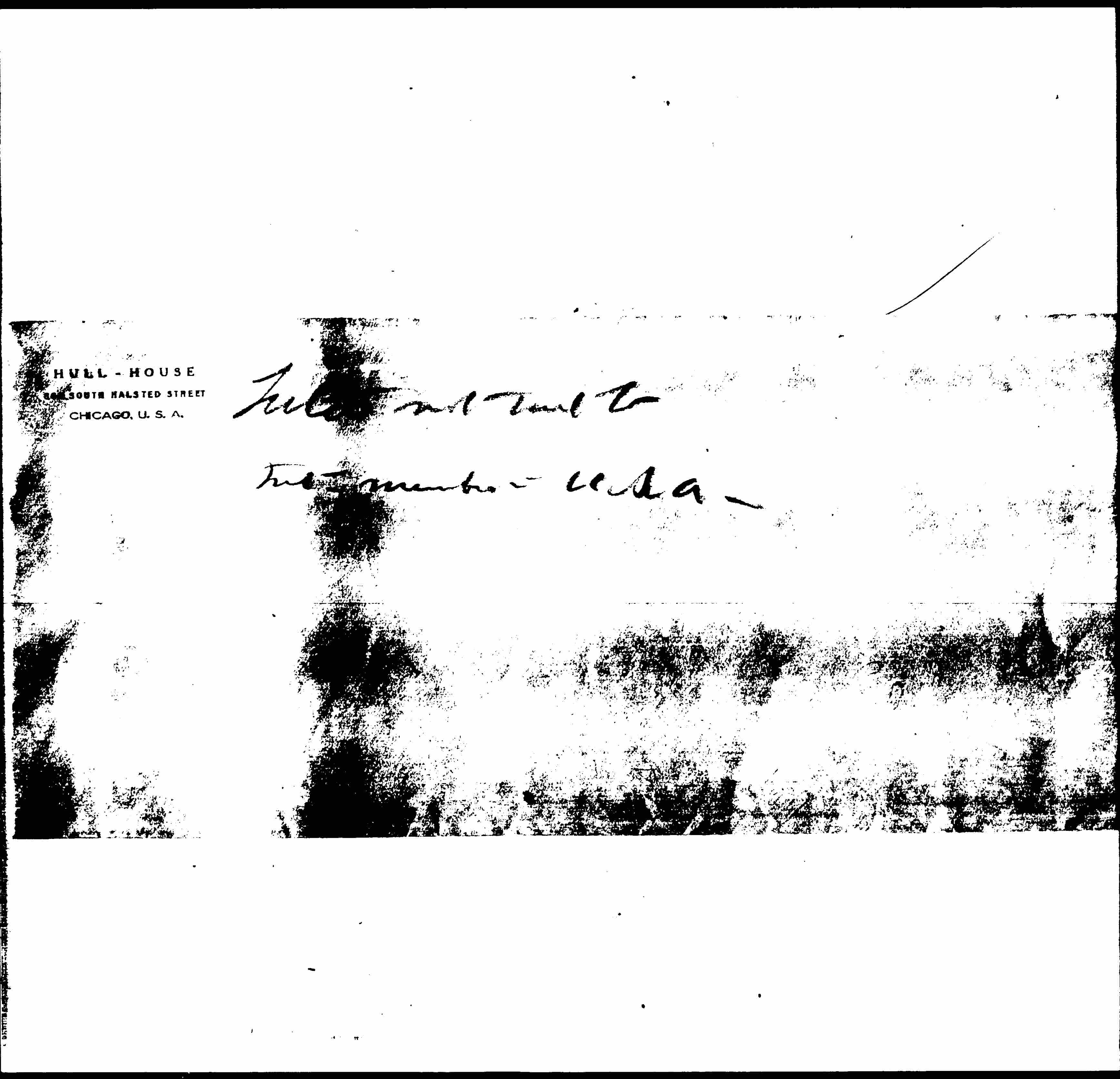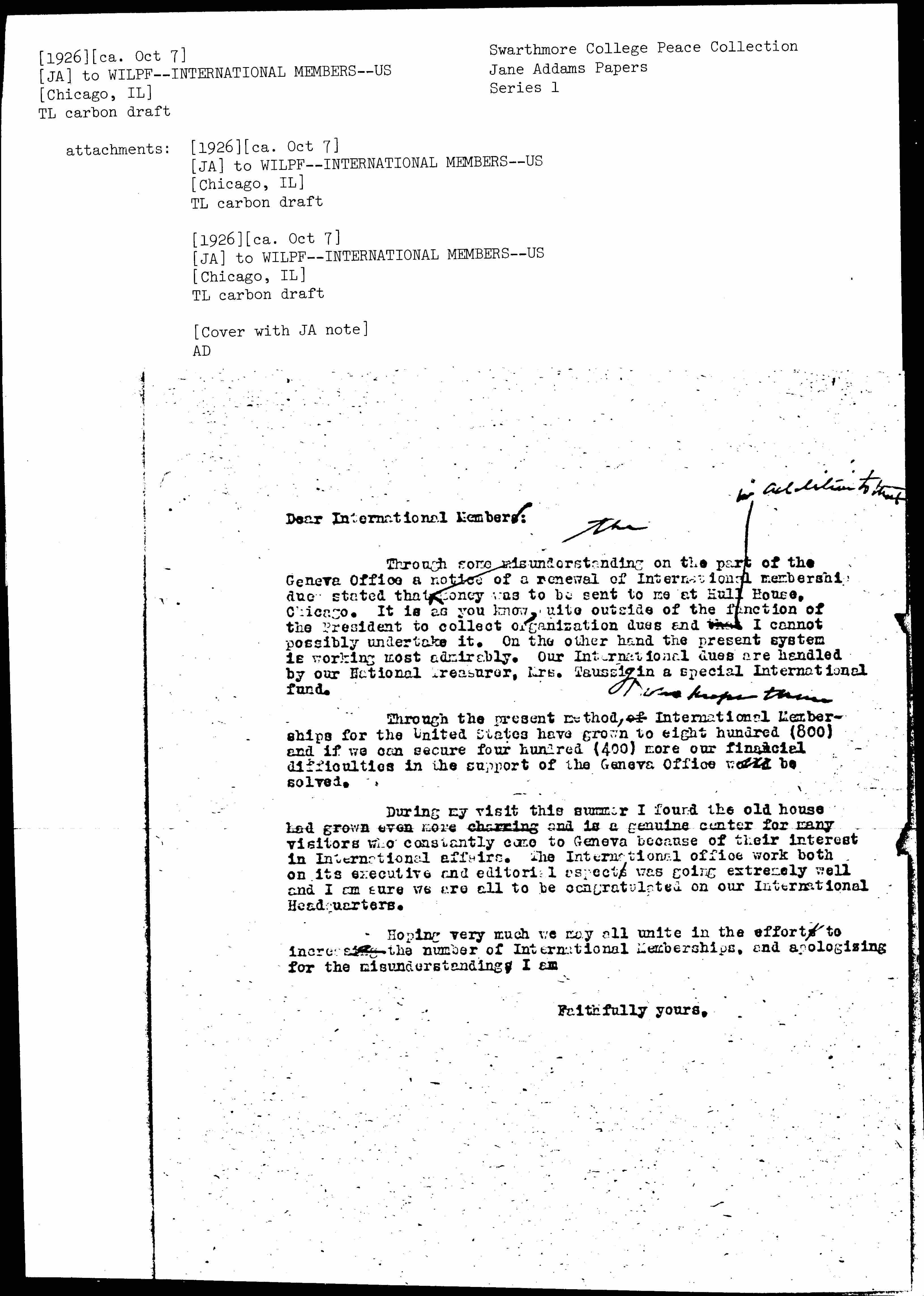 Through some misunderstanding on the part of the Geneva Office a notice of a renewal of International membership dues stated that ↑the↓ money was to be sent to me at Hull House, Chicago. It is as you know, quite outside of the function of the President to collect organization dues and that ↑in addition to that↓ I cannot possibly undertake it. On the other hand the present system is working most admirably. Our International dues are handled by our [National] Treasurer, Mrs. Taussig ↑so she keeps them↓ in a special International fund.
