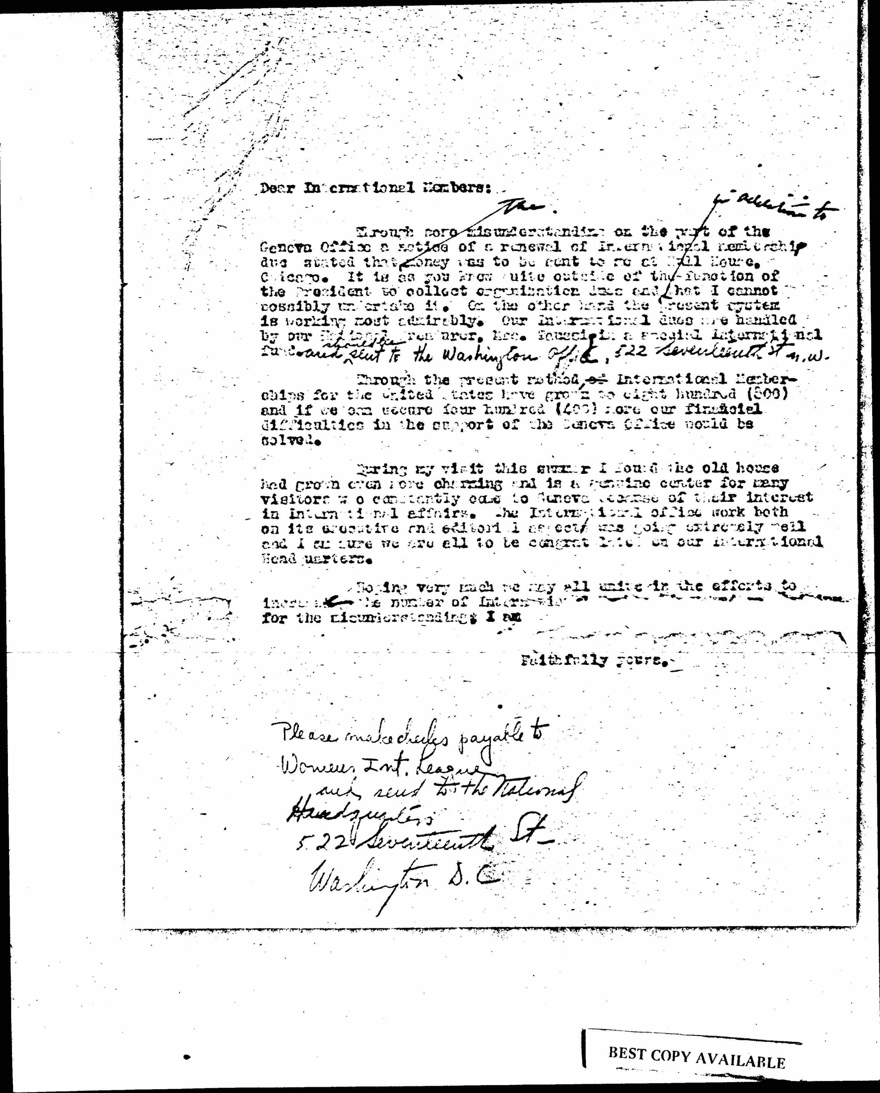 Through some misunderstanding on the part of the Geneva Office a notice of a renewal of International membership dues stated that ↑the↓ money was to be sent to me at Hull House, Chicago. It is as you know quite outside of the function of the President to collect organization dues and that ↑in addition to↓ that I cannot possibly undertake it. On the other hand the present system is working most admirably. Our International dues are handled by our National Treasurer, Mrs. Taussig in a special international fund ↑and should be sent to the Washington office, 522 Seventeenth St N.W.↓