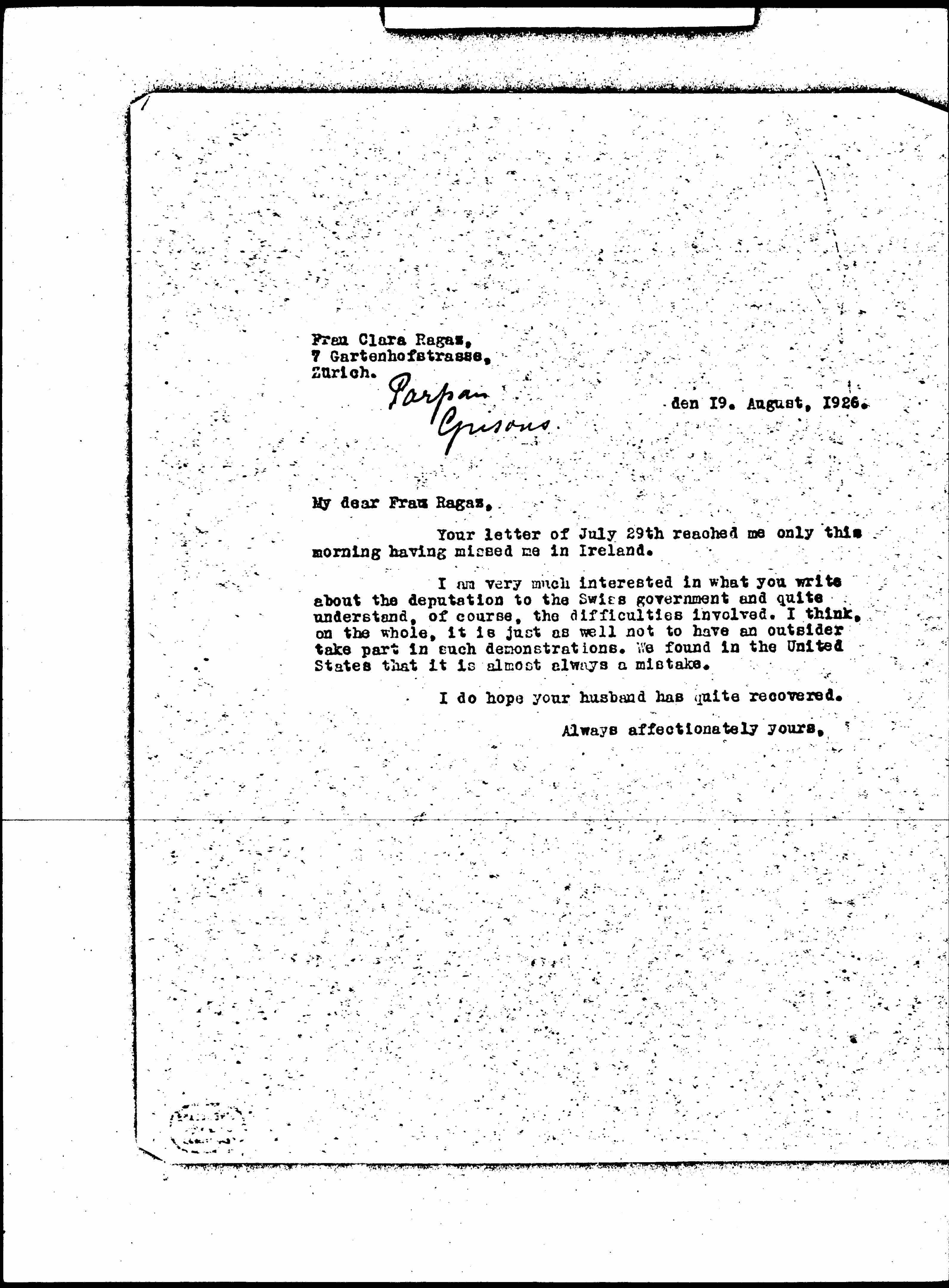I am very much interested in what you write about the deputation to the Swiss government and quite understand, of course, the difficulties involved. I think, on the whole, it is just as well not to have an outsider take part in such demonstrations. We found in the United States that it is almost always a mistake.