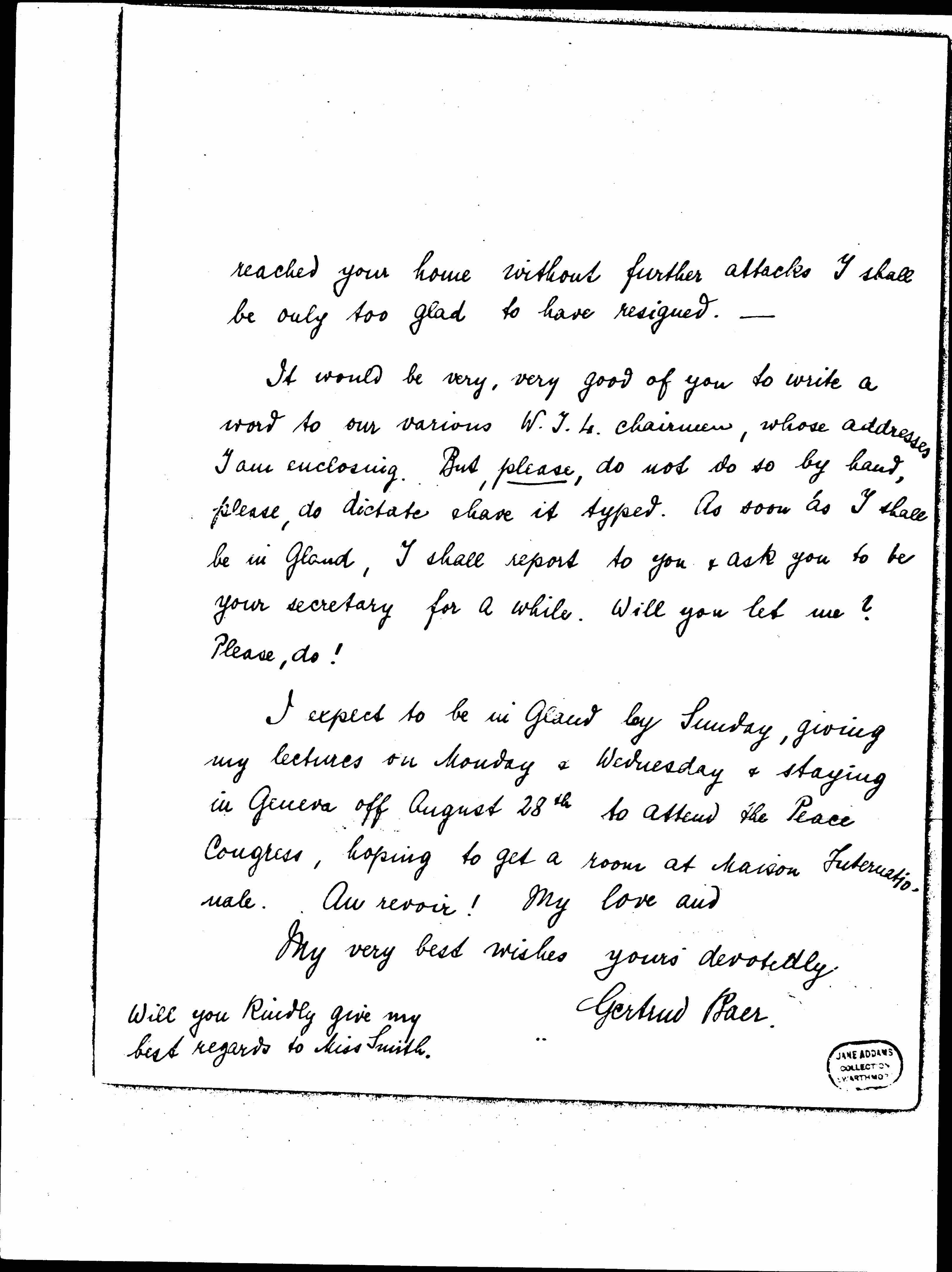I expect to be in Gland by Sunday, giving my lectures on Monday & Wednesday & staying in Geneva off August 28th to attend the Peace Congress, hoping to get a room at Maison Internationale. Au revoir! My love and