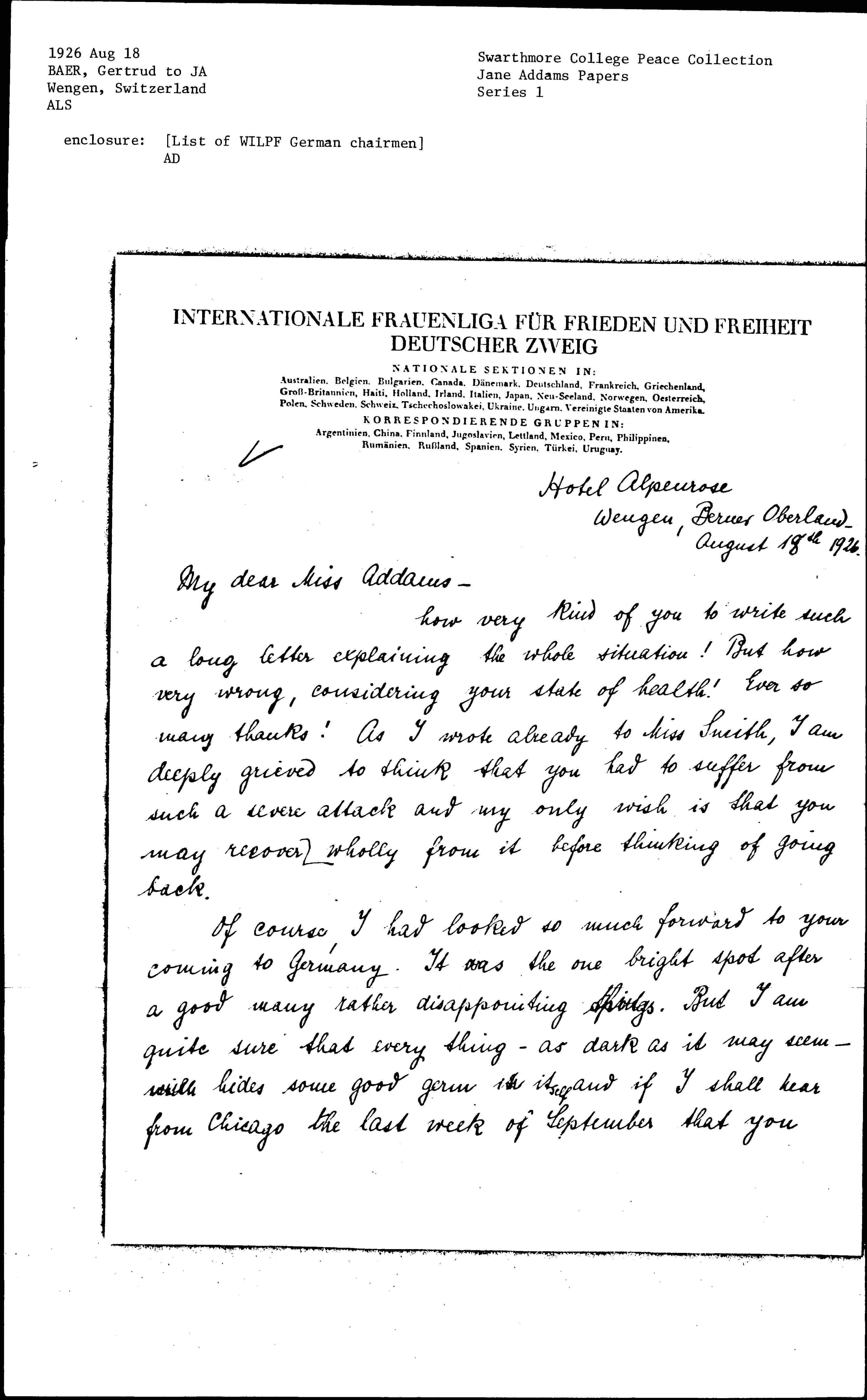 It would be very, very good of you to write a word to our various W.I.L. chairmen, whose addresses I am enclosing. But, please, do not do so by hand, please, do dictate & share it typed. As soon as I shall be in Gland, I shall report to you & ask you to be your secretary for a while. Will you let me? Please, do!