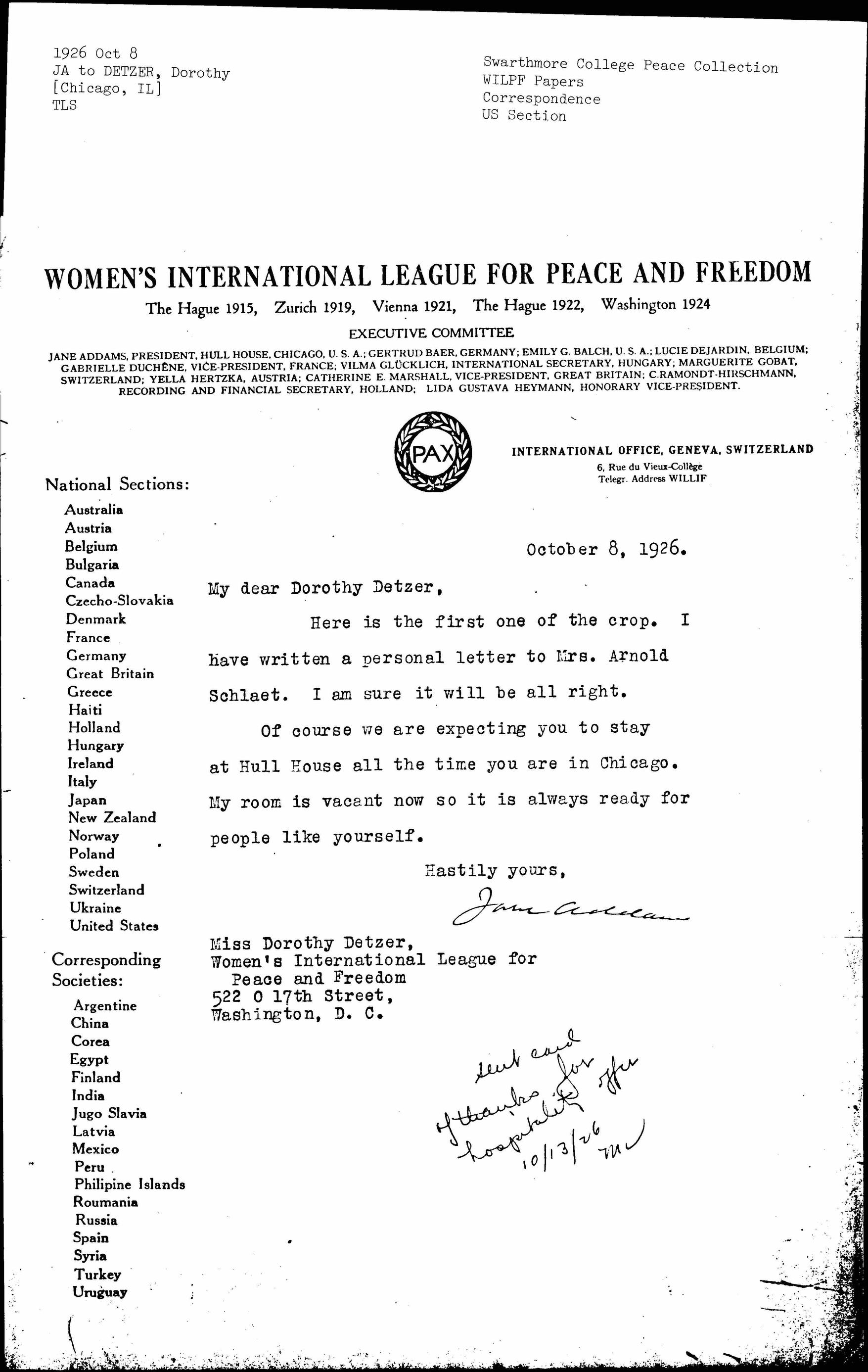 Of course we are expecting you to stay at Hull House all the time you are in Chicago. My room is vacant now so it is always ready for people like yourself.