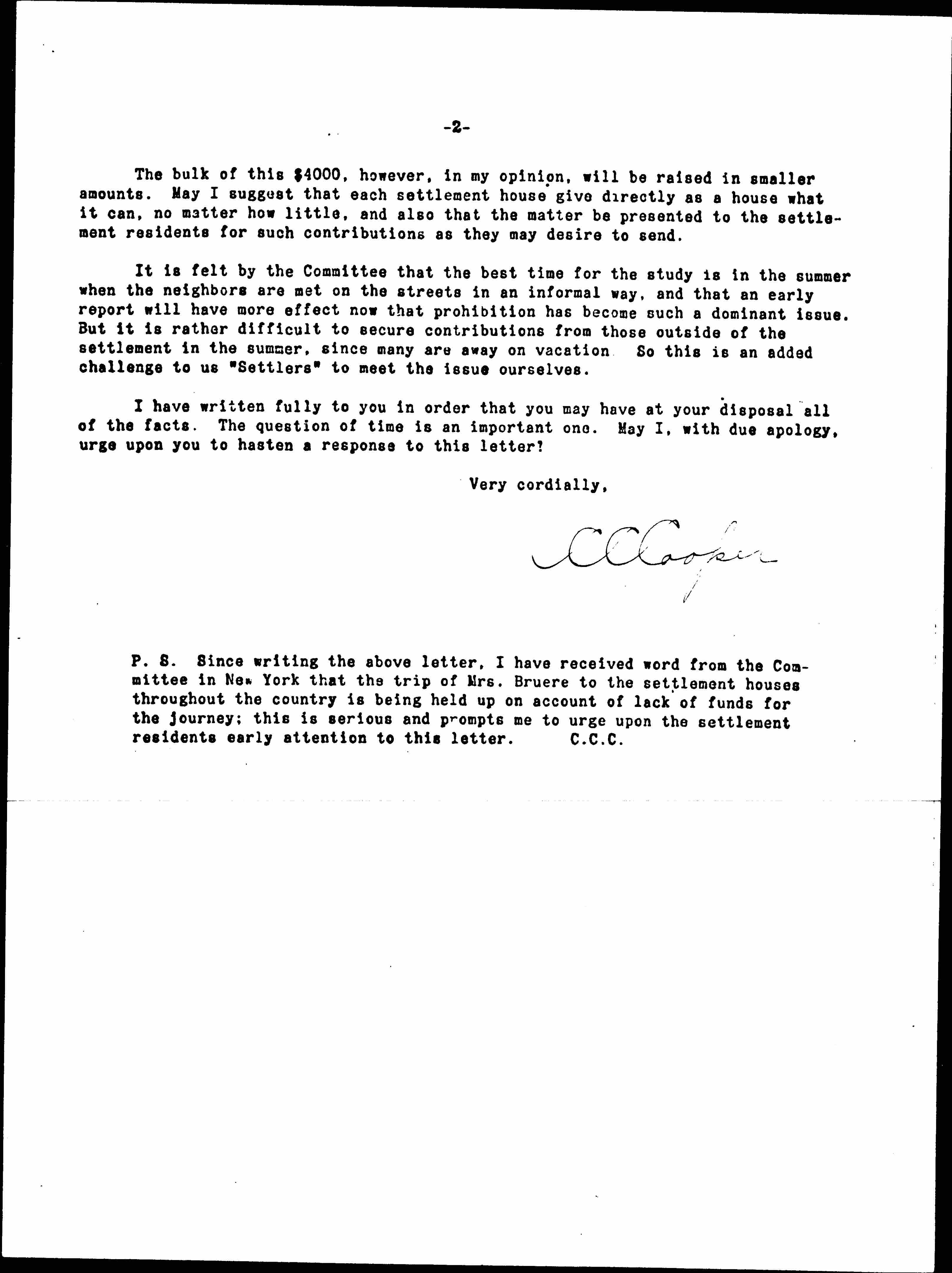 P.S. Since writing the above letter, I have received word from the Committee in New York that the trip of Mrs. Bruère to the settlement houses throughout the country is being held up on account of lack of funds for the journey; this is serious and prompts me to urge upon the settlement residents early attention to this letter. C. C. C.