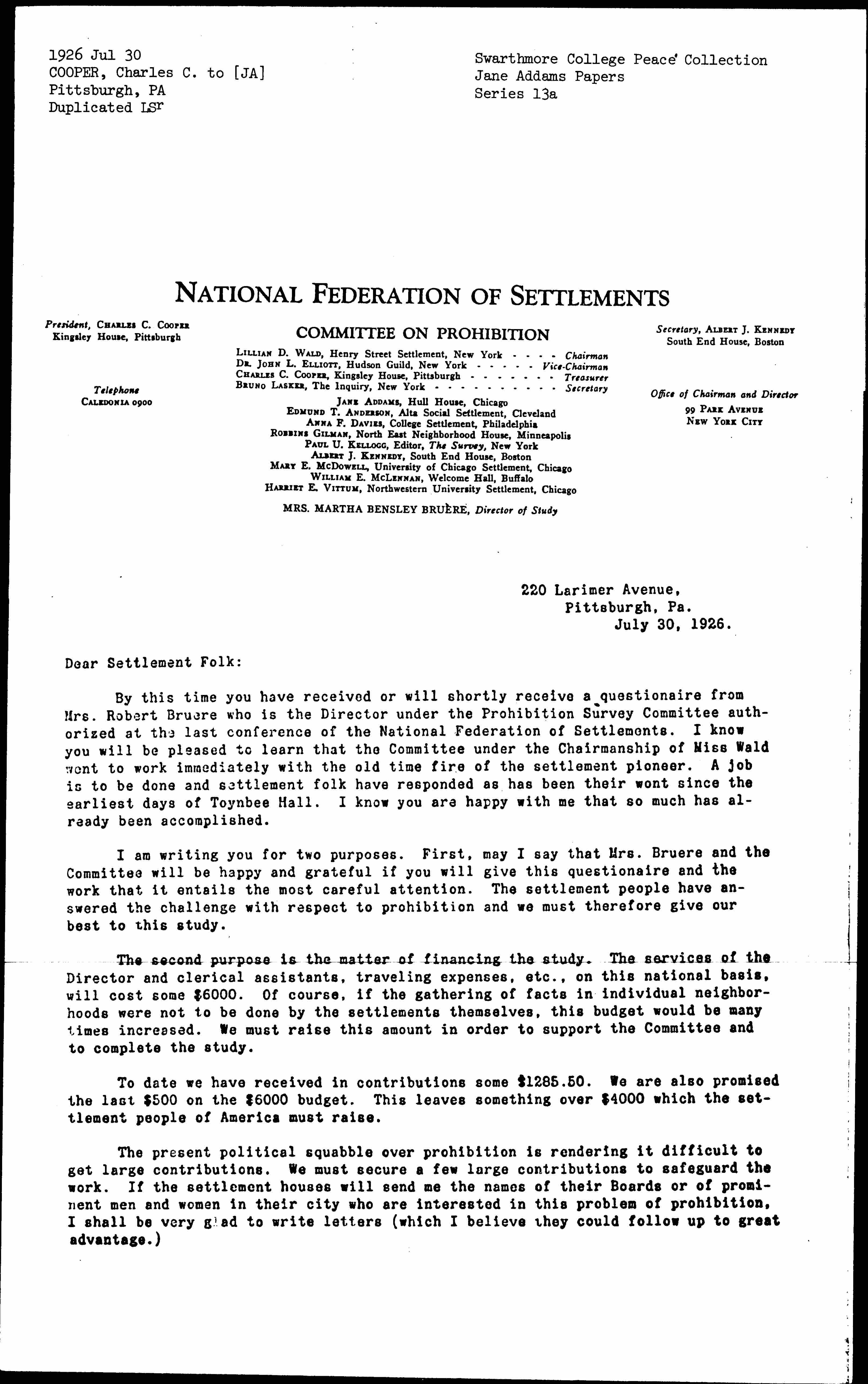 By this time you have received or will shortly receive a questionnaire from Mrs. Robert Bruère who is the Director under the Prohibition Survey Committee authorized at the last conference of the National Federation of Settlements. I know you will be pleased to learn that the Committee under the Chairmanship of Miss Wald went to work immediately with the old time fire of the settlement pioneer. A job is to be done and settlement folk have responded as has been their wont since the earliest days of Toynbee Hall. I know you are happy with me that so much has already been accomplished.