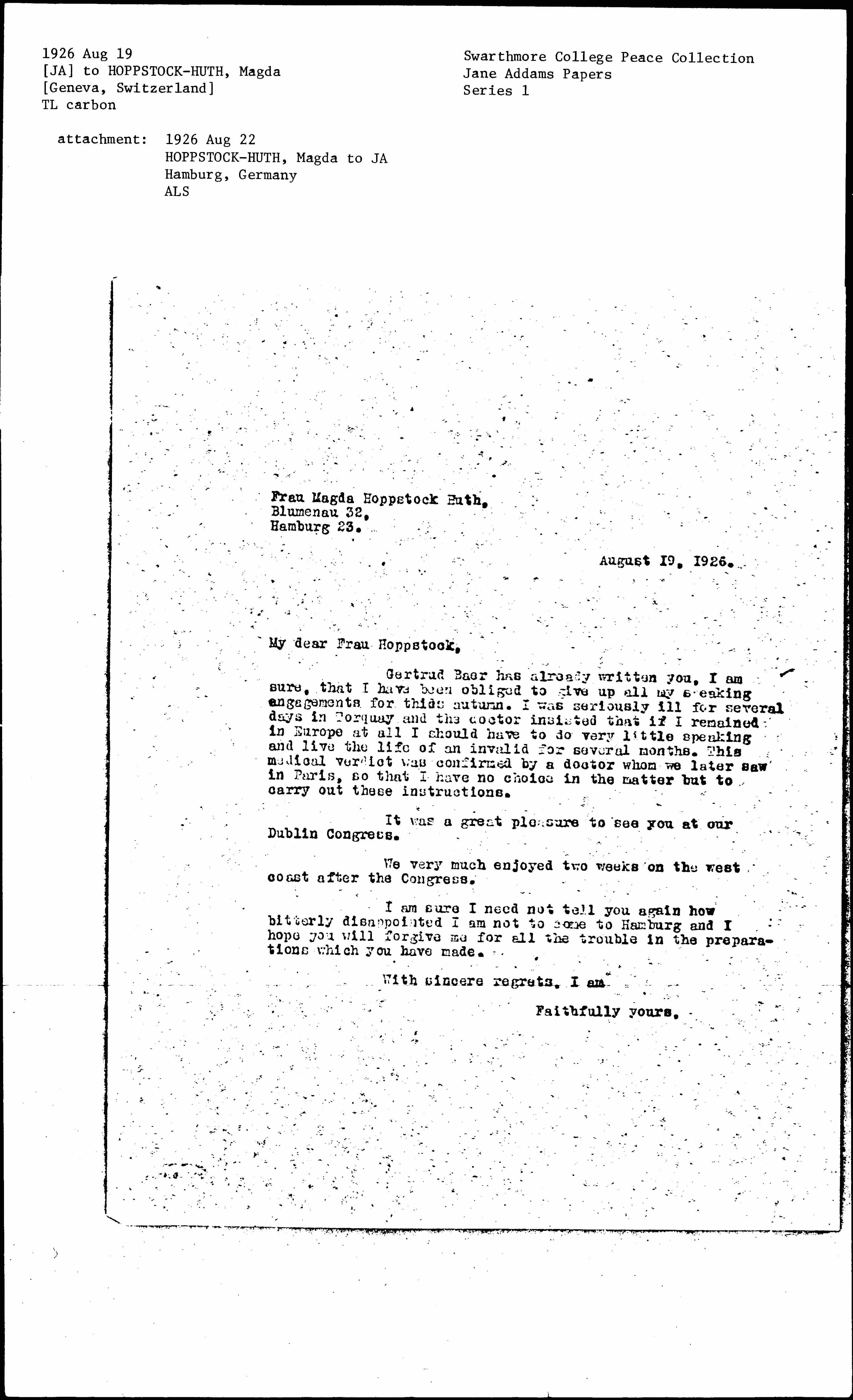 Gertrud Baer has already written you, I am sure, that I have been obliged to give up all my speaking engagements for [this] autumn. I was seriously ill for several days in Torquay and the doctor insisted that if I remained in Europe at all I should have to do very little speaking and live the life of an invalid for several months. This medical verdict was confirmed by a doctor whom we later saw in Paris, so that I have no choice in the matter but to carry out these instructions.