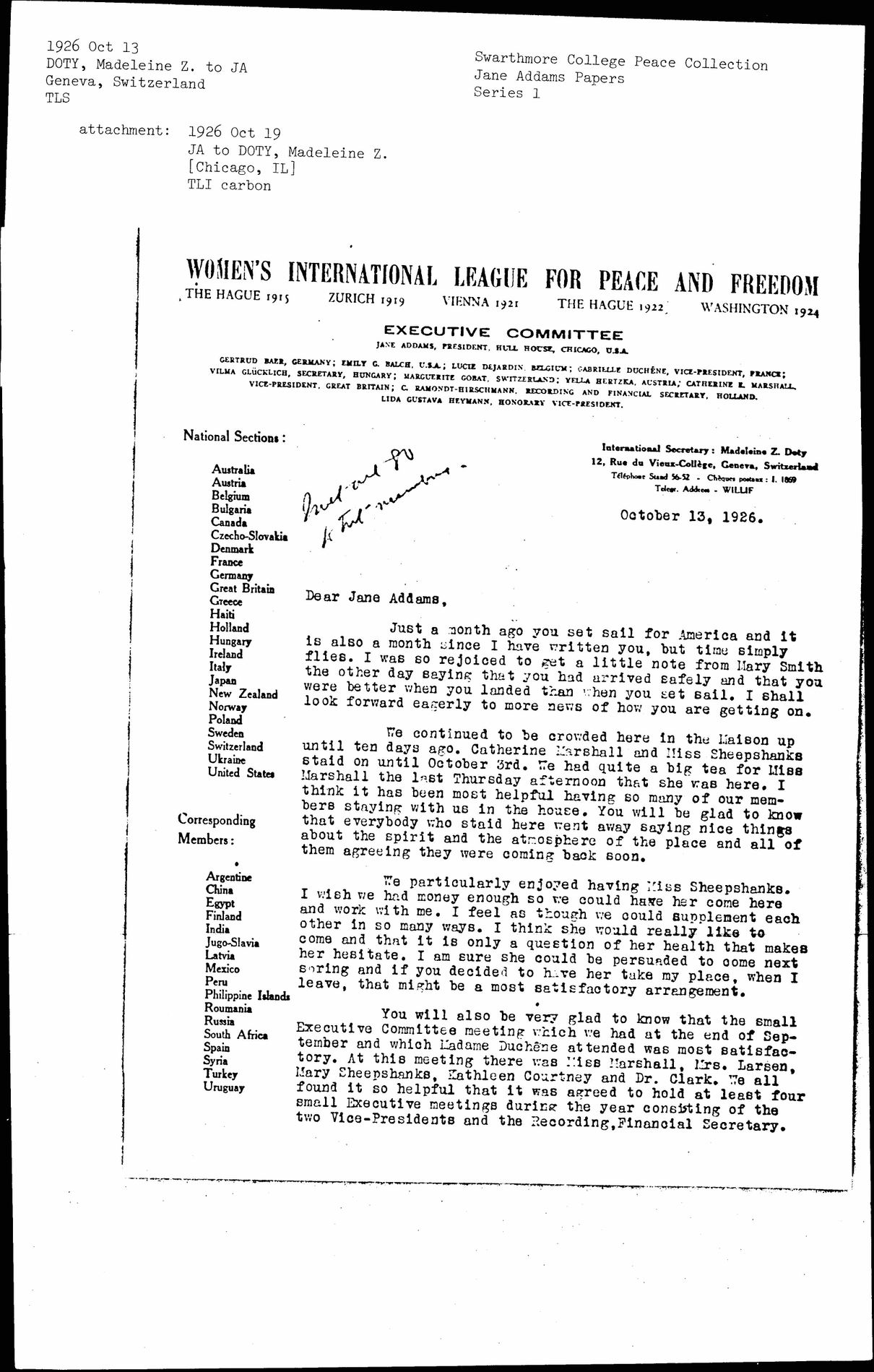 You will also be very glad to know that the small Executive Committee meeting which we had at the end of September and which Madame Duchêne attended was most satisfactory. At this meeting there was Miss Marshall, Mrs. Larsen, Mary Sheepshanks, Kathleen Courtney and Dr. Clark. We all found it so helpful that it was agreed to hold at least four small Executive meetings during the year consisting of the two Vice-Presidents and the Recording, Financial Secretary. [page 2]