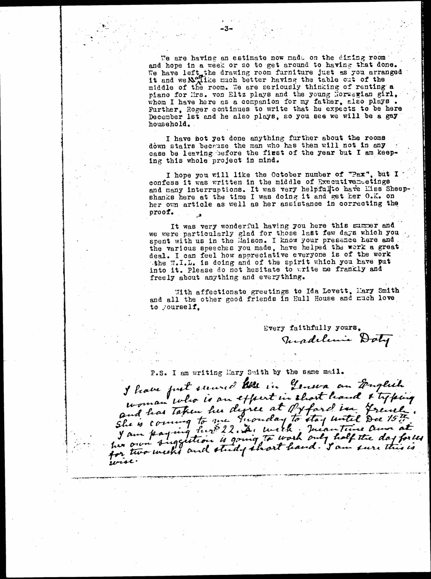 We are having an estimate now made on the dining room and hope in a week or so to get around to having that done. We have left the drawing room furniture just as you arranged it and [we] ↑all↓ like much better having the table out of the middle of the room. We are seriously thinking of renting a piano for Mrs. von Eltz plays and the young Norwegian girl, whom I have here as a companion for my father, also plays. Further, Roger continues to write that he expects to be here December 1st and he also plays, so you see we will be a gay household.