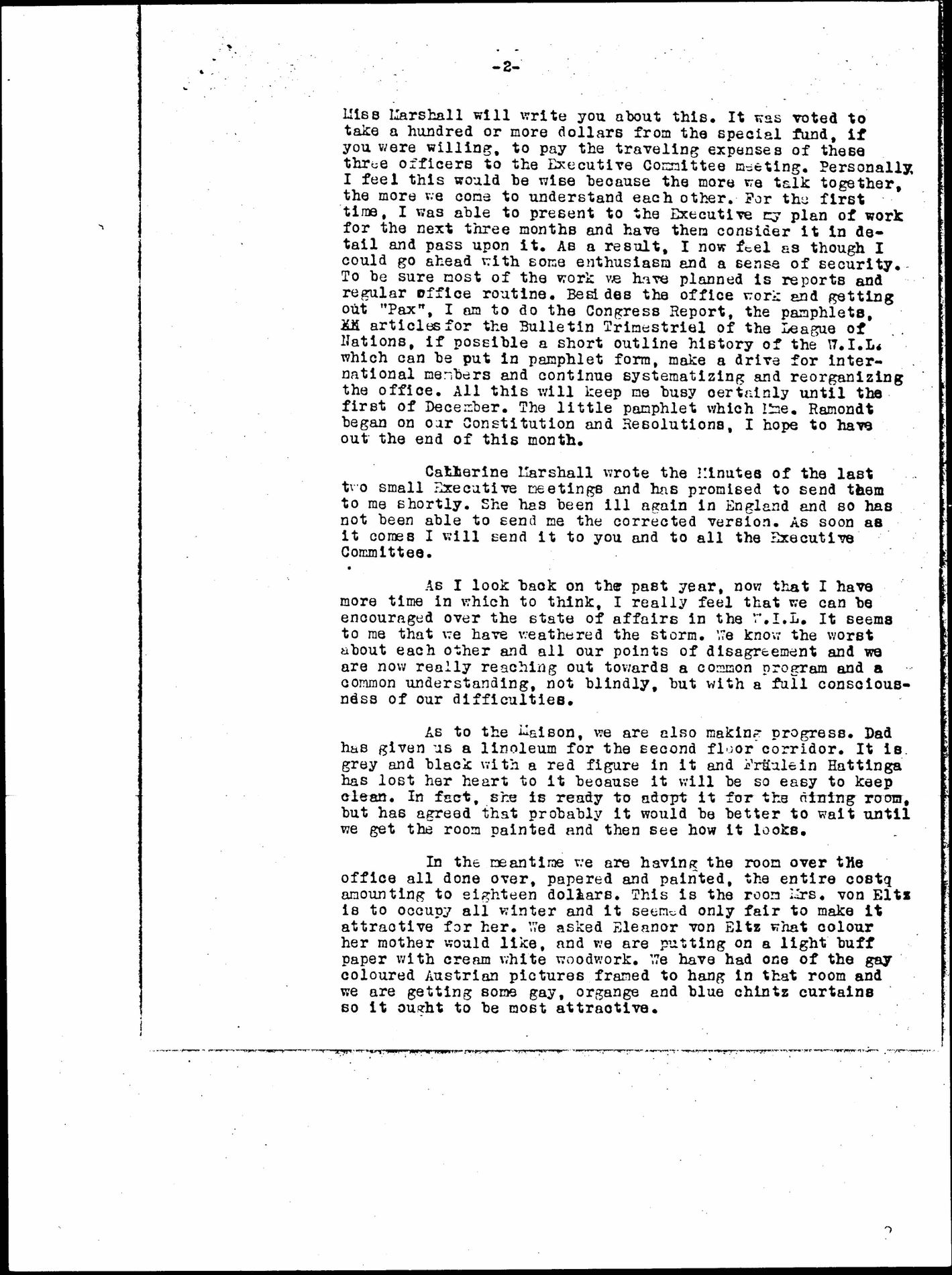 Miss Marshall will write you about this. It was voted to take a hundred or more dollars from the special fund, if you were willing, to pay the traveling expenses of these three officers to the Executive Committee meeting. Personally I feel this would be wise because the more we talk together, the more we come to understand each other. For the first time, I was able to present to the Executive my plan of work for the next three months and have them consider it in detail and pass upon it. As a result, I now feel as though I could go ahead with some enthusiasm and a sense of security. To be sure most of the work we have planned is reports and regular office routine. Besides the office work and getting out "Pax," I am to do the Congress Report, the pamphlets, [illegible] articles for the Bulletin Trimestriel of the League of Nations, if possible a short outline history of the W.I.L. which can be put in pamphlet form, make a drive for international members and continue systematizing and reorganizing the office. All this will keep me busy certainly until the first of December. The little pamphlet which Mme. Ramondt began on our Constitution and Resolutions, I hope to have out by the end of this month.