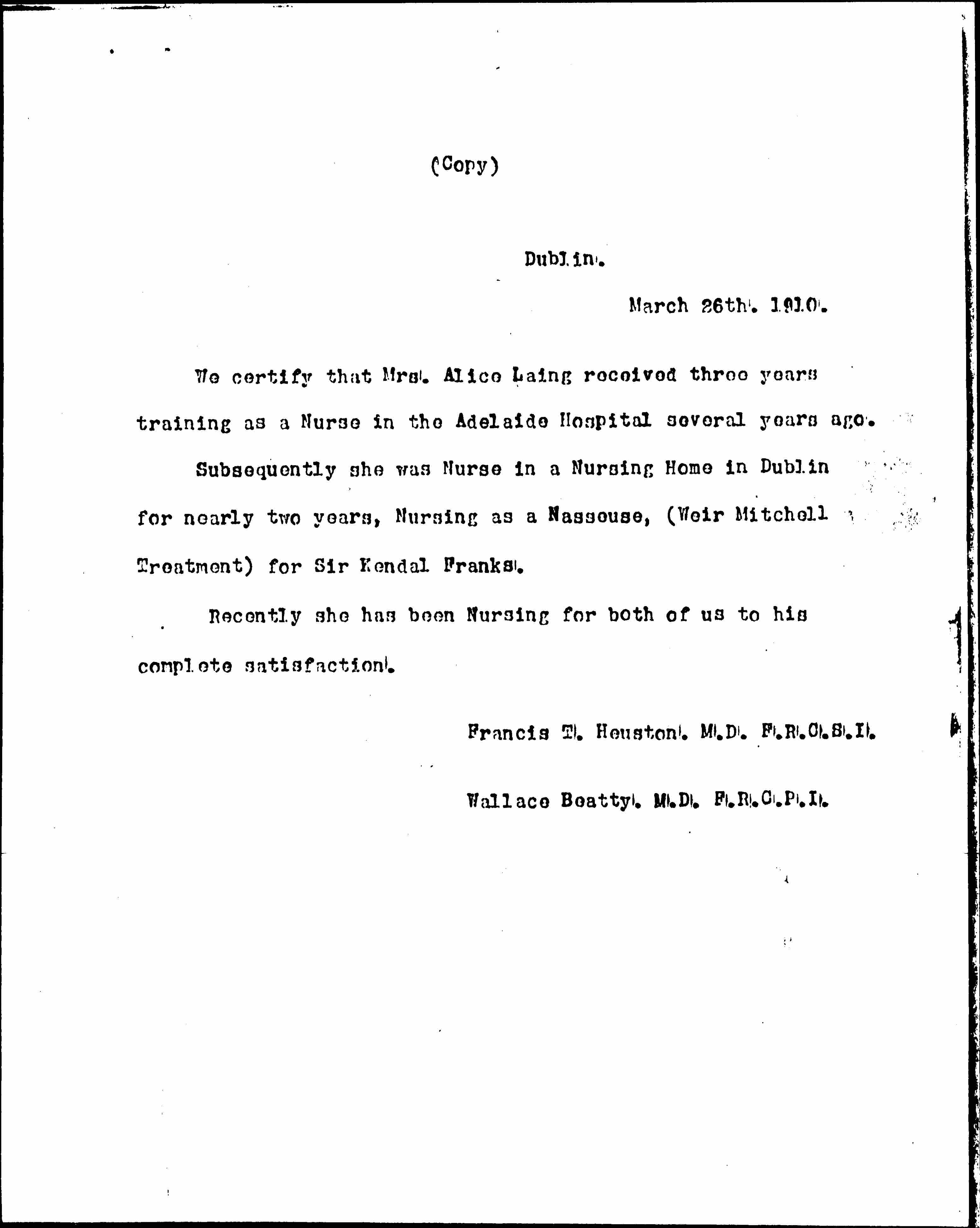 We certify that Mrs. Alice Laing received three years training as a Nurse in the Adelaide Hospital several years ago.