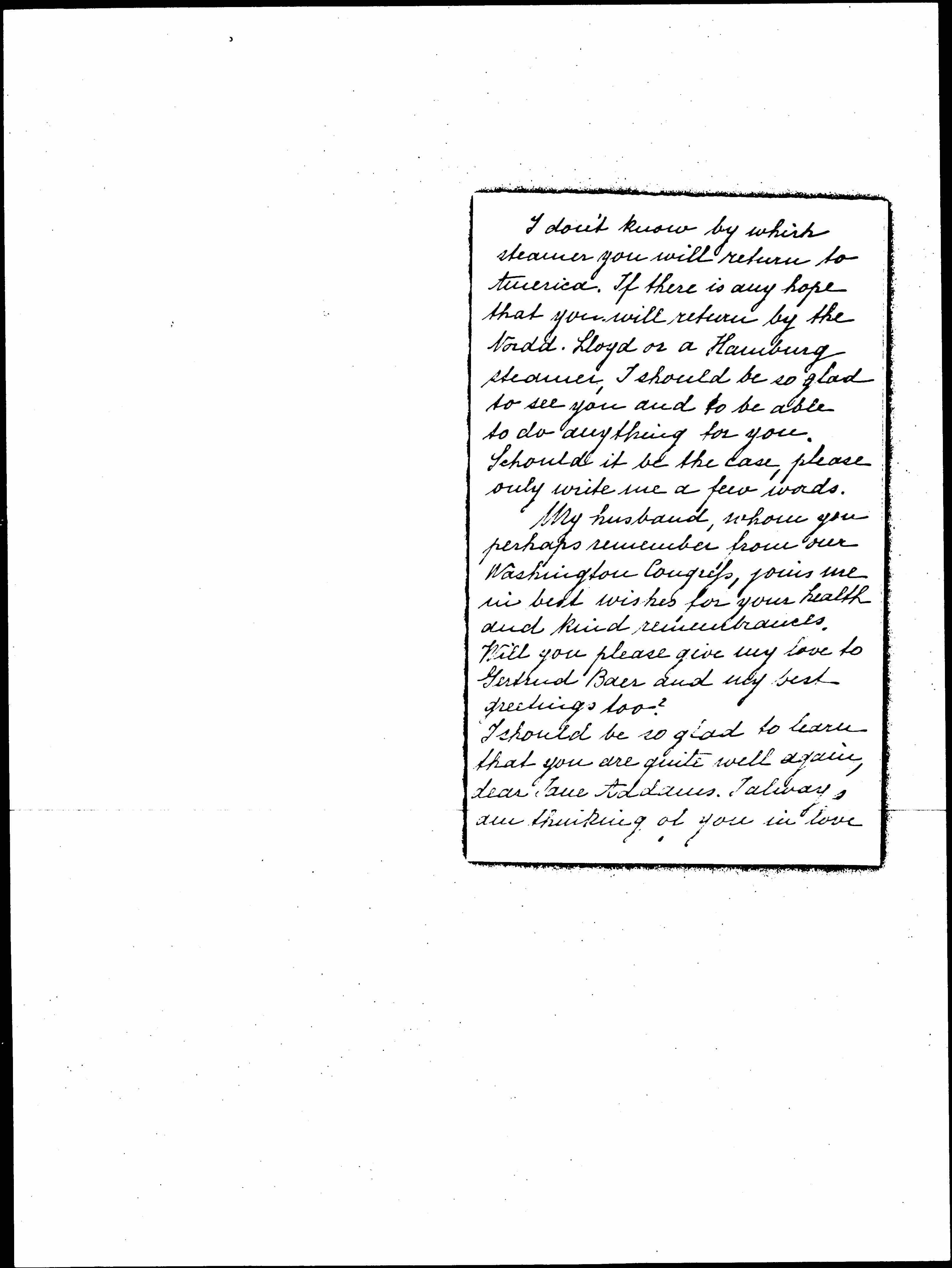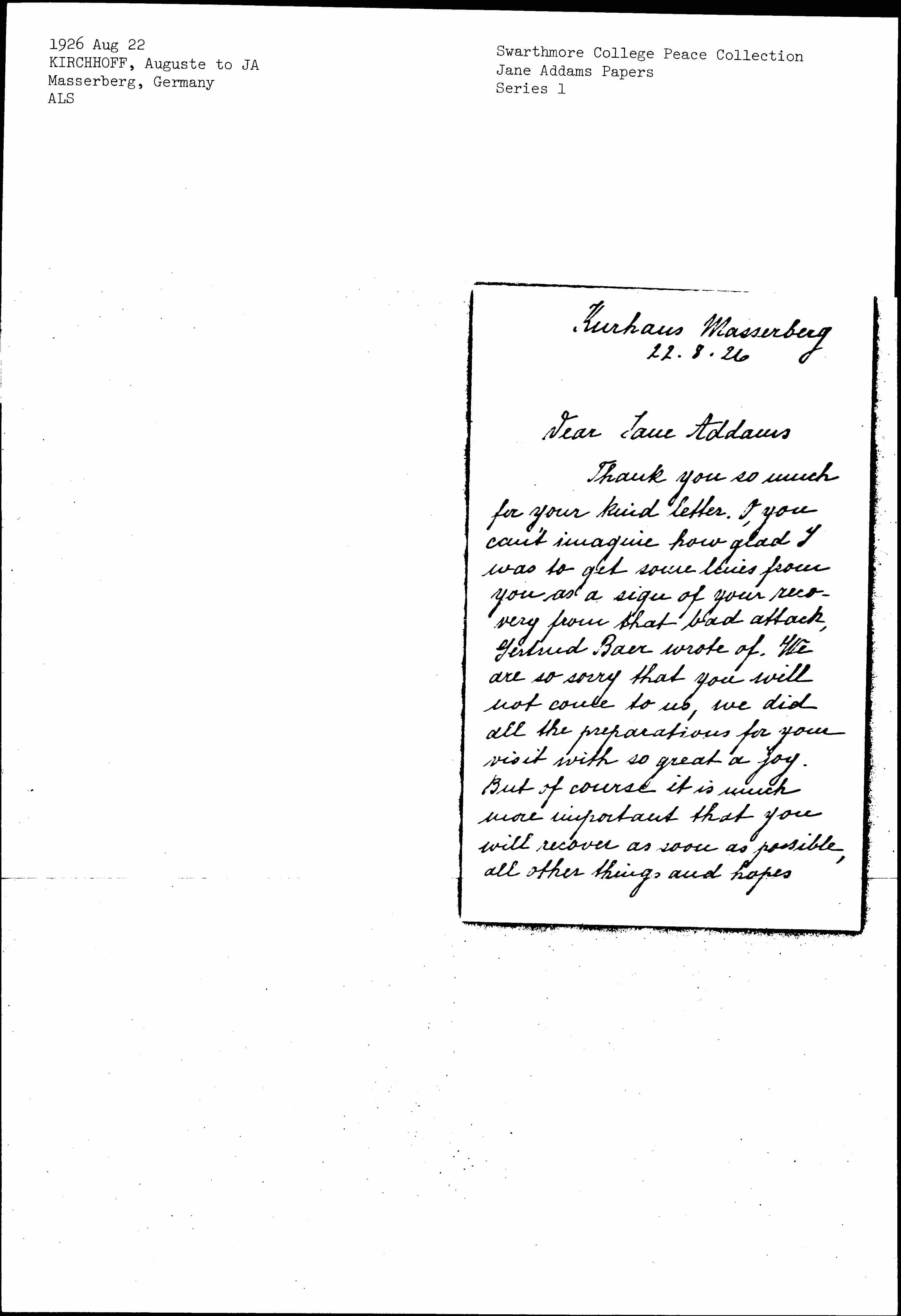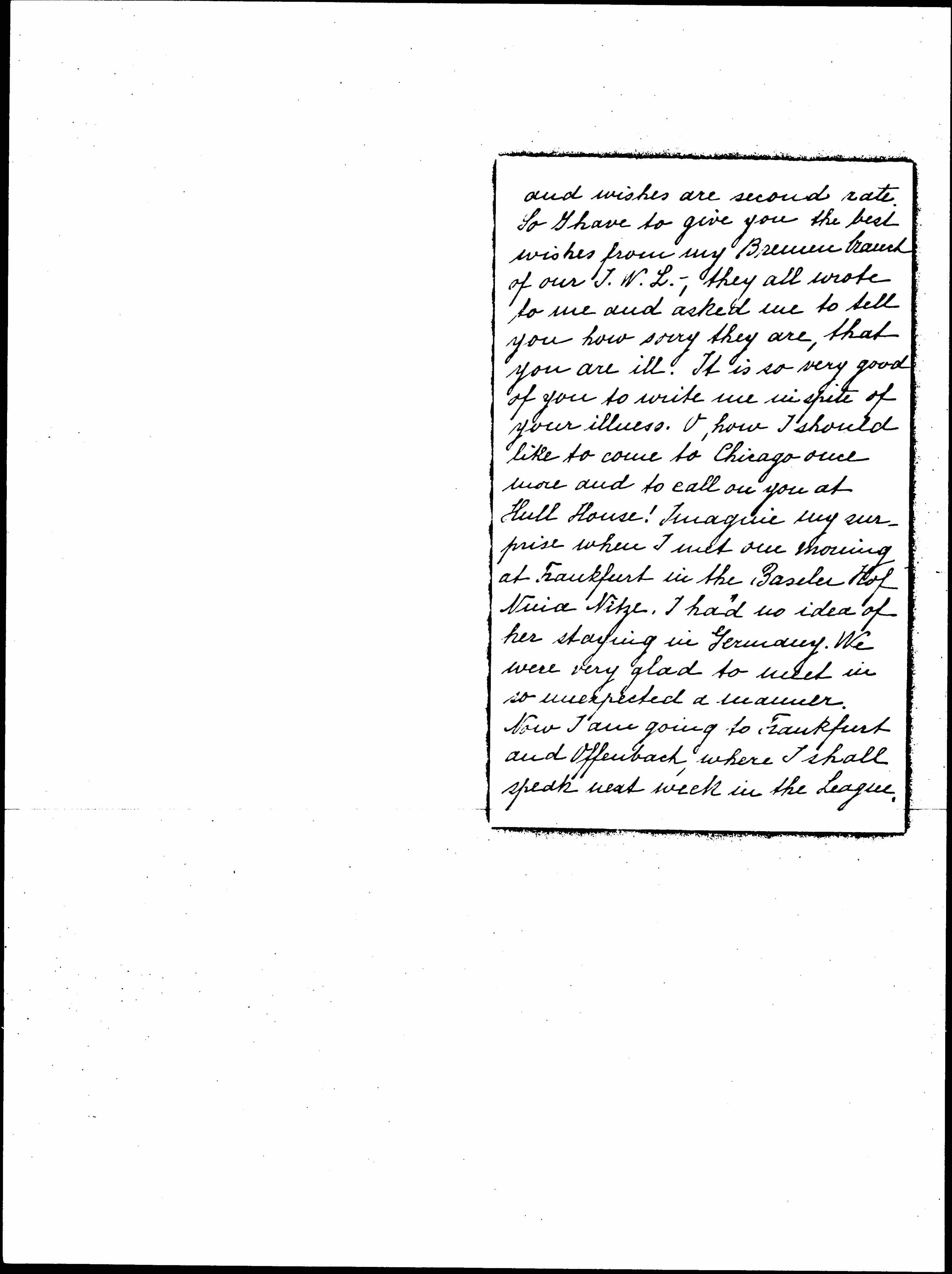 Thank you so much for your kind letter. O, you can't imagine how glad I was to get some lines from you as a sign of your recovery from that bad attack, Gertrud Baer wrote of. We are so sorry that you will not come to us. We did all the preparations for your visit with so great a joy. But of course it is much more important that you will recover as soon as possible, all other things and hopes [page 2] and wishes are second rate. So I have to give you the best wishes from my Bremen branch of our I.W.L, they all wrote to me and asked me to tell you how sorry they are, that you are ill! It is so very good of you to write me in spite of your illness. O, how I should like to come to Chicago once more and to call on you at Hull House! Imagine my surprise when I met one morning at Frankfurt in the Baseler Hof Nina Nitze. I had no idea of her staying in Germany. We were very glad to meet in so unexpected a manner. Now I am going to Frankfurt and Offenbach, where I shall speak in the League. [page 3] I don't know by which steamer you will return to America. If there is any hope that you will return by the Nordd-Lloyd or a Hamburg steamer, I should be so glad to see you and to be able to do anything for you. I, should it be the case, please only write me a few words.