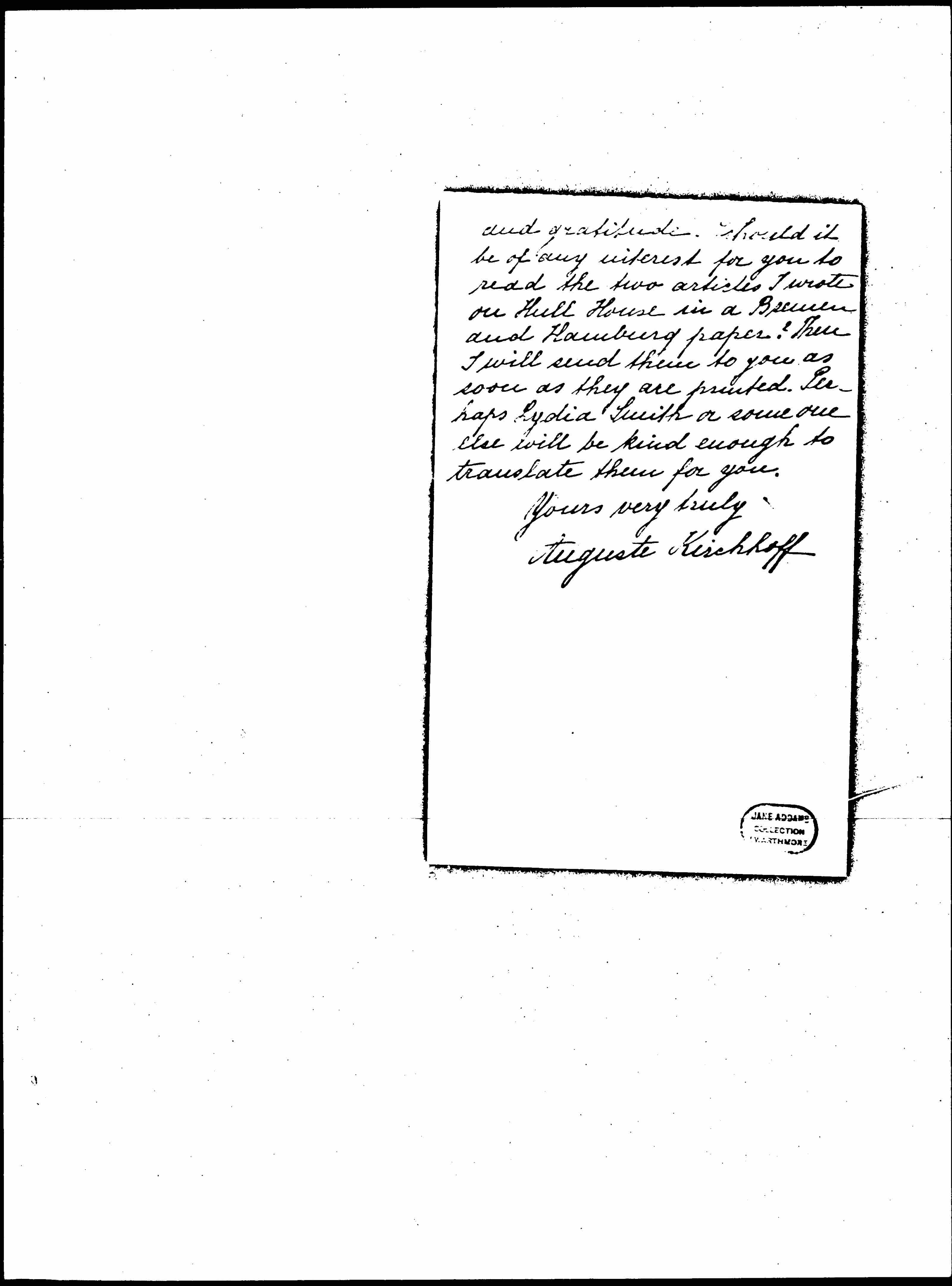 I should be so glad to learn that you are quite well again, dear Jane Addams. I always am thinking of you in love [page 4] and gratitude. Should it be of any interest for you to read the two articles I wrote on Hull House in a Bremen and Hamburg paper! Then I will send them to you as soon as they are printed. Perhaps Lydia Smith or someone else will be kind enough to translate them for you.