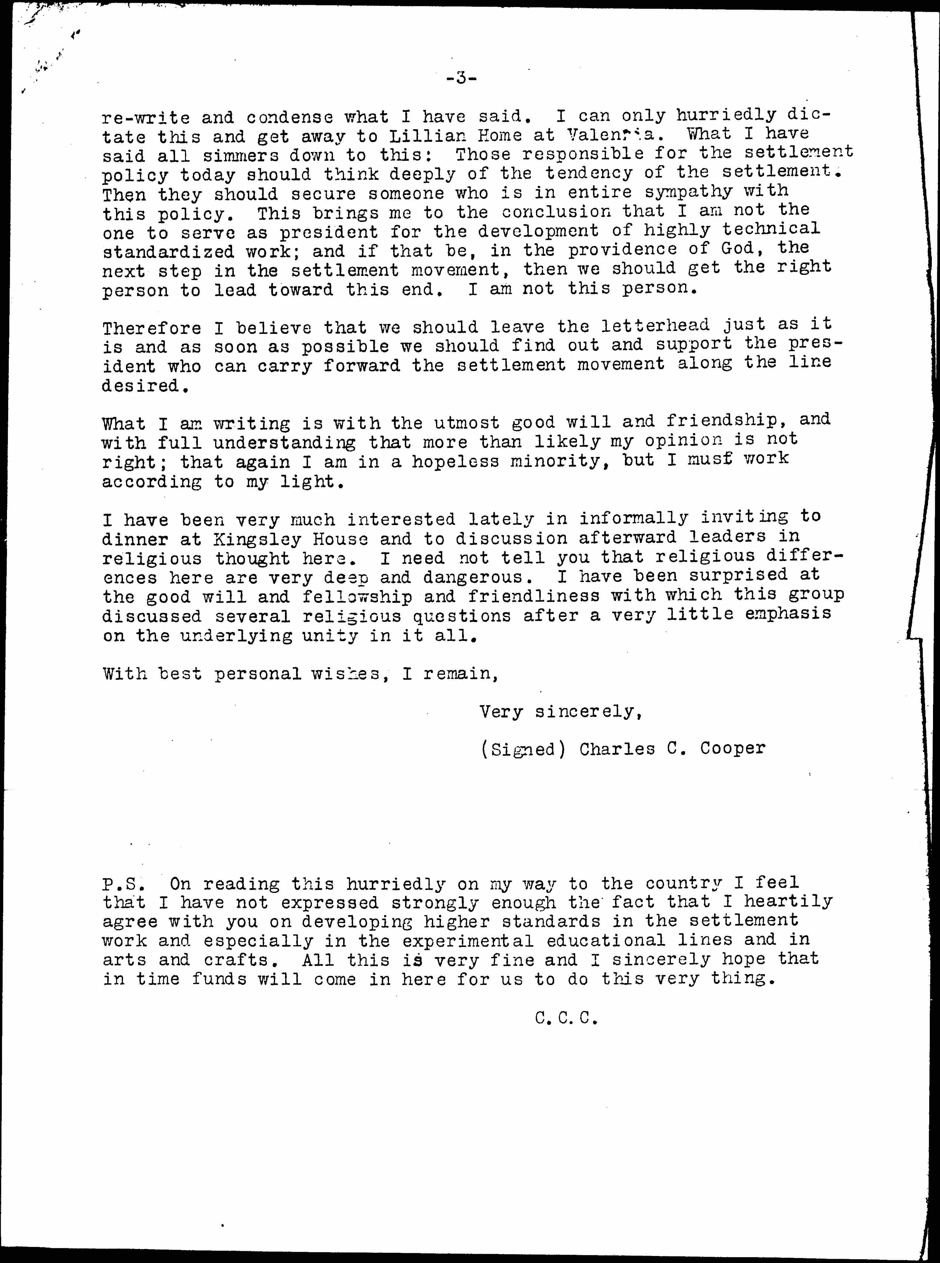I suppose you think I am making a speech, and I wish I had time to [page 3] rewrite and condense what I have said. I can only hurriedly dictate this and get away to Lillian Home at Valencia. What I have said all simmers down to this: Those responsible for the settlement policy today should think deeply of the tendency of the settlement. Then they should secure someone who is in entire sympathy with this policy. This brings me to the conclusion that I am not the one to serve as president for the development of highly technical standardized work; and if that be, in the providence of God, the next step in the settlement movement, then we should get the right person to lead toward this end. I am not this person.