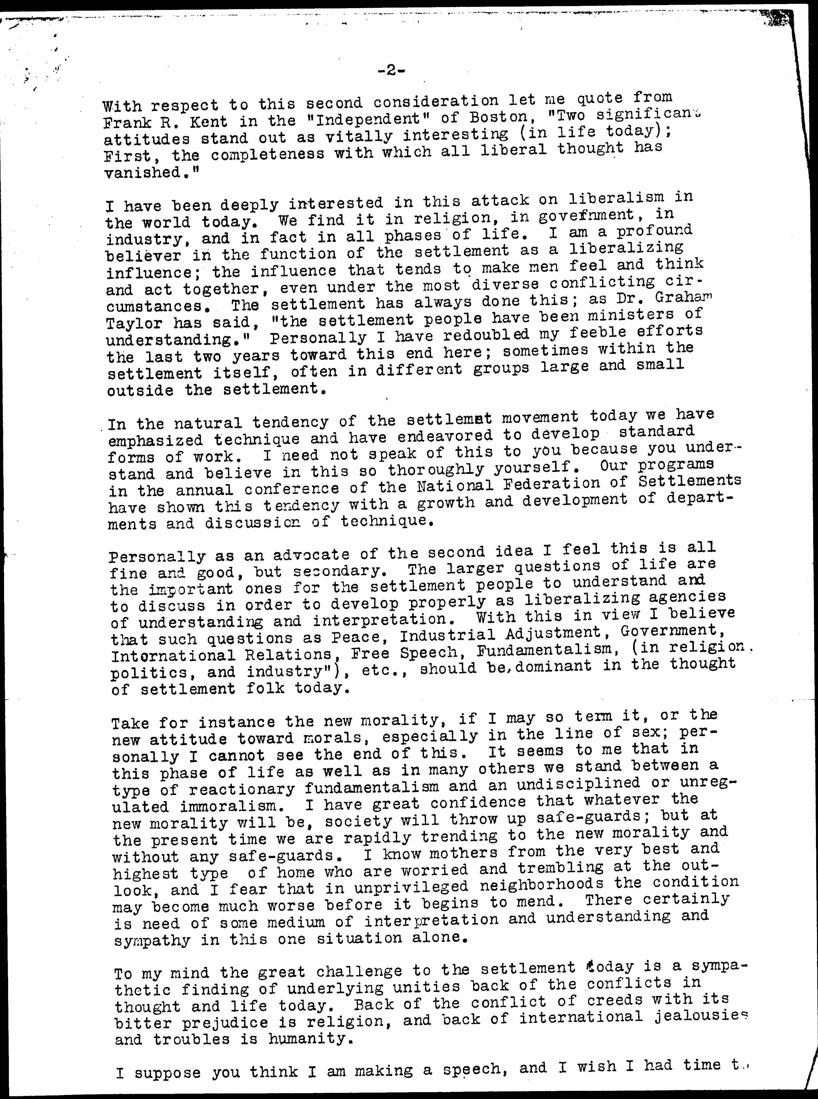 Now the second tendency, which so far as I can judge is of much minor importance today in the settlement movements is for the settlement to reoccupy its old field as a liberalizing influence in all phases of life. [page 2]