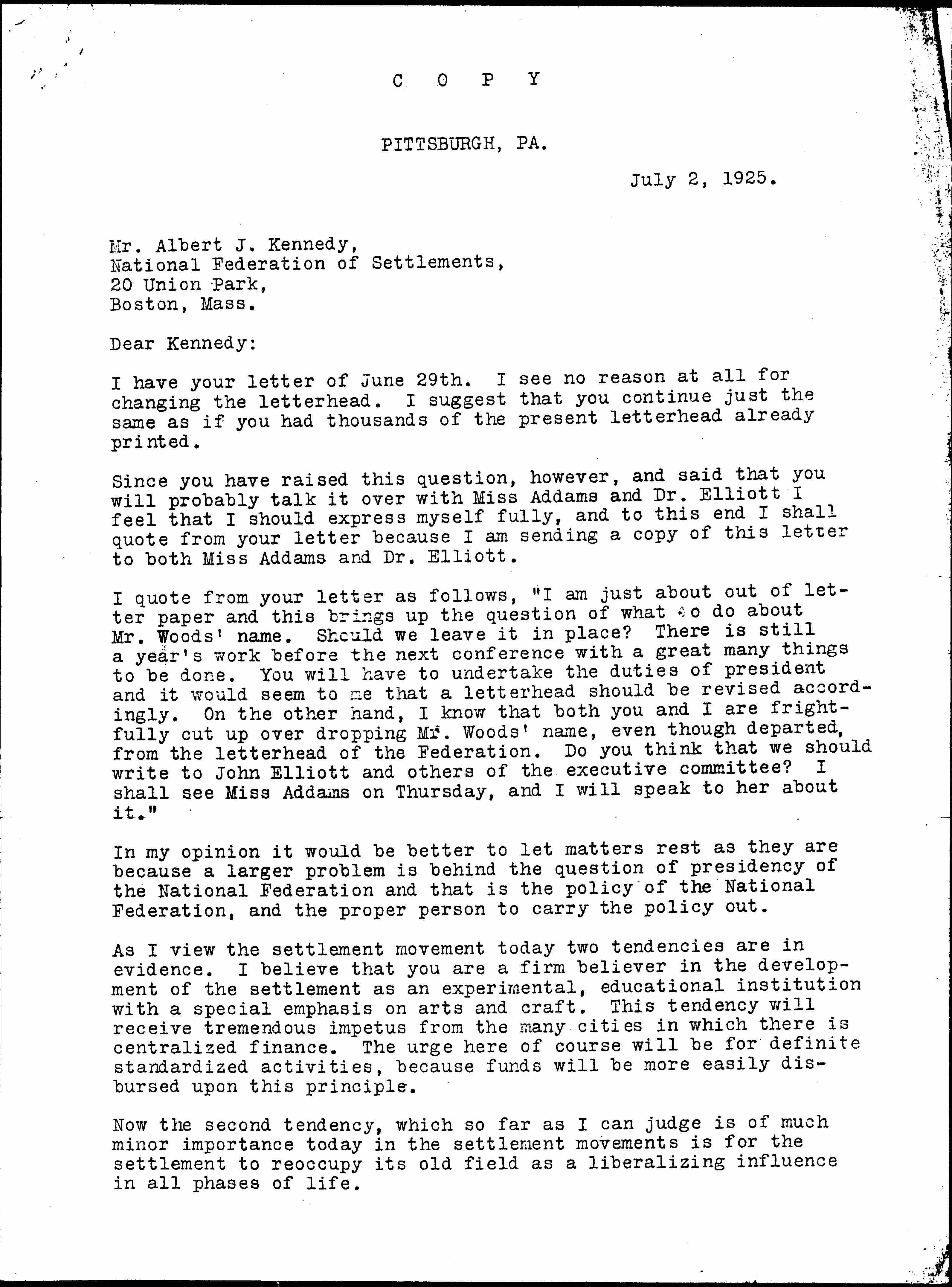 Since you have raised this question, however, and said that you will probably talk it over with Miss Addams and Dr. Elliott I feel that I should express myself fully, and to this end I shall quote from your letter because I am sending a copy of this letter to both Miss Addams and Dr. Elliott.