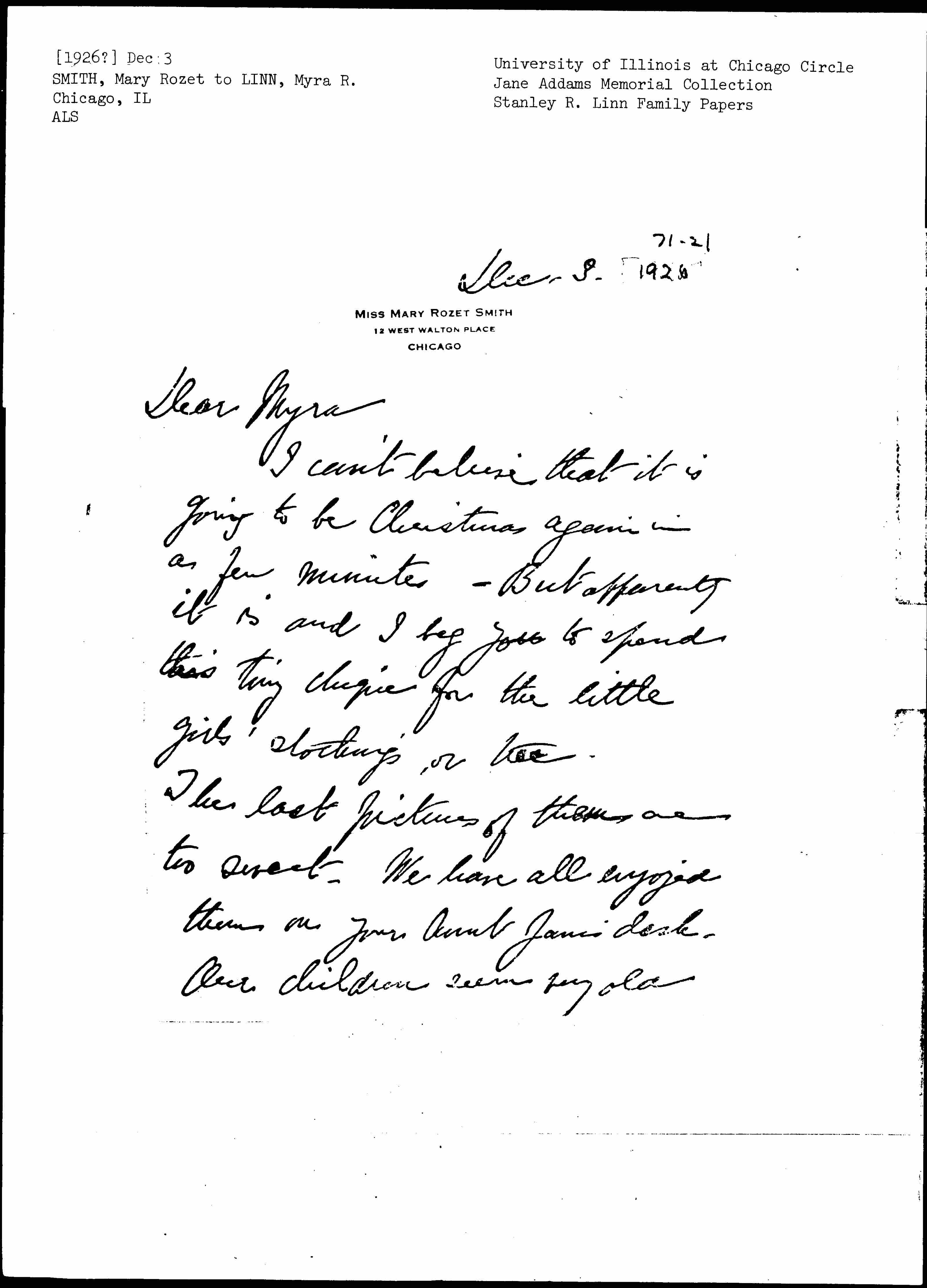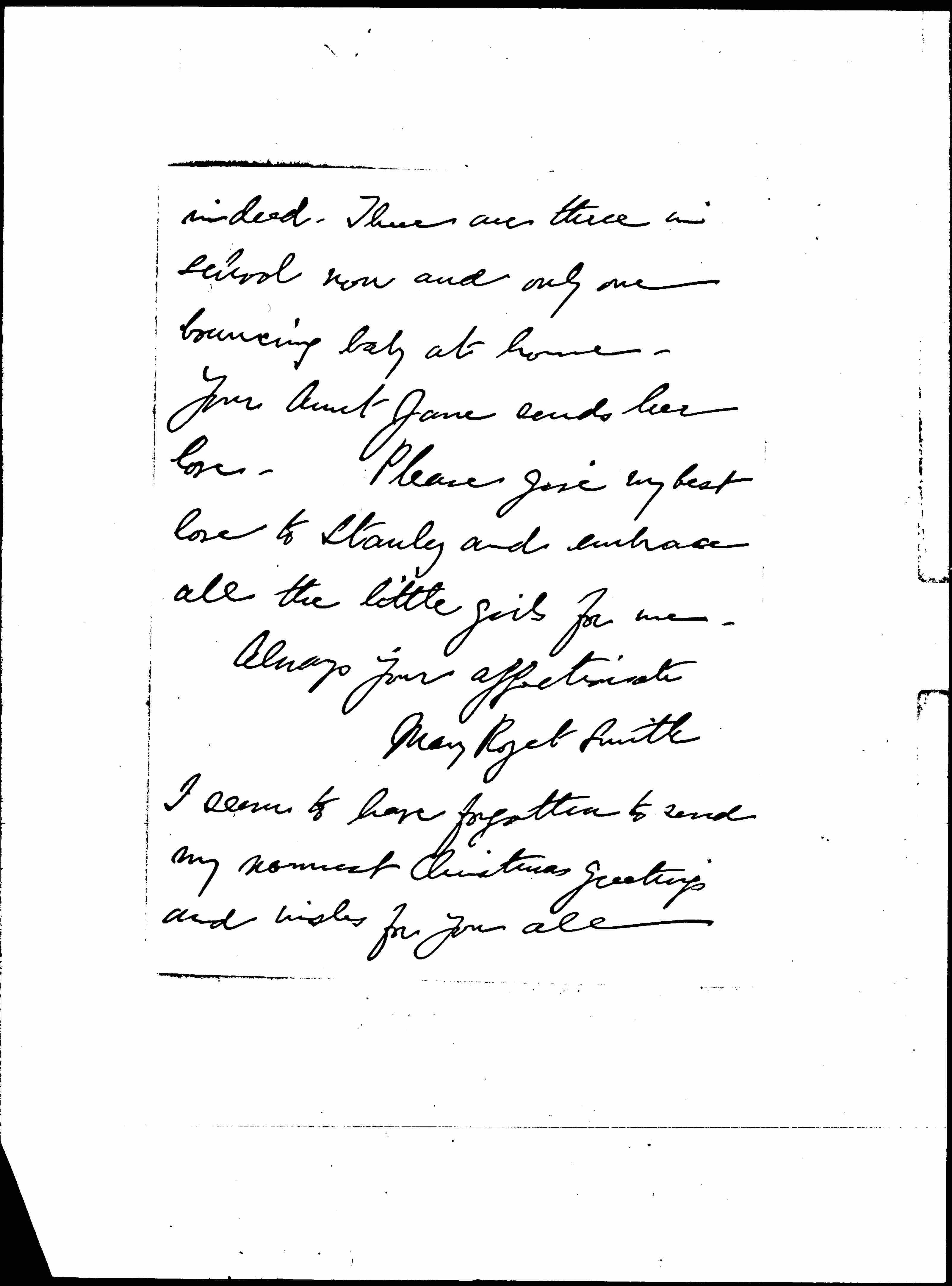 The last pictures of them are too sweet. We have all enjoyed them on your Aunt Jane's desk. Our children seem very old [page 2] indeed. There are three in school now and only one bouncing baby at home. Your Aunt Jane sends her love. Please give my best love to Stanley and embrace all the little girls for me.