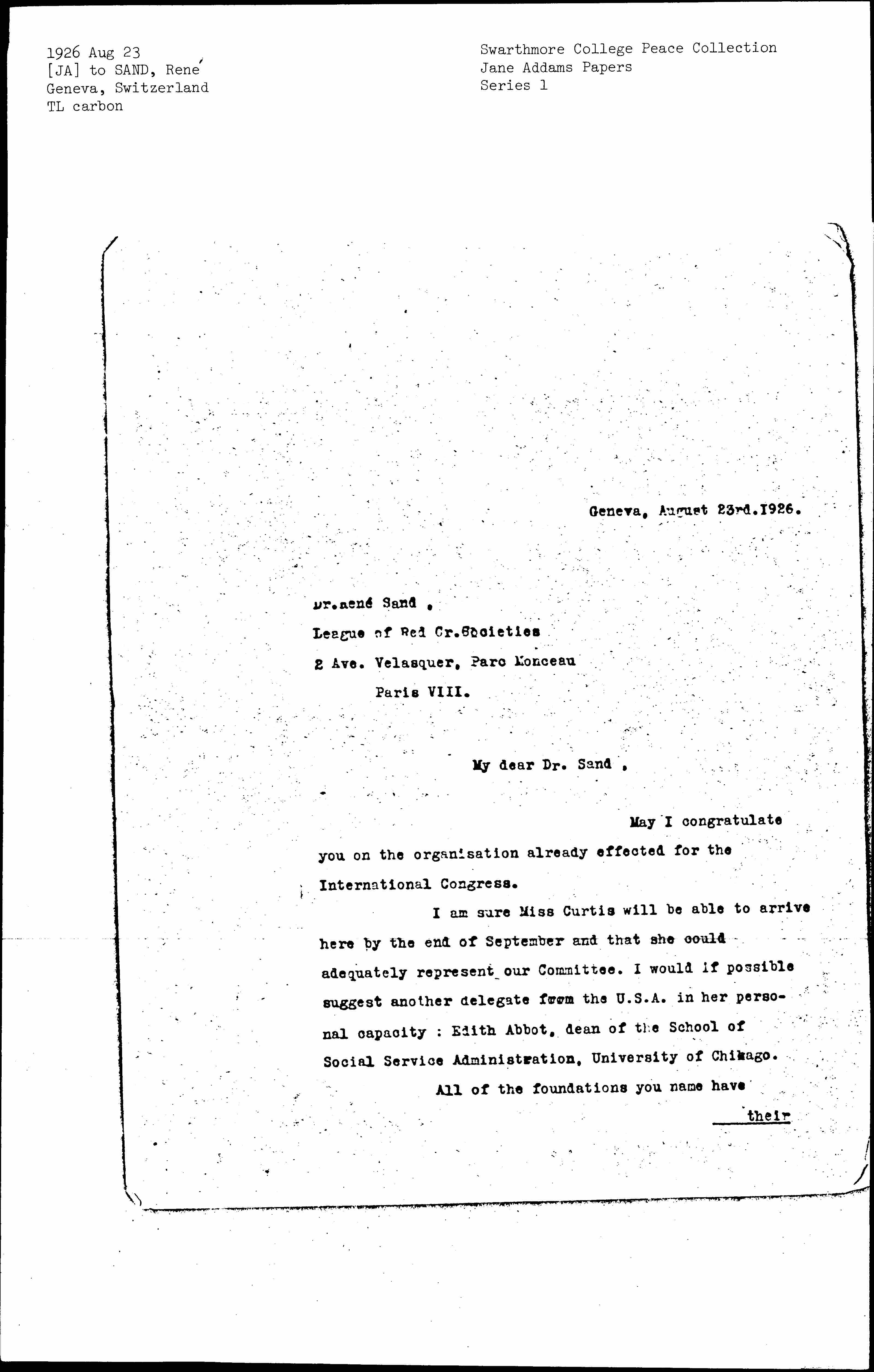 I am sure Miss Curtis will be able to arrive here by the end of September and that she could adequately represent our Committee. I would if possible suggest another delegate from the U.S.A in her personal capacity: Edith [Abbott], dean of the School of Social Service Administration, University of Chicago.