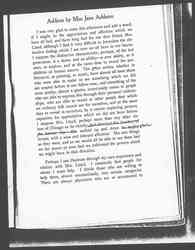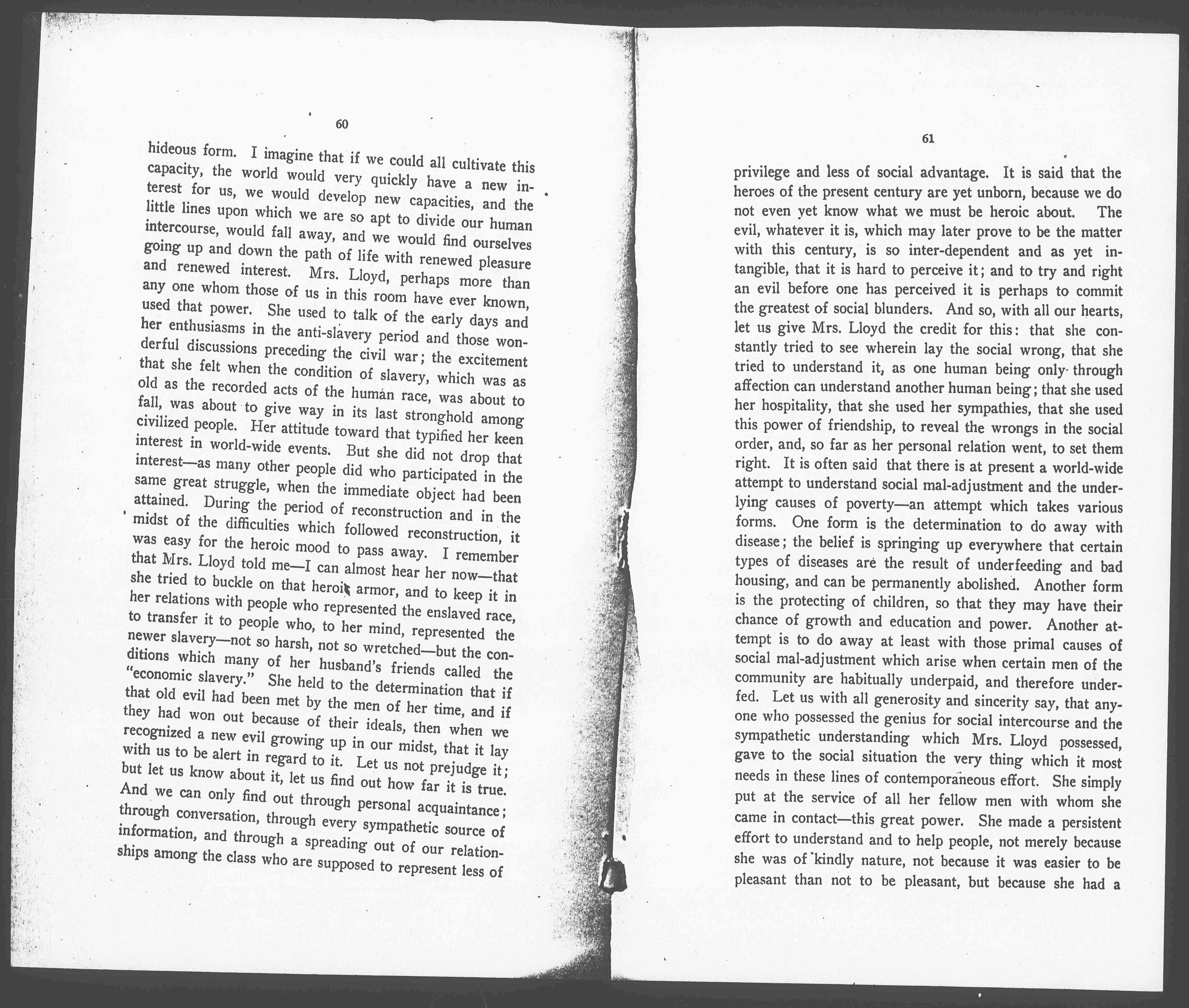 I remembered the first time she invited the girls from Marshall Field's to her house. I ask her how she came to do it. She said, quite simply, "Because I know many of the girls, having shopped at Field's for so long, and I am unwilling to buy goods from people and not establish some kind of relation with them." She had that attitude, as we know, towards all the people with whom she came in contact, and it is perhaps a new creative force in human affairs – this unwillingness to clip our relations – this determination that they shall contain within themselves all that is possible; that they shall unfold to us something of the beauty and power of human nature, even when it is housed in a narrow form, or possibly in a diseased and [page 4] hideous form. I imagine that if we could all cultivate this capacity, the world would very quickly have a new interest for us, we would developed new capacities, and the little lines upon which we are so apt to divide our human intercourse, would fall away, and we would find ourselves going up and down the path of life with renewed pleasure and renewed interests. Mrs. Lloyd, perhaps more than any one whom those of us in this room have ever known, used that power. She used to talk of the early days and her enthusiasms in the anti-slavery period and those wonderful discussions preceding the civil war; the excitement that she felt when the condition of slavery, which was as old as the recorded acts of the human race, was about to fall, was about to give way in its last stronghold among civilized people. Her attitude toward that typified her keen interest in world-wide events. But she did not drop that interest – as many other people did who participated in the same great struggle, when the immediate object had been attained. During the period of reconstruction and in the midst of the difficulties which followed reconstruction, it was easy for the heroic mood to pass away. I remember that Mrs. Lloyd told me – I can almost hear her now – that she tried to buckle on that heroic armor, and to keep it in her relations with people who represented the enslaved race, to transfer it to people who, to her mind, represented the newer slavery – not so harsh, not so wretched – but the conditions which many of her husband's friends called the "economic slavery." She held to the determination that if that old evil had been met by the men of her time, and if they had won out because of their ideals, then when we recognized a new evil growing up in our midst, that it lay with us to be alert in regard to it. Let us not prejudge it; but let us know about it, let us find out how far it is true. And we can only find out through personal acquaintance; through conversation, through every sympathetic source of information, and through a spreading out of our relationships among the class who are supposed to represent less of [page 5] privilege and less of social advantage. It is said that the heroes of the present century are yet unborn, because we do not even yet know what we must be heroic about. The evil, whatever it is, which may later prove to be the matter with this century, is so inter-dependent and as yet intangible, that it is hard to perceive it; and to try and right an evil before one has perceived it is perhaps to commit the greatest of social blunders. And so, with all our hearts, let us give Mrs. Lloyd the credit for this: that she constantly tried to see wherein lay the social wrong, that she tried to understand it, as one human being only through affection can understand another human being; that she used her hospitality, that she used her sympathies, that she used this power of friendship, to reveal the wrongs in the social order, and, so far as her personal relation went, to set them right. It is often said that there is at present a world-wide attempt to understand social mal-adjustment and the underlying causes of poverty – an attempt which take various forms. One form is the determination to do away with disease; the belief is springing up everywhere that certain types of diseases are the result of underfeeding and bad housing, and can be permanently abolished. Another form is the protecting of children, so that they may have their chance of growth and education and power. Another attempt is to do away at least with those primal causes of social mal-adjustment which arise when certain men of the community are habitually underpaid, and therefore underfed. Let us with all generosity and sincerity say, that anyone who possessed the genius for social intercourse and the sympathetic understanding which Mrs. Lloyd possessed, gave to the social situation the very thing which it most needs in these lines of contemporaneous effort. She simply put at the service of all her fellow men with whom she came in contact – this great power. She made a persistent effort to understand and to help people, not merely because she was of kindly nature, not because it was easier to be pleasant than not to be pleasant, but because she had a [page 6] conscience as to the direction in which she used this power; because she knew that this revealing capacity of hers might add something to a direct and sympathetic understanding of the situation under which we are all, at least at times, uncomfortable.