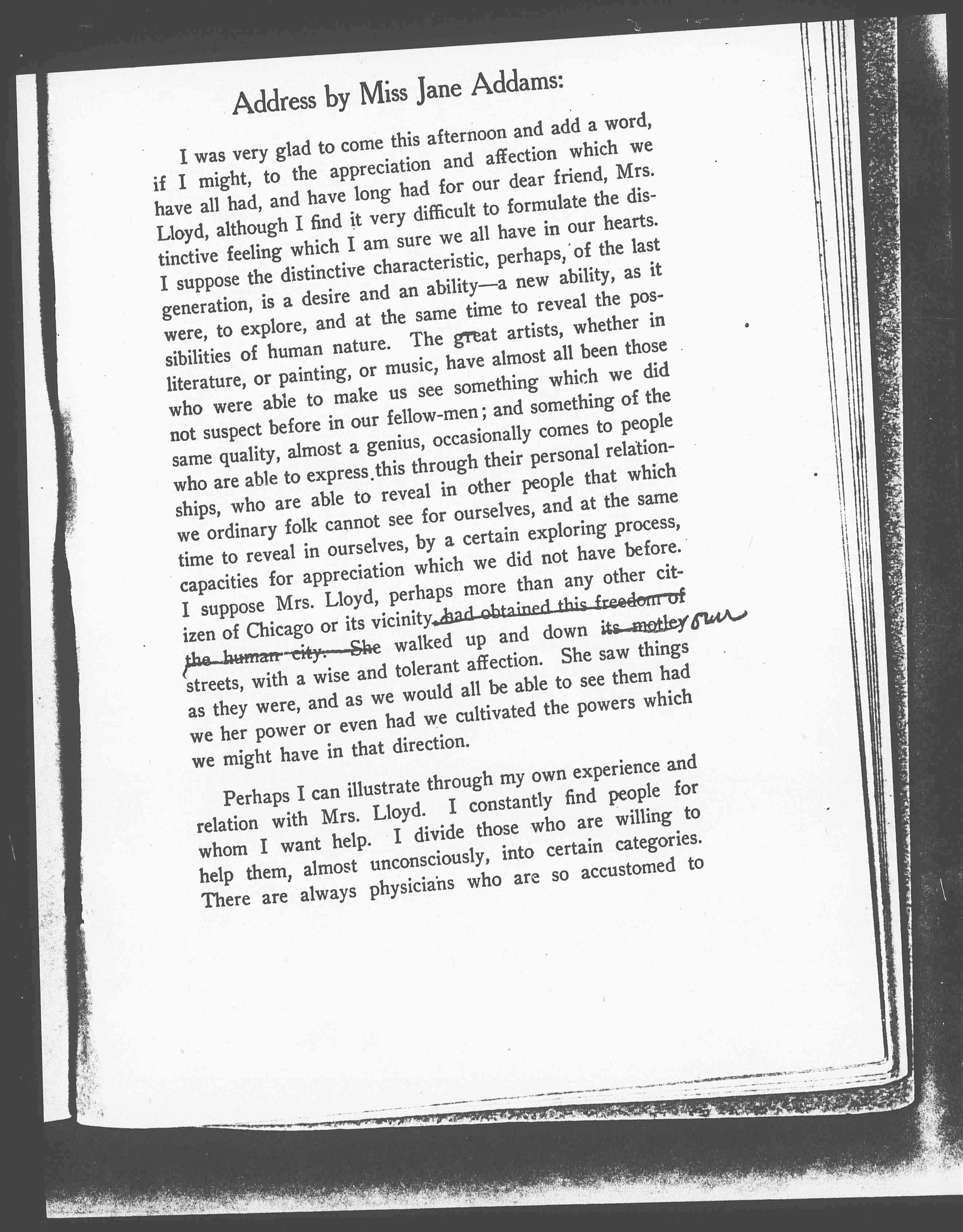 I was very glad to come this afternoon and add a word, if I might, to the appreciation and affection which we have all had, and have long had for our dear friend, Mrs. Lloyd, although I find it very difficult to formulate the distinctive feeling which I am sure we all have in our hearts. I suppose the distinctive characteristic, perhaps, of the last generation, is a desire and an ability – a new ability, as it were, to explore, and at the same time to reveal the possibilities of human nature. The great artists, whether in literature, or painting, or music, have almost all been those who were able to make us see something which we did not suspect before in our fellow-men; and something of the same quality, almost a genius, occasionally comes to people who are able to express this through their personal relationships, who are able to reveal in other people that which we ordinary folk cannot see for ourselves, and at the same time to reveal in ourselves, by a certain exploring process, capacities for appreciation which we did not have before. I suppose Mrs. Lloyd, perhaps more than any other citizen of Chicago or its vicinity, had obtained this freedom of the human city. She walked up and down its motley <our> streets, with a wise and tolerant affection. She saw things as they were, and as we would all be able to see them had we her power or even had we cultivated the powers which we might have in that direction.