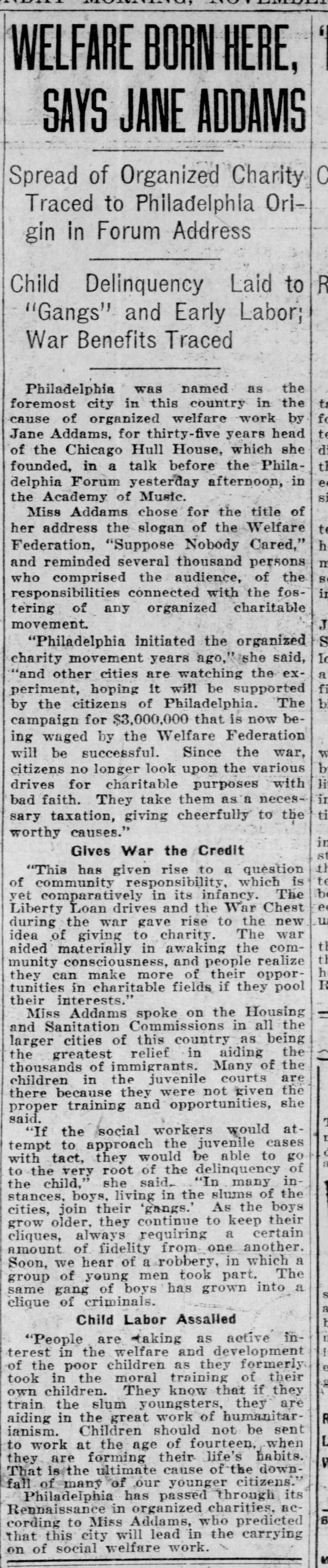 "Philadelphia initiated the organized charity movement years ago," she said, "and other cities are watching the experiment, hoping it will be supported by the citizens of Philadelphia. The campaign for $3,000,000 that is now being waged by the Welfare Federation will be successful. Since the war, citizens no longer look upon the various drives for charitable purposes with bad faith. They take them as a necessary taxation, giving cheerfully to the worthy causes."