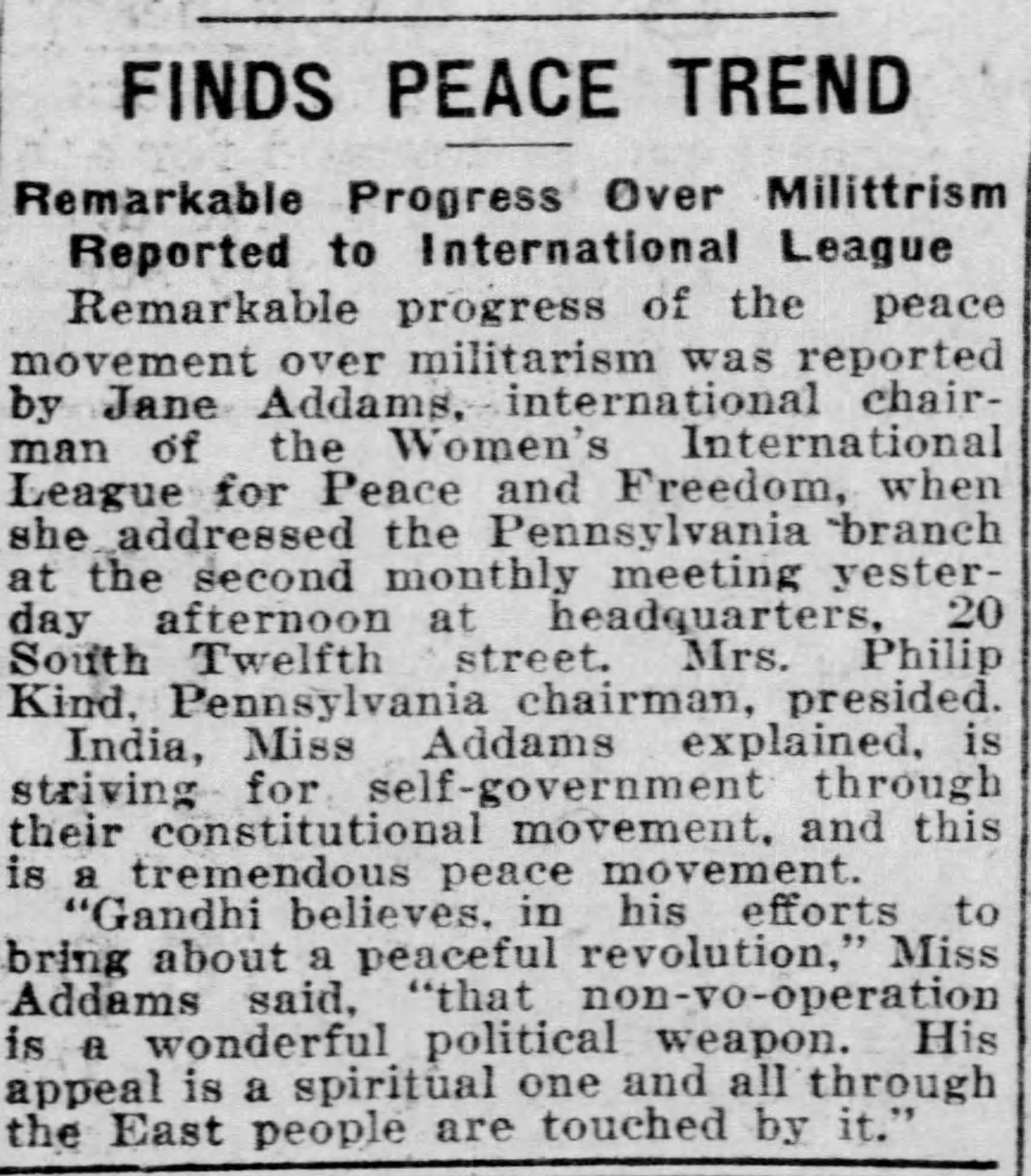 "Gandhi believes, in this efforts to bring about a peaceful revolution," Miss Addams said, "that [non-cooperation] is a wonderful political weapon. His appeal is a spiritual one and all through the East people are touched by it."