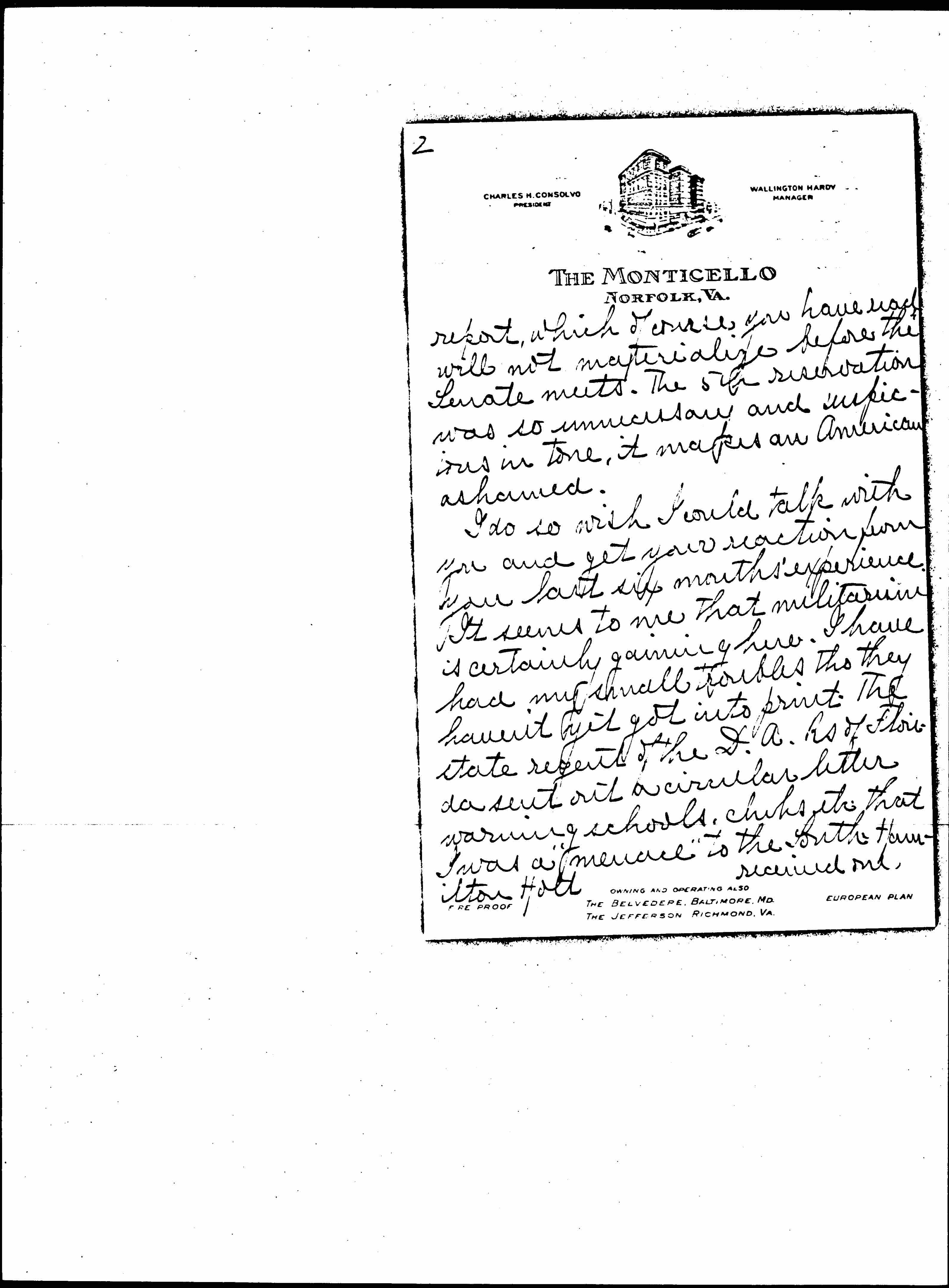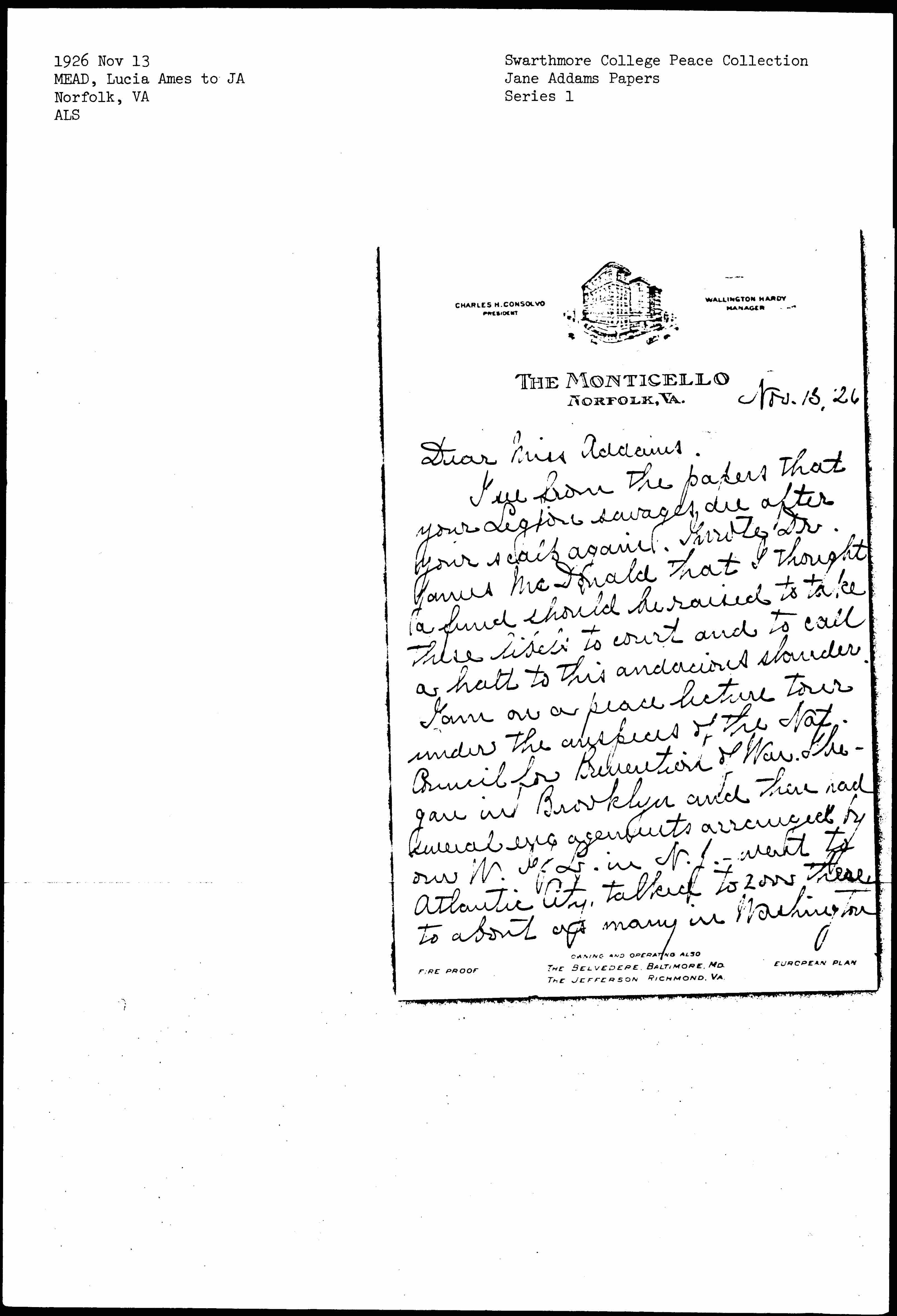I am on a peace lecture tour under the auspices of the Nat. Council for Prevention of War. [Began] in Brooklyn and then had several engagements arranged by our [W.I.L.] in N.J. -- went to Atlantic City, talked to 2000 there to about as many in Washington [page 2] then down to Richmond, Charlottesville etc. and I shall go to Atlanta. I hope to attend the Philippine Conference in Washington about Dec. 19 and perhaps Mr. Mead may come down for it. He is greatly stirred on the new policy toward the Philippines and has been writing various articles about it.
