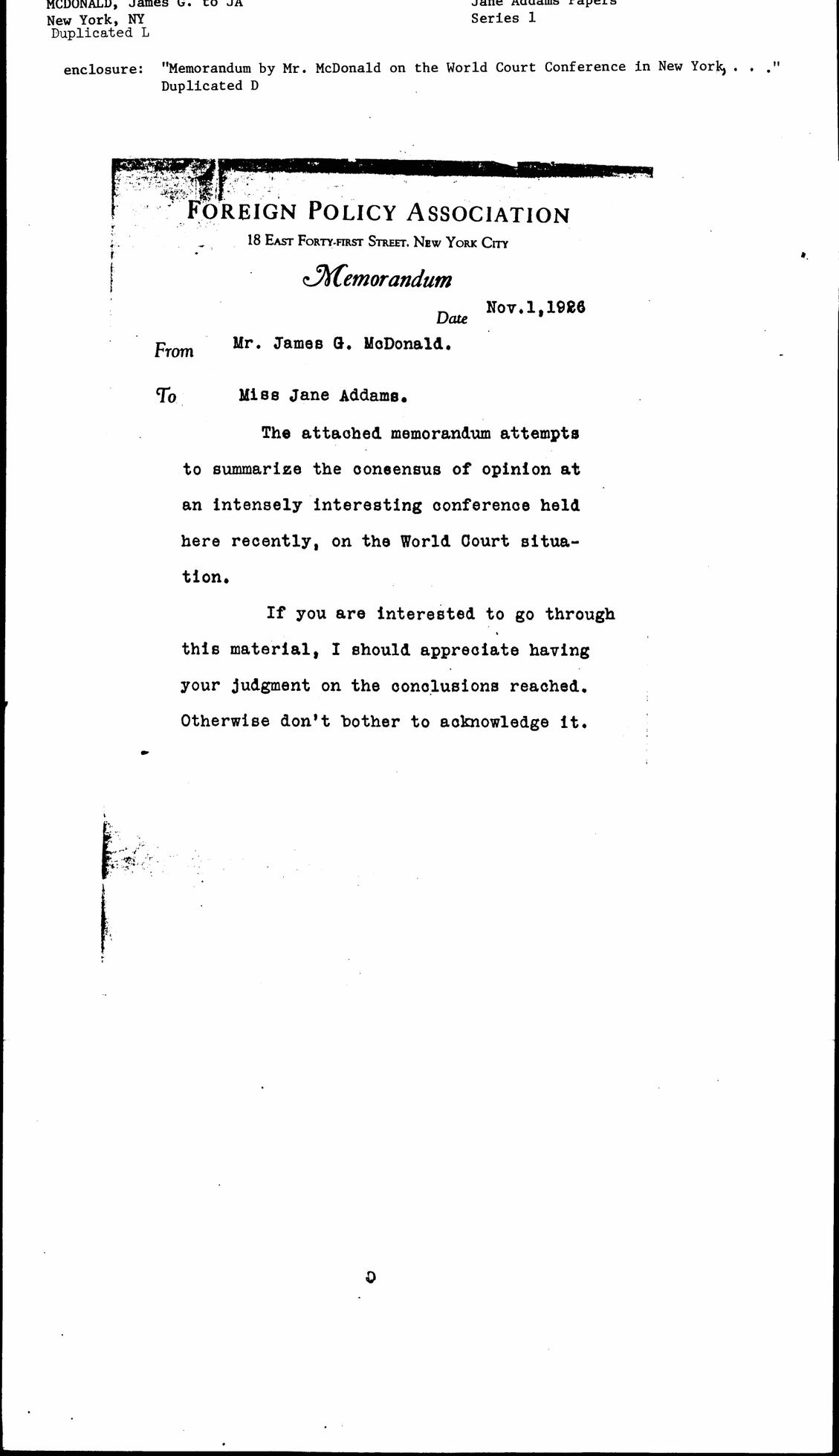 The attached memorandum attempts to summarize the consensus of opinion at an intensely interesting conference held here recently, on the World Court situation.