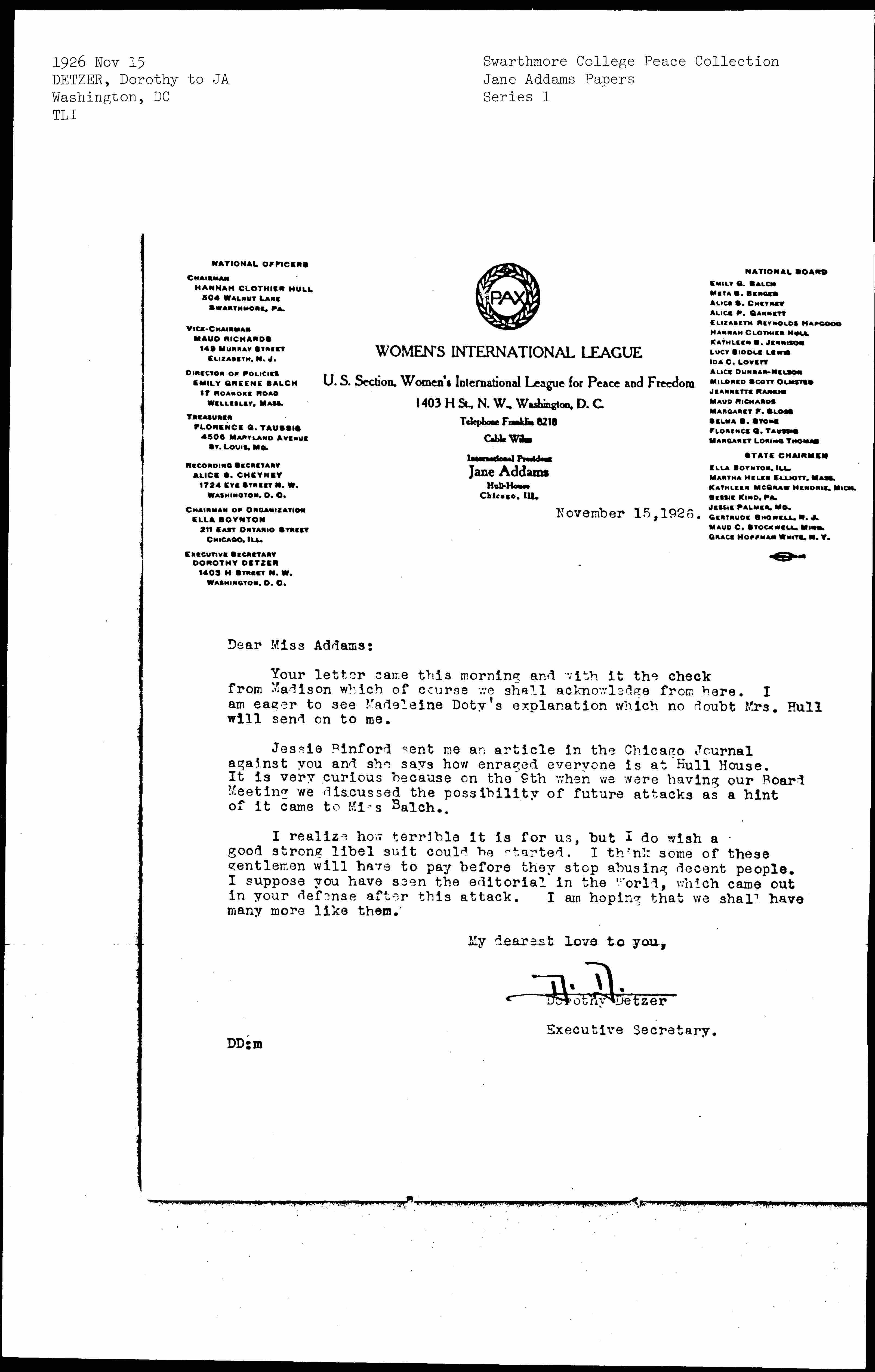 Jessie Binford sent me an article in the Chicago Journal against you and she says how enraged everyone is at Hull House. It is very curious because on the 9th when we were having our Board Meeting we discussed the possibility of future attacks as a hint of it came to Miss Balch.