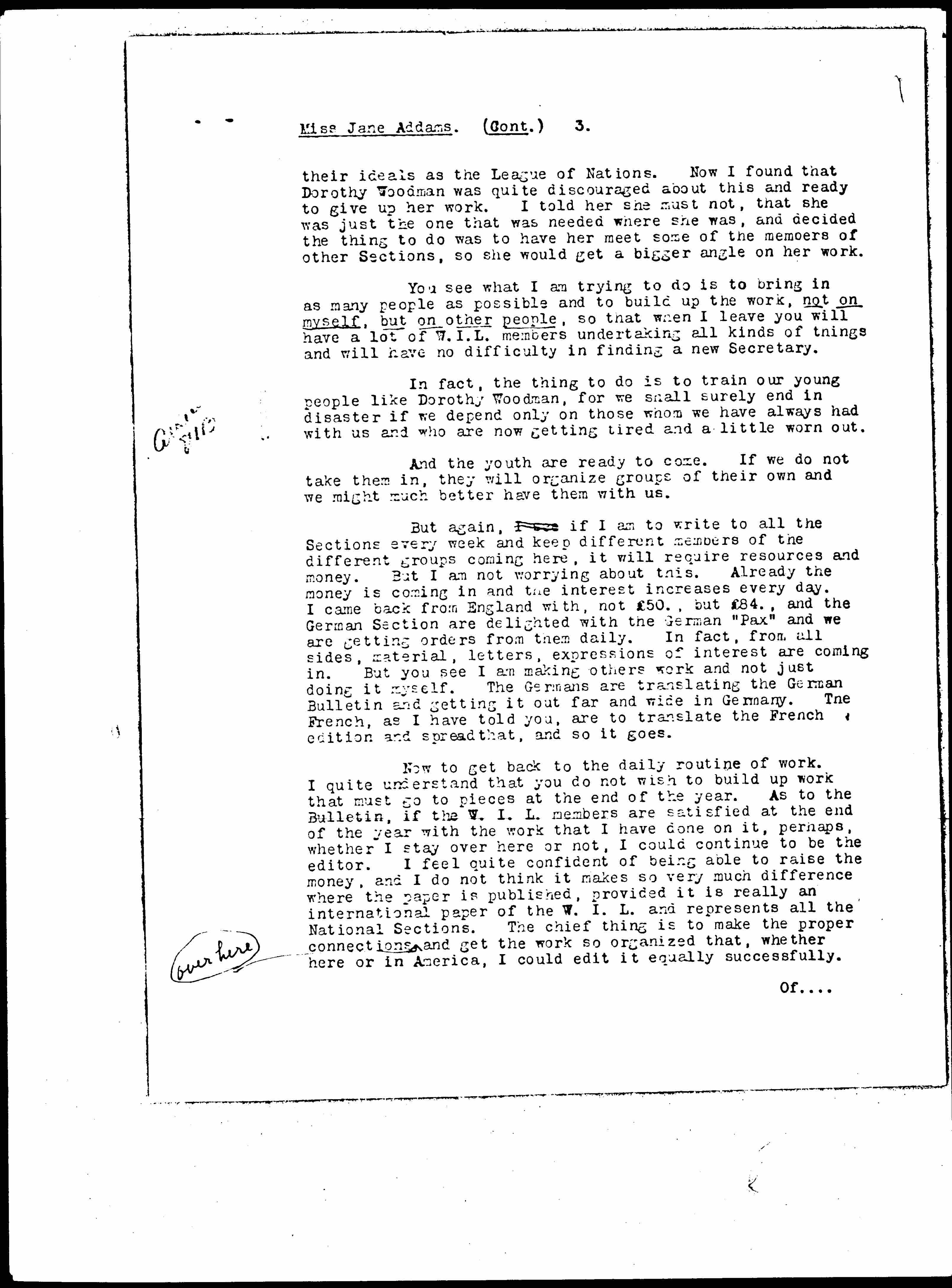Now to get back to the daily routine of work. I quite understand that you do not wish to build up work that must go to pieces at the end of the year. As to the Bulletin, if the W.I.L. members are satisfied at the end of the year with the work that I have done on it, perhaps whether I stay over here or not, I could continue to be the editor. I feel quite confident of being able to raise the money, and I do not think it makes so very much difference where the paper is published, provided it is really an international paper of the W.I.L. and represents all the National Sections. The chief thing is to make the proper connections ↑over here↓ and get the work so organized that, whether here or in America, I could edit it equally successfully. [page 4]