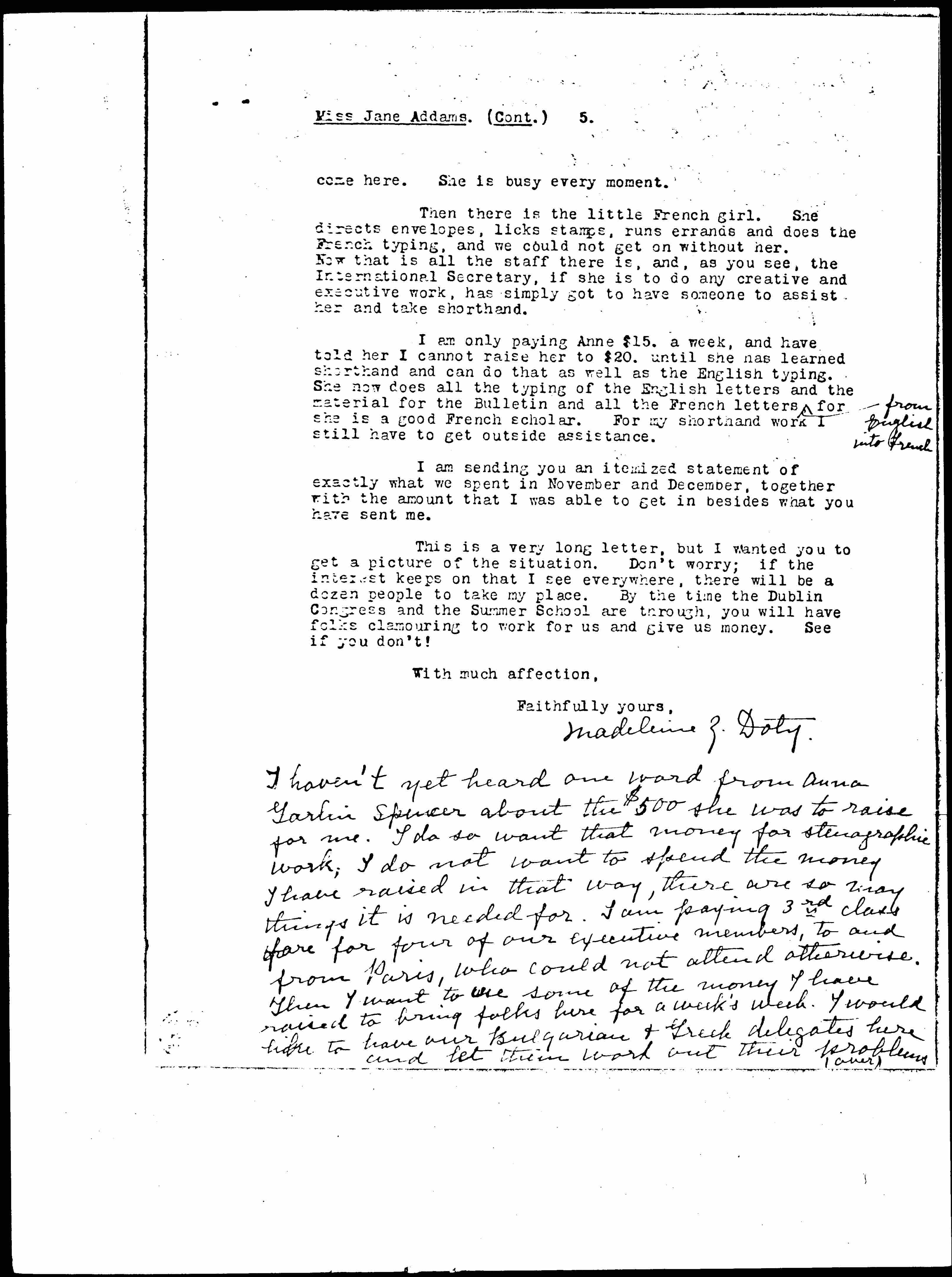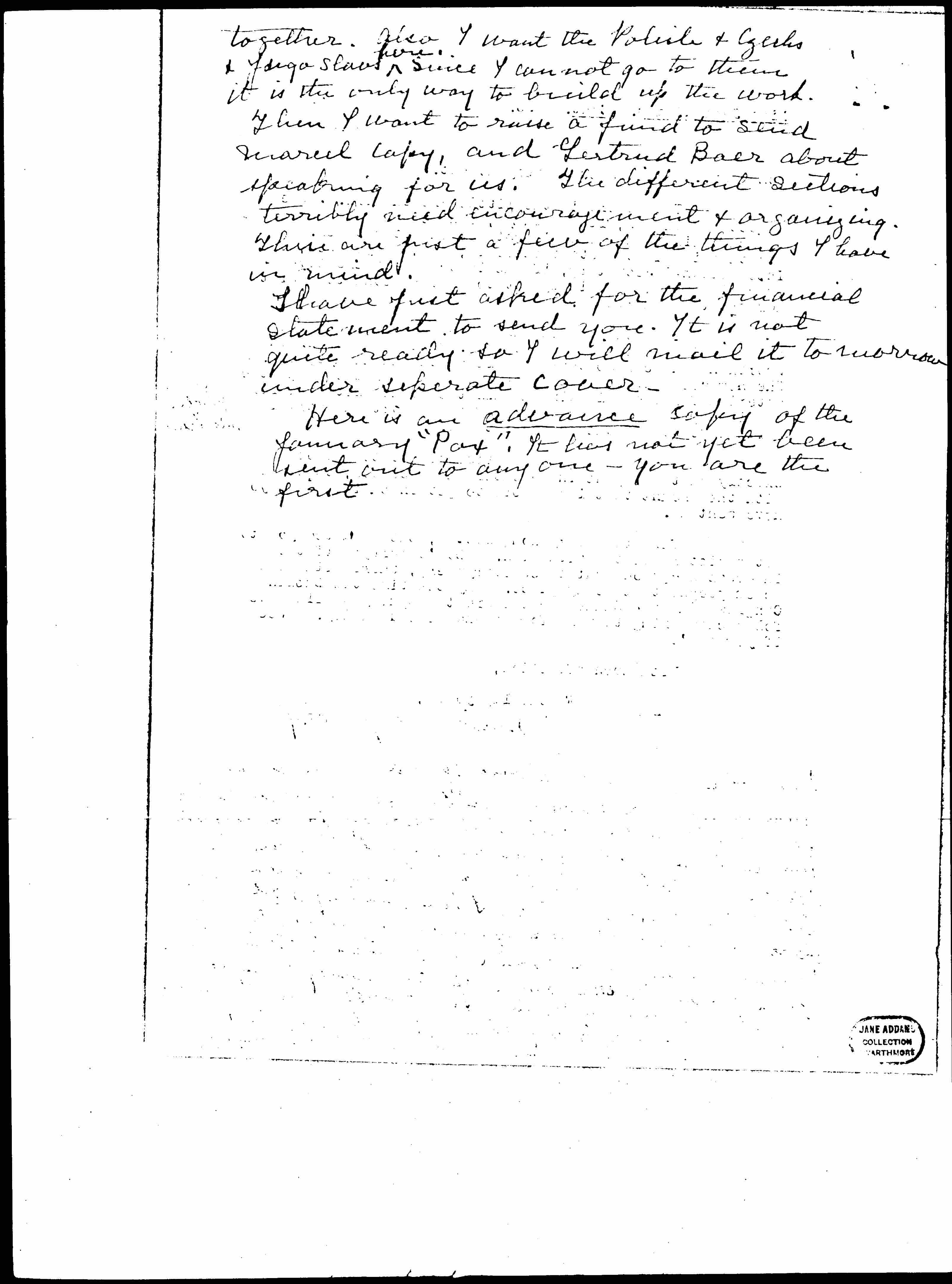 ↑I haven't yet heard our ward from Anna Garlin Spencer about the $500 she was to raise for me. I do so want that money for stenographic work, I do not want to spend the money I have raised in that way, there are so many things it is needed for. I am paying 3rd class fare for four of our executive members, to and from Paris, who could not attend otherwise. Then I want to see some of the money I have raised to bring folks here for a week's [work]. I would like to have our Bulgarian & Greek delegates here and let them work out their problems [page 6] together. Also I want the Polish & Czechs & Yugoslavs ↑here.↓ Since I cannot go to there it is the only way to build up the work. Then I want to raise a fund to send [Marcelle] Capy, and Gertrud Baer about speaking for us. The different sections terribly need encouragement & organizing. These are just a few of the things I have in mind.