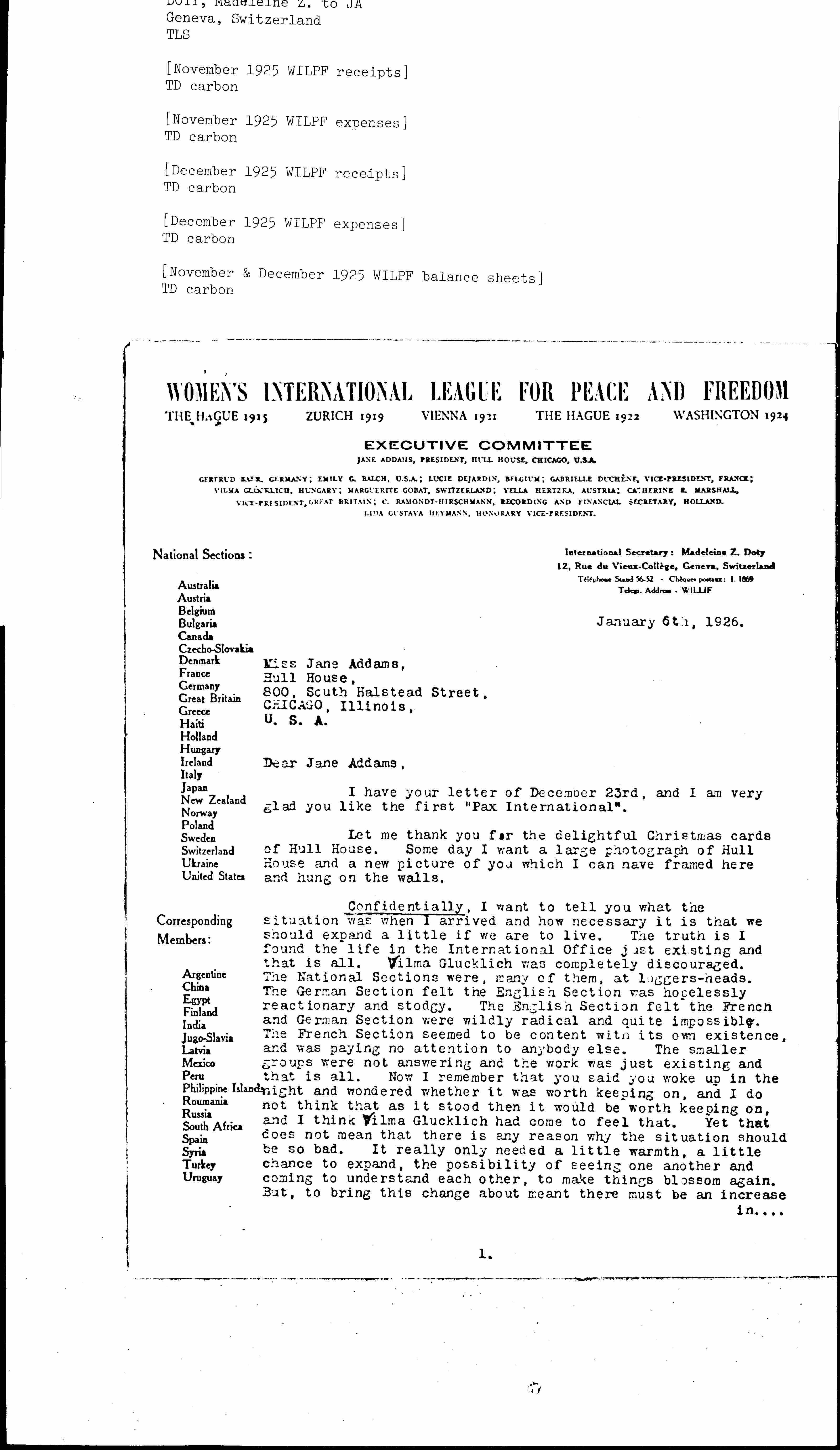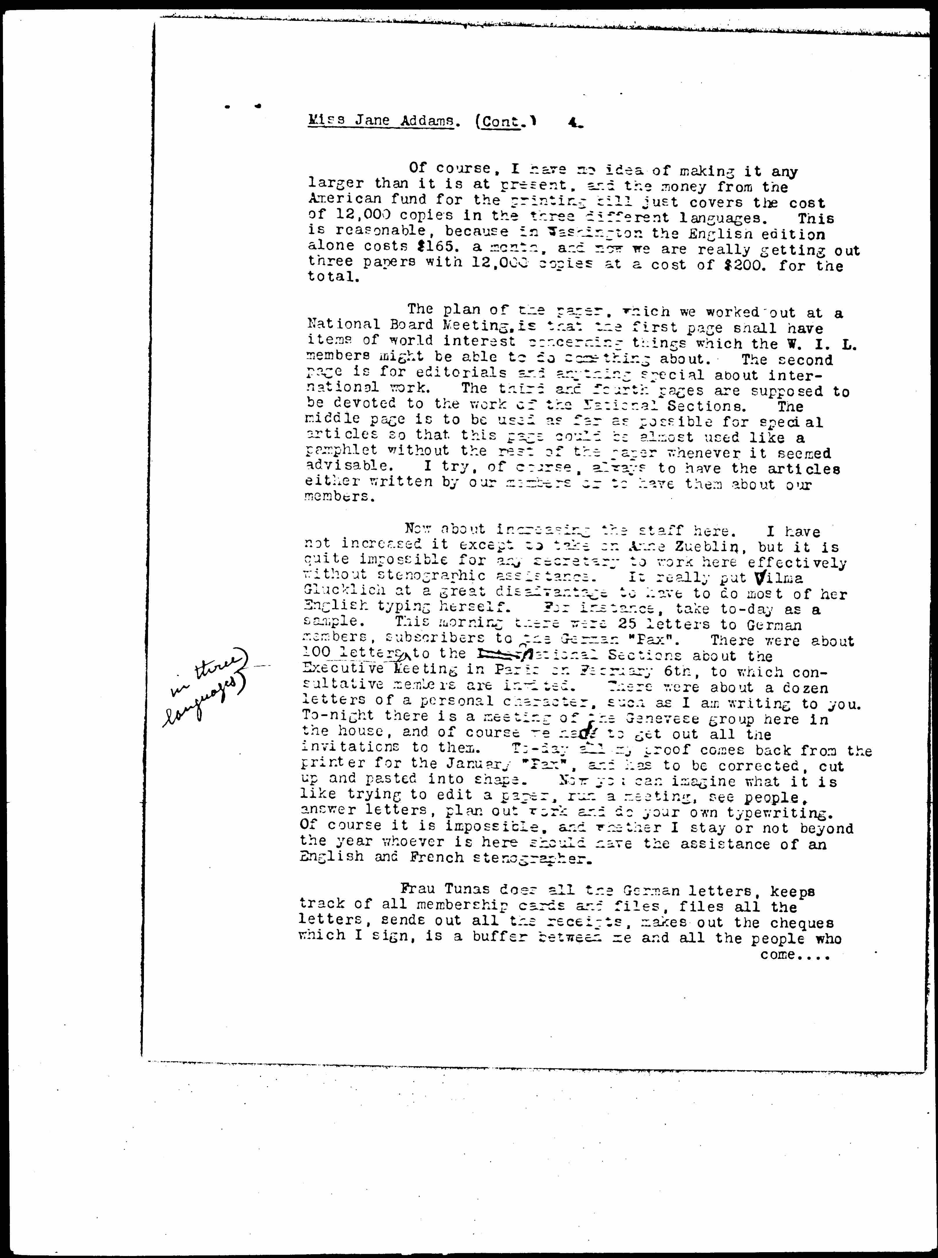 Now about increasing the staff here. I have not increased it except to take on Anne Zueblin, but it is quite impossible for any secretary to work here effectively without stenographic assistance. It really put Vilma Glücklich at a great disadvantage to have to do most of her English typing herself. For instance, take [today] as a sample. This morning there were 25 letters to German members, subscribers to the German "Pax." There were about 100 letters ↑in three languages↓ to the InterNational Sections about the Executive Meeting in Paris on February 6th, to which consultative members are invited. There were about a dozen letters of a personal character, such as I am writing to you. [Tonight] there is a meeting of the Genevese group here in the house, and of course we need to get out all the invitations to them. [Today] all my proof comes back from the printer for the January "Pax," and has to be corrected, cut up and pasted into shape. Now you can imagine what it is like trying to edit a paper, run a meeting, see people, answer letters, plan out work and do your own typewriting. Of course it is impossible, and whether I stay or not beyond the year whoever is here should have the assistance of an English and French stenographer.
