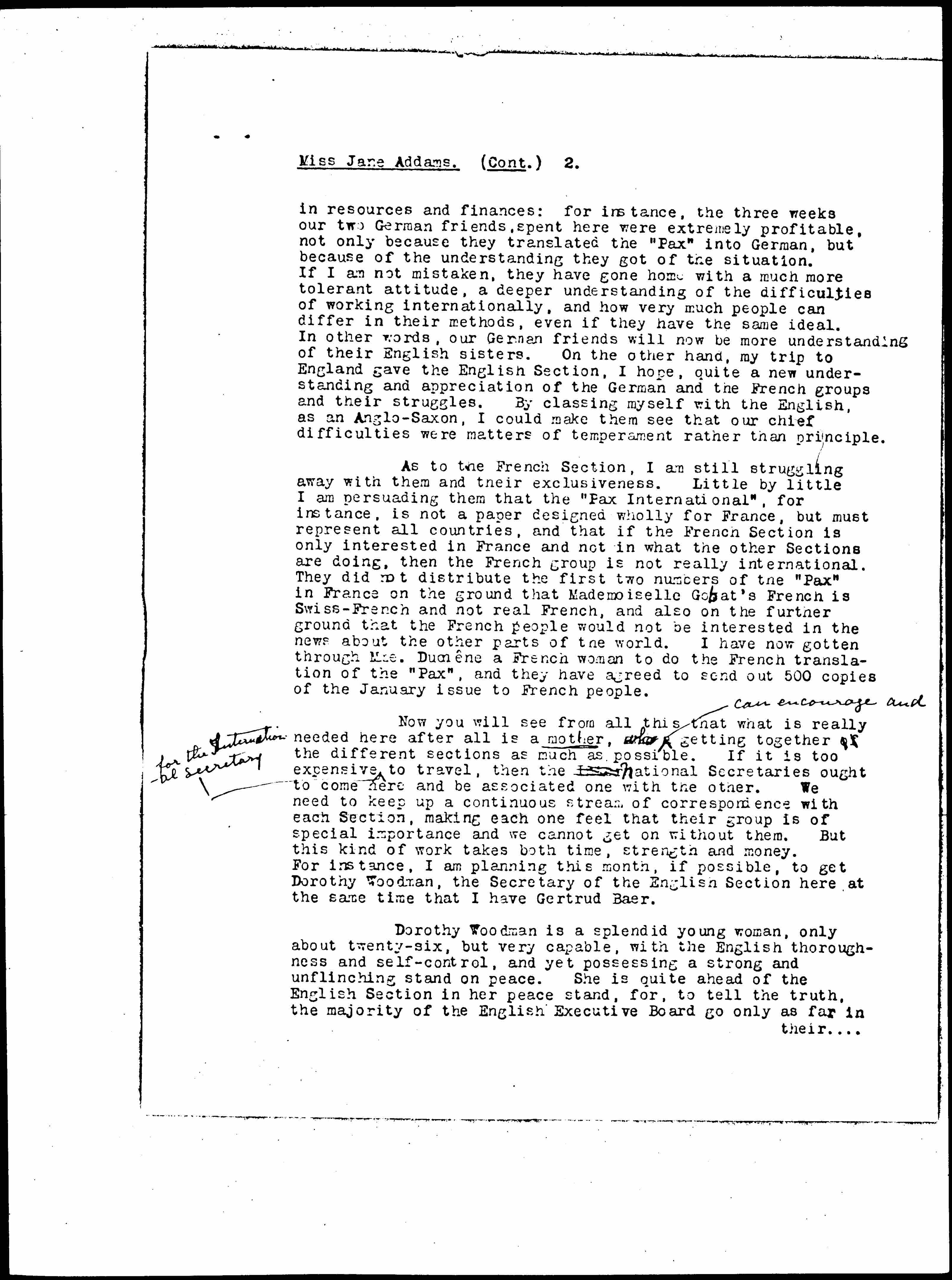 Confidentially, I want to tell you what the situation was when I arrived and how necessary it is that we should expand a little if we are to live. The truth is I found the life in the International Office just existing and that is all. Vilma Glücklich was completely discouraged. The National Sections were, many of them, at [loggerheads]. The German Section felt the English Section was hopelessly reactionary and stodgy. The English Section felt the French and German Section were wildly radical and quite impossible. The French Section seemed to be content with its own existence, and was paying no attention to anybody else. The smaller groups were not answering and the work was just existing and that is all. Now I remember that you said you woke up in the night and wondered whether it was worth keeping on, and I do not think that as it stood then it would be worth keeping on, and I think Vilma Glücklich had come to feel that. Yet that does not mean that there is any reason why the situation should be so bad. It really only needed a little warmth, a little chance to expand, the possibility of seeing one another and coming to understand each other, to make things blossom again. But, to bring this change about meant there must be an increase [page 2] in resources and finances: for instance, the three weeks our two German friends spent here were extremely profitable, not only because they translated "Pax" into German, but because of the understanding they got of the situation. If I am not mistaken, they have gone home with a much more tolerant attitude, a deeper understanding of the difficulties of working internationally, and how very much people can differ in their methods, even if they have the same ideal. In other words, our German friends will now be more understanding of their English sisters. On the other hand, my trip to England gave the English Section, I hope, quite a new understanding and appreciation of the German and the French groups and their struggles. By classing myself with the English, as an Anglo-Saxon, I could make them see that our chief difficulties were matters of temperament rather than principle.
