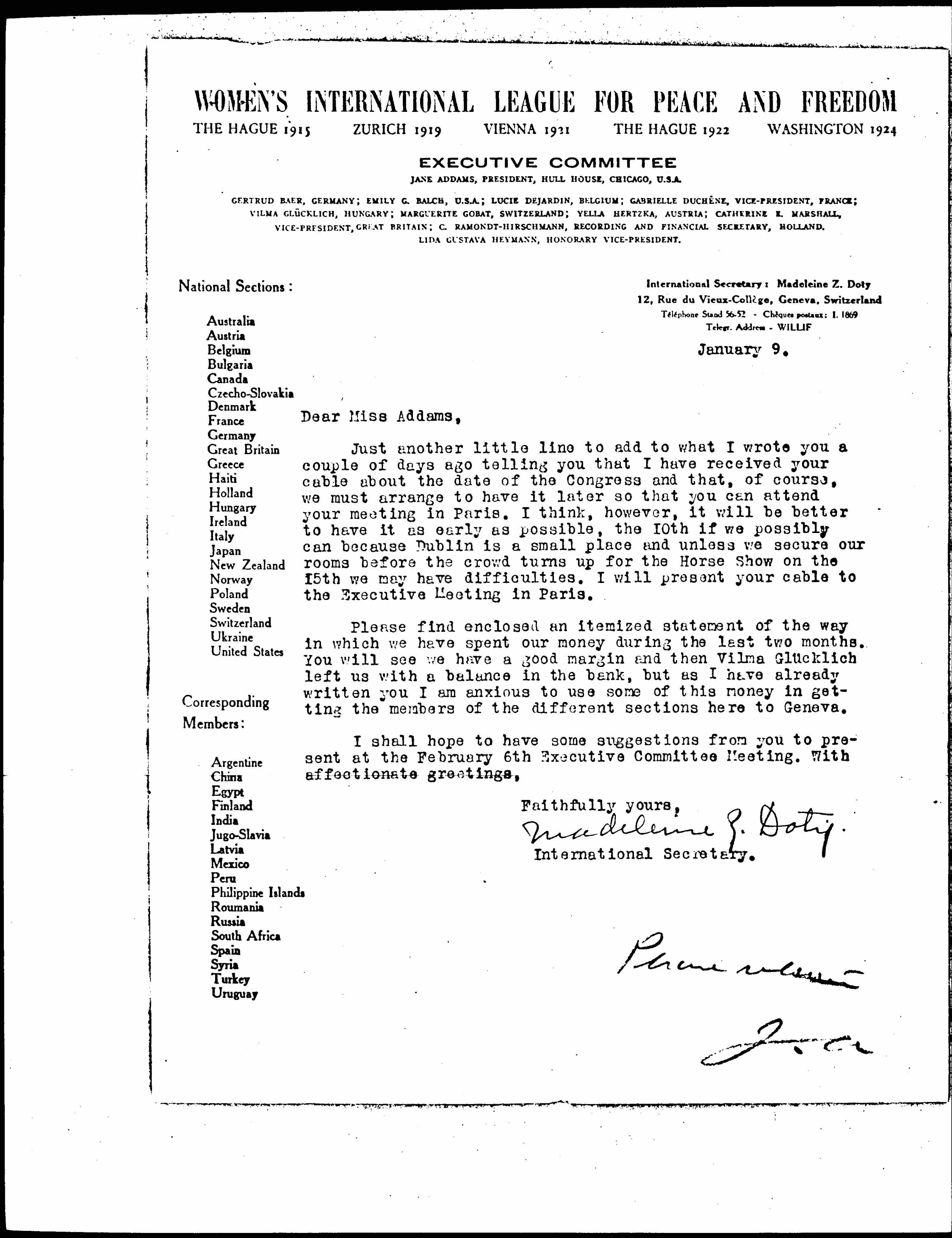Please find enclosed an itemized statement of the way in which we have spent our money during the last two months. You will see we have a good margin and then Vilma Glücklich left us with a balance in the bank, but as I have already written you I am anxious to use some of this money in getting the members of the different sections here to Geneva.