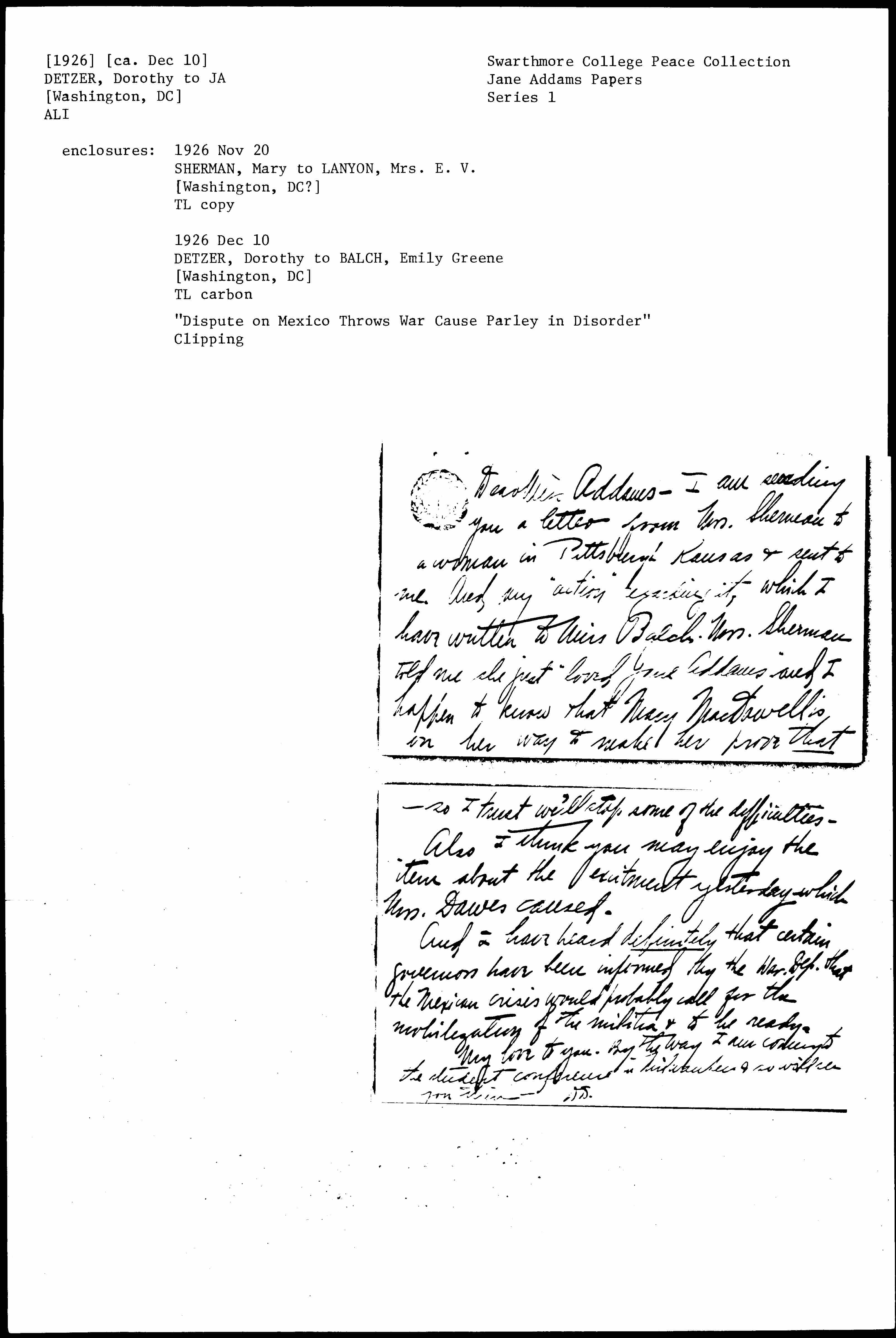 Dear Miss Addams -- I am sending you a letter from Mrs. Sherman to a woman in [Pittsburg] Kansas & sent to me. And my "action" regarding it, which I have written to Miss Balch. Mrs. Sherman told me she just "loved Jane Addams" and I happen to know that Mary [McDowell] is on her way to make her prove that [page 2] -- so I trust we'll stop some of the difficulties.