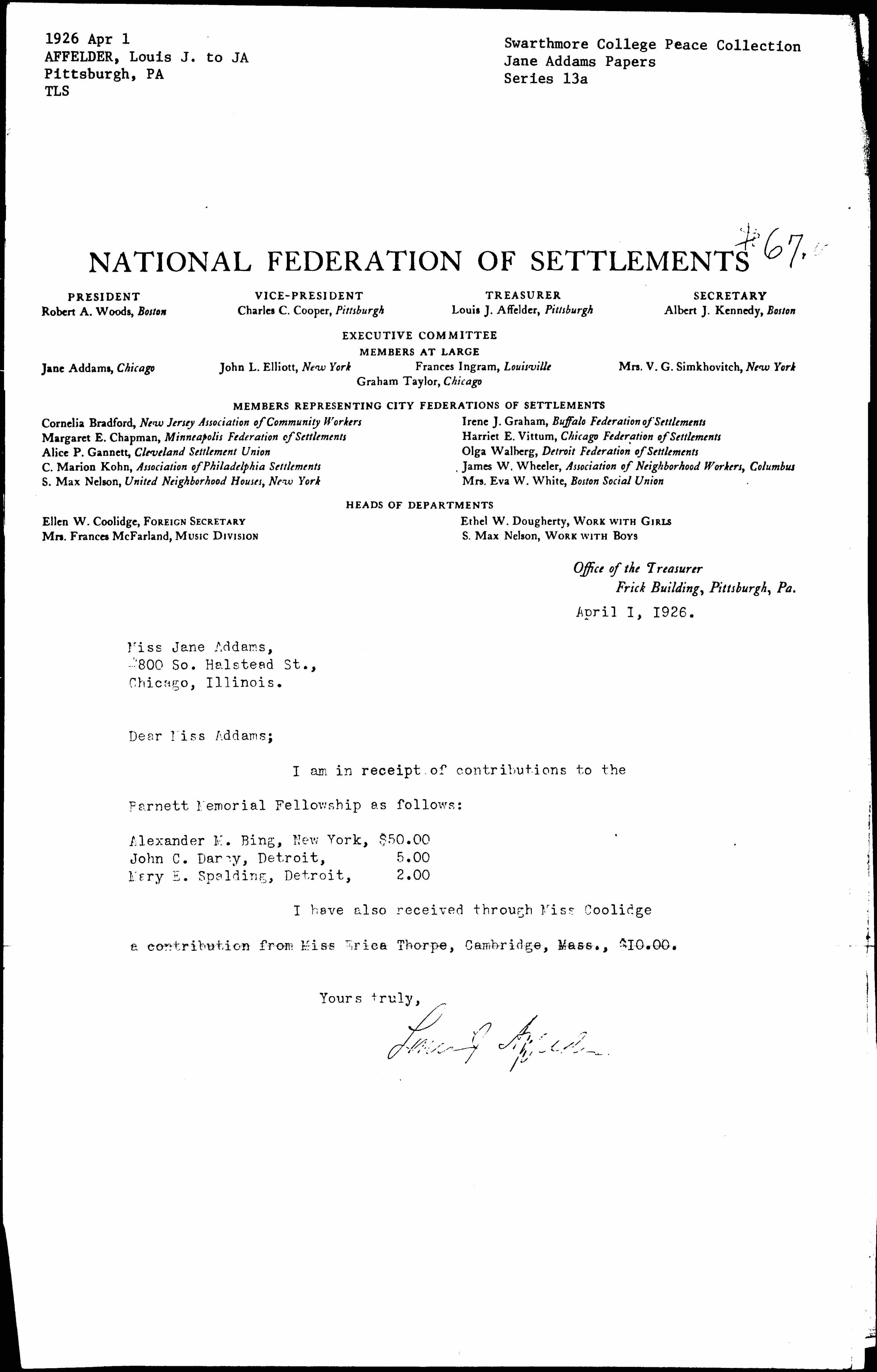 I have also received through Miss Coolidge a contribution from Miss Erica [Thorp], Cambridge, Mass., $10.00.