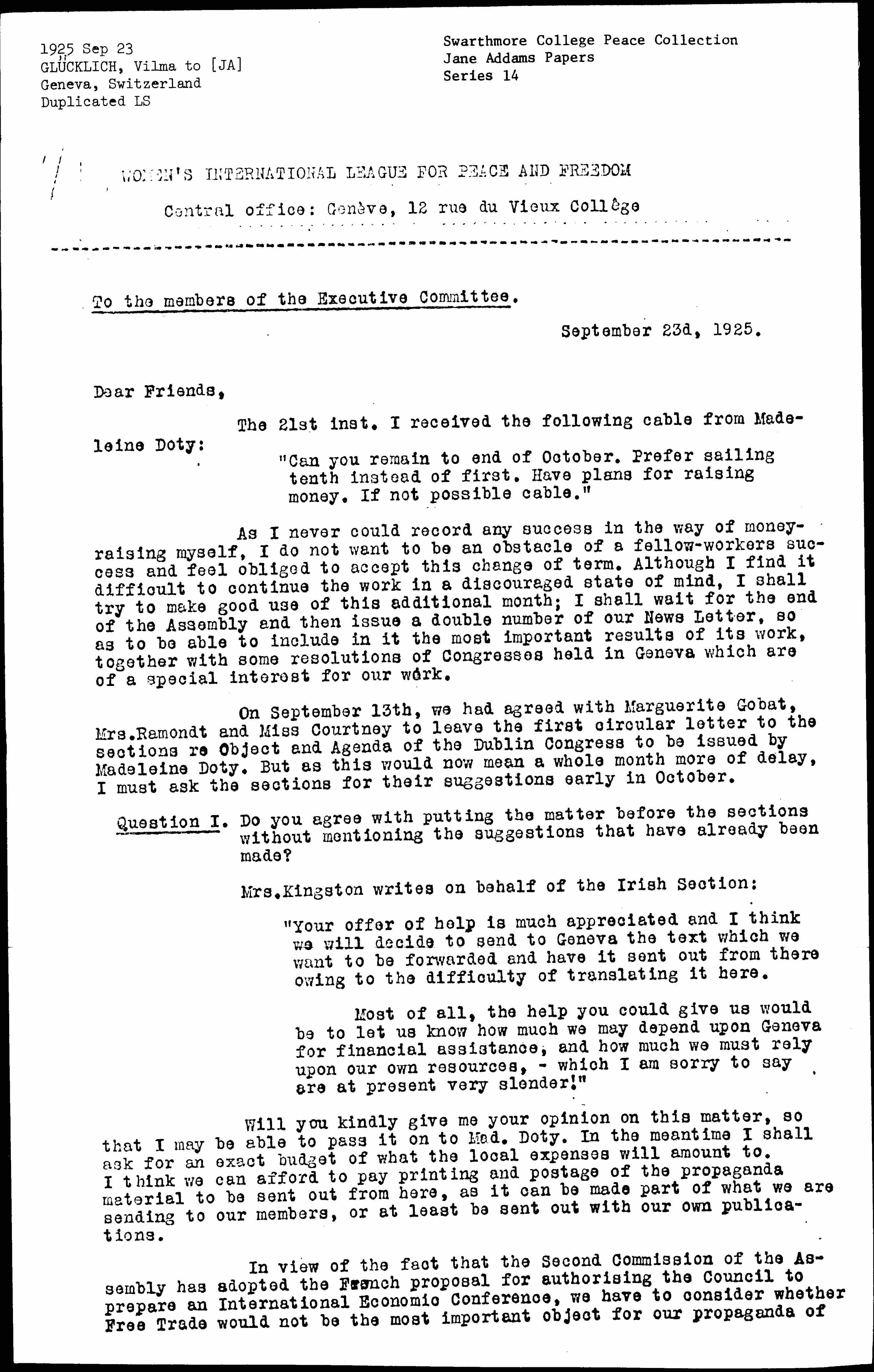 On September 13th, we had agreed with Marguerite Gobat, Mrs. Ramondt and Miss Courtney to leave the first circular letter to the sections re Object and Agenda of the Dublin Congress to be issued by Madeleine Doty. But as this would now mean a whole month more of delay, I must ask the sections for their suggestions early in October.