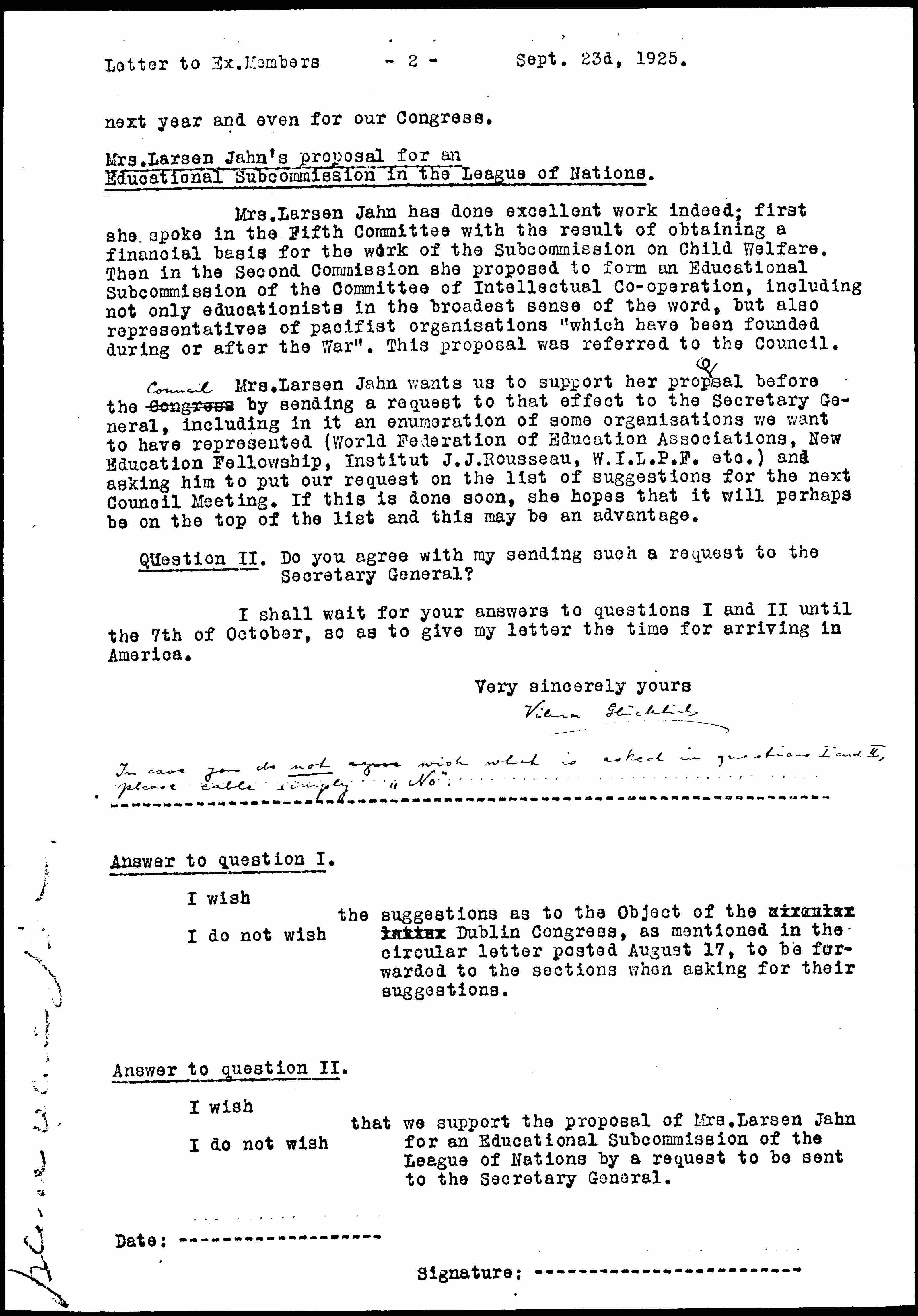 Mrs. Larsen Jahn wants us to support her proposal before the Congress ↑Council↓ by sending a request to that effort to the Secretary General, including in it an enumeration of some [organizations] we want to have represented (World Federation of Education Associations, New Education Fellowship, Institut J. J. Rousseau, W.I.L.P.F. etc.) and asking him to put our request on the list of suggestions for the next Council Meeting. If this is done soon, she hopes that it will perhaps be on the top of the list and this may be an advantage.