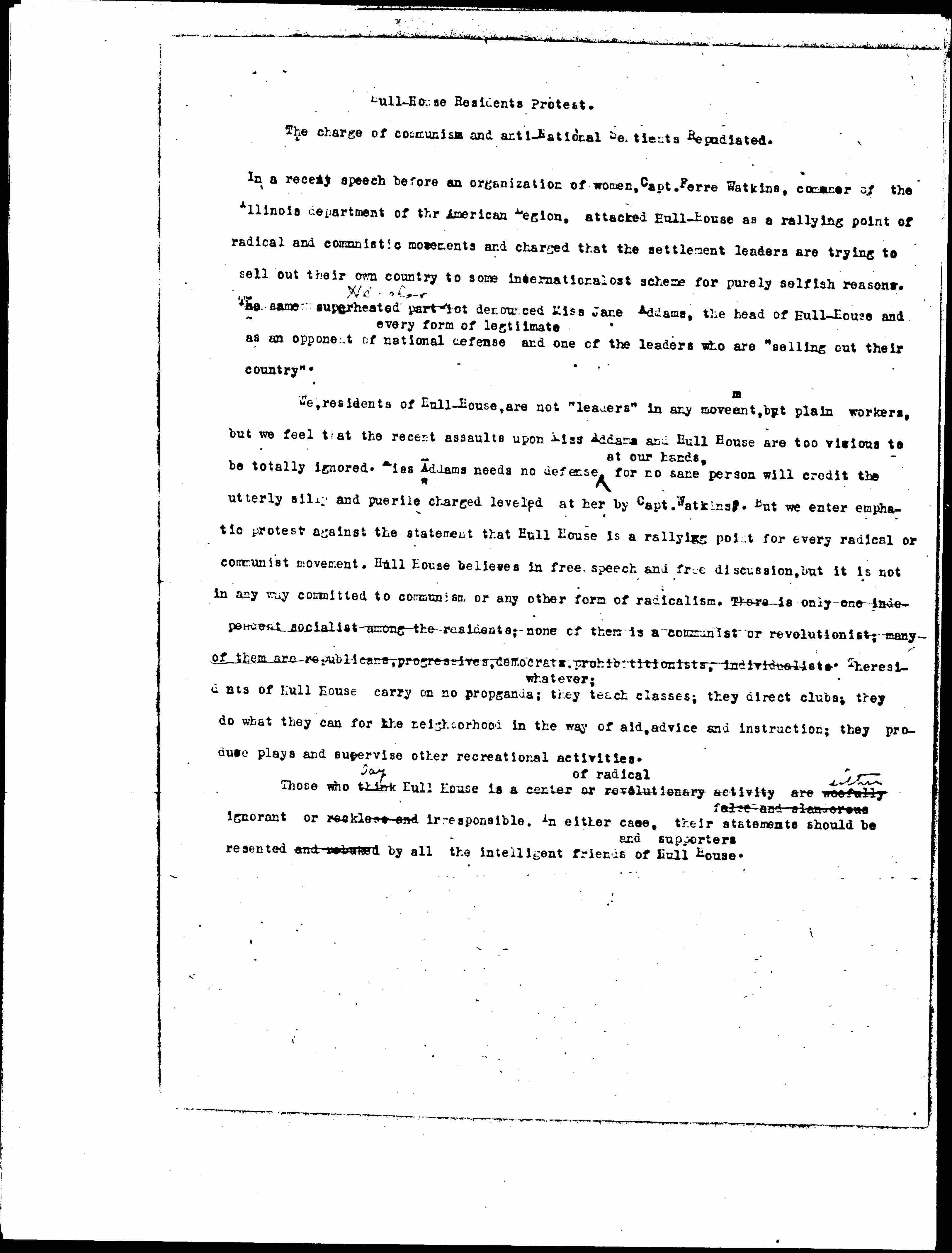In a recent speech before an organization of women, Capt. Ferre Watkins, [commander] of the Illinois department of the American Legion, attacked Hull-House as a rallying point of radical and communistic movements and charged that the settlement leaders are trying to sell out their own country to some internationalist scheme for purely selfish reasons. The same superheated part [illegible] ↑He also↓ denounced Miss Jane Addams, the head of Hull-House and as an opponent of ↑every form of legitimate↓ national defense and one of the leaders who are "selling out their country."