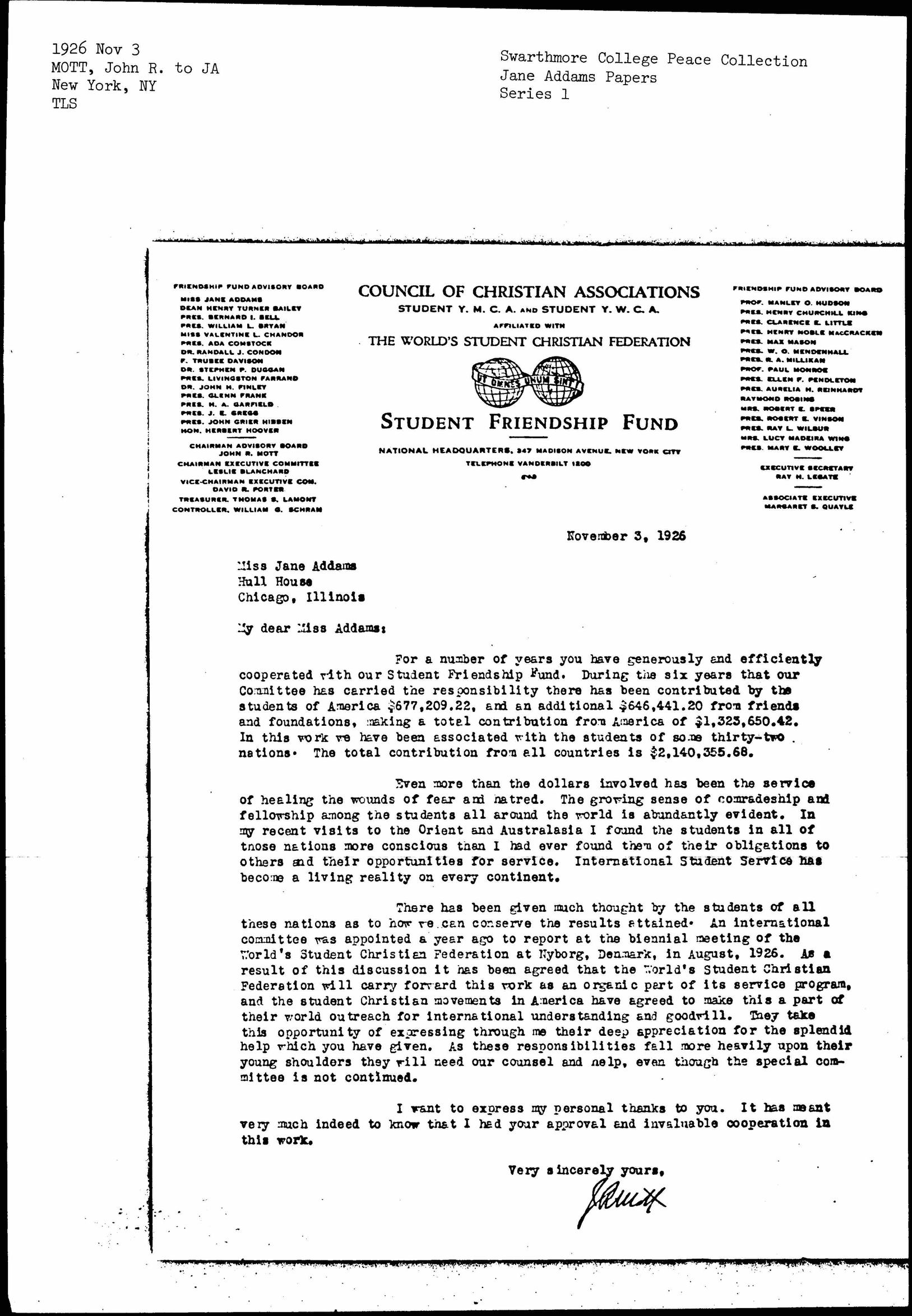 For a number of years you have generously and efficiently cooperated with our Student Friendship Fund. During the six years that our Committee has carried the responsibility there has been contributed by the students of America $677,209.22, and an additional $646,441.20 from friends and foundations, making a total contribution from America of $1,323,650.42. In this work we have been associated with the students of some thirty-two nations. The total contribution from all countries is $2,140,355.68.