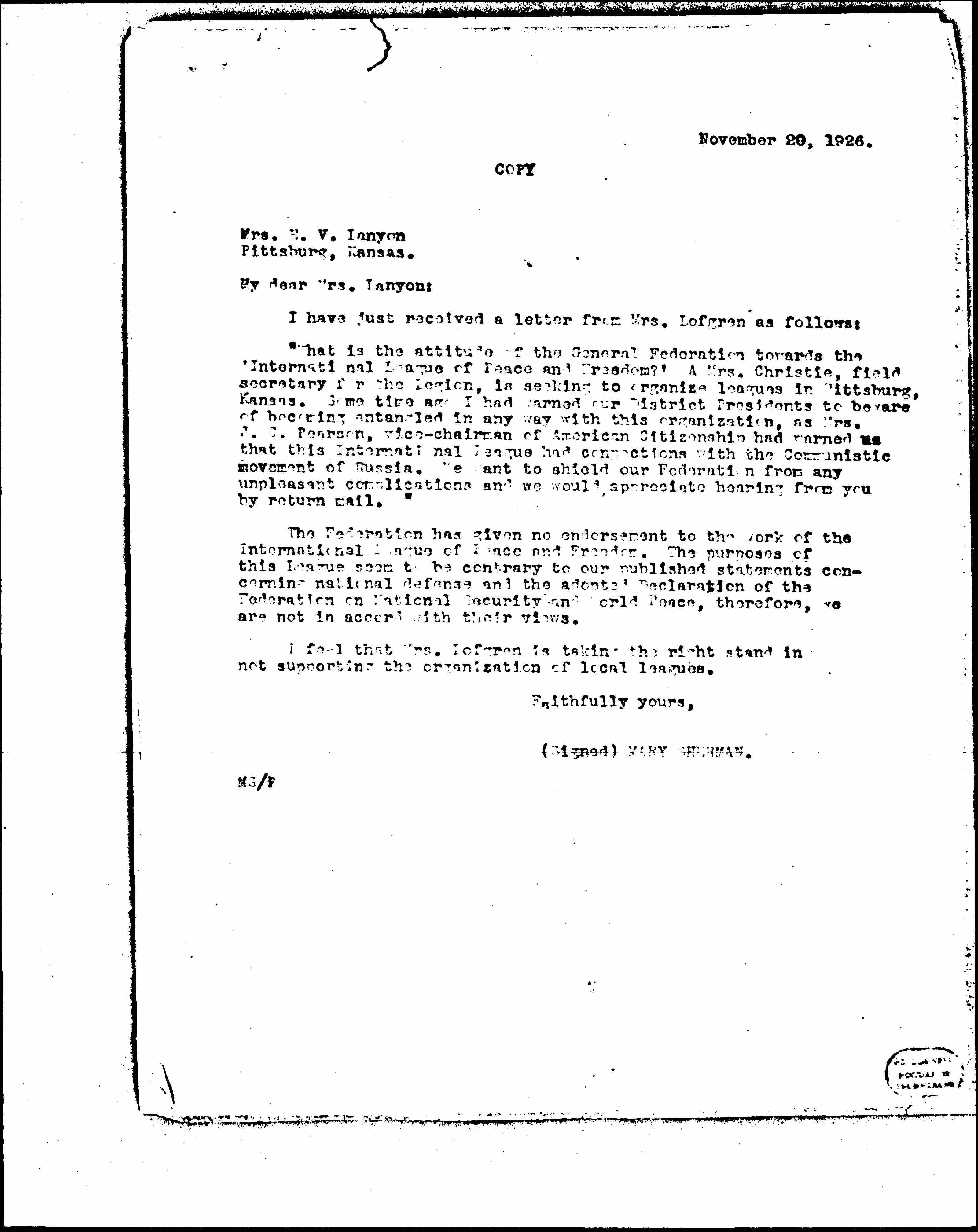 "What is the attitude of the General Federation towards the 'International League of Peace and Freedom?' A Mrs. [Christy], field secretary for the Legion, is seeking to organize leagues in Pittsburg, Kansas. Some time ago I had warned our District Presidents to beware of becoming entangled in any way with this organization, as Mrs. J. C. Pearson, vice-chairman of American Citizenship had warned us that this International League had connections with the Communistic movement of Russia. We want to shield our Federation from any unpleasant complications and we would appreciate hearing from you by return mail."
