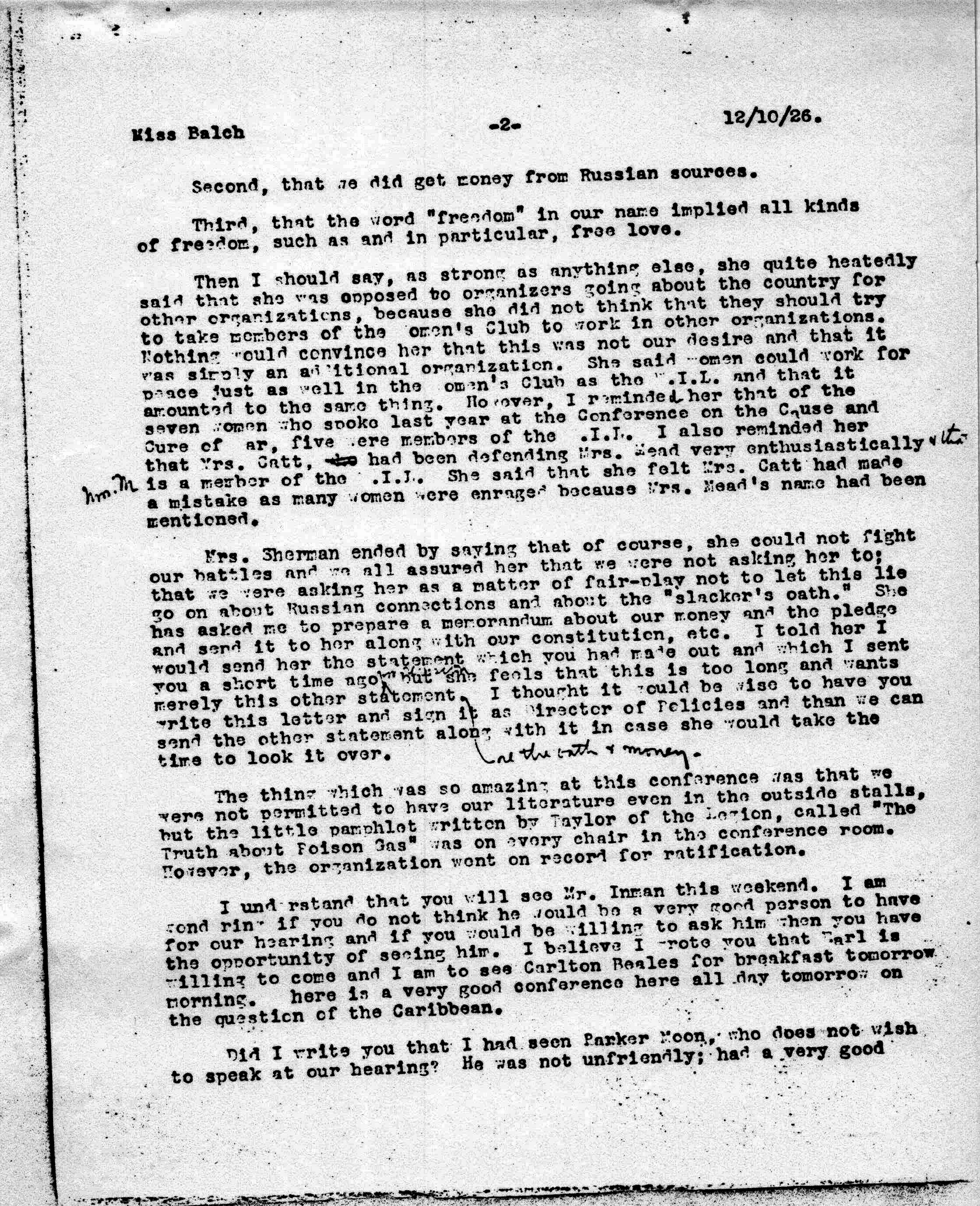 Then I should say, as strong as anything else, she quite heatedly said that she was opposed to organizers going about the country for other organizations, because she did not think that they should try to take members of the Women's Club to work in other organizations. Nothing would convince her that this was not our desire and that it was simply an additional organization. She said women could work for peace just as well in the Women's Club as the W.I.L. and that it amounted to the same thing. However, I reminded her that of the seven women who spoke last year at the Conference on the Cause and Cure of War, five were members of the [W.I.L.] I also reminded her that Mrs. Catt, who had been defending Mrs. Mead very enthusiastically ↑& that Mrs. M↓ is a member of the [W.I.L.] She said that she felt Mrs. Catt had made a mistake as many women were enraged because Mrs. Mead's name had been mentioned.